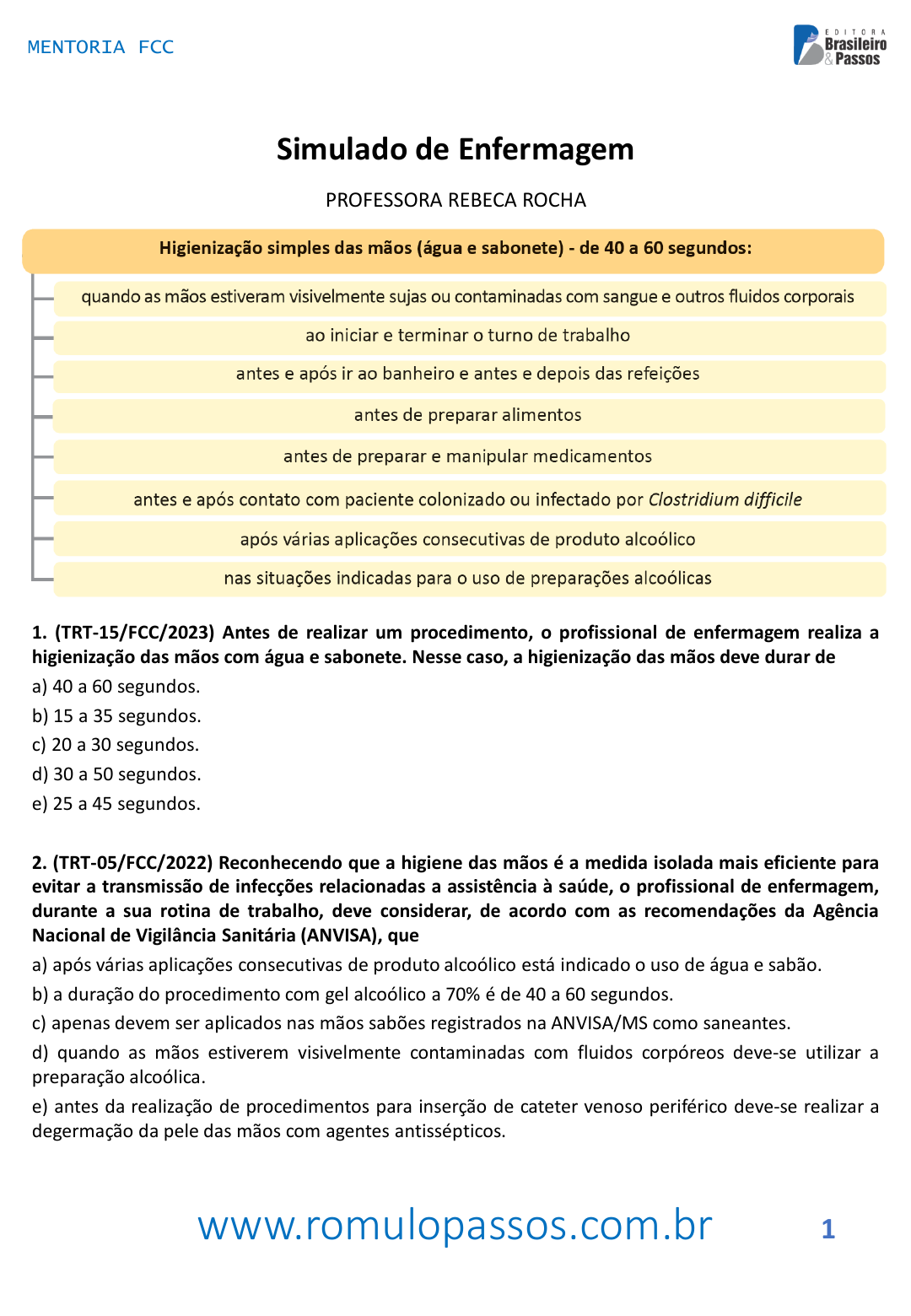 www.romulopassos.com.br MENTORIA FCC 1 Simulado de Enfermagem PROFESSORA REBECA ROCHA 1. (TRT-15/FCC/2023) Antes de realizar um procedimento, o profissional de enfermagem realiza a higienização das mãos com água e sabonete. Nesse caso, a higienização das mãos deve durar de a) 40 a 60 segundos. b) 15 a 35 segundos. c) 20 a 30 segundos. d) 30 a 50 segundos. e) 25 a 45 segundos. 2. (TRT-05/FCC/2022) Reconhecendo que a higiene das mãos é a medida isolada mais eficiente para evitar a transmissão de infecções relacionadas a assistência à saúde, o profissional de enfermagem, durante a sua rotina de trabalho, deve considerar, de acordo com as recomendações da Agência Nacional de Vigilância Sanitária (ANVISA), que a) após várias aplicações consecutivas de produto alcoólico está indicado o uso de água e sabão. b) a duração do procedimento com gel alcoólico a 70% é de 40 a 60 segundos. c) apenas devem ser aplicados nas mãos sabões registrados na ANVISA/MS como saneantes. d) quando as mãos estiverem visivelmente contaminadas com fluidos corpóreos deve-se utilizar a preparação alcoólica. e) antes da realização de procedimentos para inserção de cateter venoso periférico deve-se realizar a degermação da pele das mãos com agentes antissépticos. Karina Rocha Santos - 48275823862 www.romulopassos.com.br MENTORIA FCC 2 3. (TRT-05/FCC/2022) Ao realizar a punção venosa periférica, visando a prevenção de infecção relacionada a assistência à saúde, o técnico de enfermagem deve considerar que a) o tempo de aplicação da clorexidina 0,5% na fricção da pele é de 60 segundos e deve ser realizada com movimentos circulares (dentro para fora). b) o sítio de inserção do cateter intravascular só poderá ser tocado após a aplicação do antisséptico após calçar luvas estéreis. c) cateteres de maior calibre e comprimento causam menos flebite mecânica e menor obstrução do fluxo sanguíneo dentro do vaso. d) a agulha de aço deve ser utilizada para coleta de amostra sanguínea e administração de medicamento com tempo de infusão de até 1 hora. e) o mesmo cateter periférico deve ser utilizado para até duas tentativas de punção no mesmo paciente. 4. (TRT-05/FCC/2022) Por medida de segurança, há recomendação aos fabricantes de agulha e dispositivos perfurocortantes para que utilizem dispositivos de segurança para evitar acidentes. Após o preparo e administração de um medicamento, com seringa e agulha desprovida deste dispositivo, o técnico de enfermagem deve a) solicitar, quando em atendimento de urgência, que outro profissional descarte o material perfurocortante. b) reencapar a agulha apenas quando não houver tido contato com material biológico do paciente. c) reencapar a agulha antes do seu descarte, somente na ausência de caixa rígida. d) realizar a desconexão manual da agulha antes do seu descarte em caixa rígida. e) realizar o descarte da agulha sem desconectar manualmente da seringa. As precauções padrão devem ser utilizadas para todos os pacientes, independentemente da presença ou da ausência comprovada de doenças transmissíveis. Indicações: infecção ou colonização por microrganismo multirresistente, varicela, infecções de pele e tecidos moles com secreções não contidas no curativo, impetigo, herpes-zóster disseminado ou em imunossuprimido, rubéola congênita, COVID-19, entre outras patologias. Precauções padrão Precauções de contato Indicações: pacientes portadores ou com infecção por microrganismos transmissíveis por gotículas (partículas de tamanho maior que 5 micra), que podem ser gerados por tosse, espirro, conversação. Ex.: parotidite, coqueluche, difteria, rubéola, meningite por meningococos, síndrome respiratória grave aguda (pneumonia asiática), H1N1 e COVID-19. Precauções para gotículas Karina Rocha Santos - 48275823862 www.romulopassos.com.br MENTORIA FCC 3 Indicações: infecção respiratória suspeita ou confirmada por microrganismos transmitidos por aerossóis (partículas de tamanho menor ou igual a 5 micra), que permanecem suspensas no ar e podem ser dispersadas a longas distâncias - como varicela, herpes-zóster, sarampo e tuberculose pulmonar ou laríngea, H1N1 e COVID-19 em procedimentos geradores de aerossóis. Precauções para aerossóis 5. (TRT-18/FCC/2023) Um Técnico de Enfermagem que participa do planejamento das ações de prevenção de acidentes de trabalho envolvendo riscos biológicos deve identificar os agentes biológicos mais prováveis e considerar que, dentre as vias de transmissão direta, ou seja, sem a intermediação de veículos ou vetores, inclui-se a transmissão de agentes biológicos por a) superfícies. b) gotículas. c) água. d) meio de mãos. e) perfurocortantes. 6. (TRT-05/FCC/2022) Ao receber os materiais utilizados na realização de curativos, o técnico de enfermagem faz a remoção de sujidades orgânicas e inorgânicas presentes nos instrumentais. Essa etapa no processamento de produtos para saúde caracteriza a: a) Limpeza. b) Descontaminação. c) Degermação. d) Desinfecção química líquida. e) Desinfecção intermediária. 7. (TRT-18/FCC/2023) No processo de limpeza dos instrumentais utilizados nos curativos, o Técnico de Enfermagem deve a) realizar a pré-umectação dos produtos com sujidade ressecada. b) utilizar a mesma escova de limpeza para todos os materiais e lúmens. c) desmontar os instrumentais após realizar a limpeza. d) realizar a troca da solução de detergente a cada 7 dias. e) deixar os materiais em solução de detergente por tempo prolongado. Karina Rocha Santos - 48275823862 www.romulopassos.com.br MENTORIA FCC 4 8. (TRT-15/FCC/2023) Para elaborar o Procedimento Operacional Padrão - POP referente às boas práticas para o processamento de produtos para a saúde, é necessário classificar os artigos utilizados na unidade de saúde segundo a classificação da Agência Nacional de Vigilância Sa