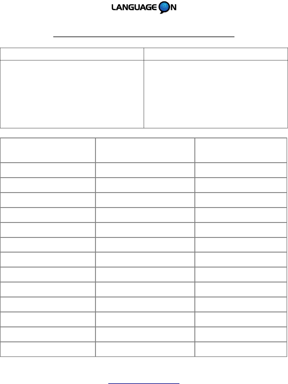 COMMON IRREGULAR VERBS IN ENGLISH REGULAR IRREGULAR Base Form / Past Simple / Past Participle Verb / Verb + ed / Verb + ed work / worked / worked Verbs ending in 'Y' Verb / Verb + ied / Verb + ied study / studied / studied These are ALL different! Please see below and memorize them! V1 Base Form of Verb V2 Past Simple V3 Past Participle be (is, am, are) was, were been beat beat beaten become became become begin began begun bend bent bent bet bet bet bid bid bid bite bit bitten blow blew blown break broke broken bring brought brought build built built burn burned/burnt burned/burnt LanguageOnSchools.com #TurnYourLanguageOn http://languageonschools.com/ buy bought bought catch caught caught choose chose chosen come came come cost cost cost cut cut cut dig dug dug dive dove dived do did done draw drew drawn dream dreamed/dreamt dreamed/dreamt drive drove driven drink drank drunk eat ate eaten fall fell fallen feel felt felt fight fought fought find found found fly flew flown forget forgot forgotten forgive forgave forgiven freeze froze frozen get got gotten LanguageOnSchools.com #TurnYourLanguageOn http://languageonschools.com/ give gave given go went gone grow grew grown hang hung hung have had had hear heard heard hide hid hidden hit hit hit hold held held hurt hurt hurt keep kept kept know knew known lay laid laid lead led led leave left left lend lent lent let let let lie lay lain lose lost lost make made made mean meant meant meet met met pay paid paid LanguageOnSchools.com #TurnYourLanguageOn http://languageonschools.com/ put put put read read read ride rode ridden ring rang rung rise rose risen run ran run say said said see saw seen sell sold sold send sent sent show showed shown shut shut shut sing sang sung sit sat sat sleep slept slept speak spoke spoken spend spent spent stand stood stood swim swam swum take took taken teach taught taught tear tore torn tell told told LanguageOnSchools.com #TurnYourLanguageOn http://languageonschools.com/ think thought thought throw threw thrown understand understood understood wake woke woken wear wore worn win won won write wrote written LanguageOnSchools.com #TurnYourLanguageOn http://languageonschools.com/