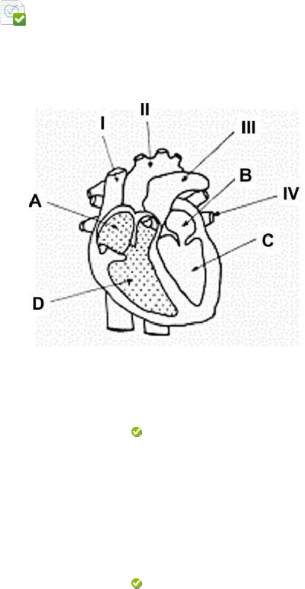 • Pergunta 1 0,3 em 0,3 pontos A figura esquematiza o coração de um mamífero, com suas câmaras (representadas por letras), veias e artérias (representadas por algarismos). Identifique cada parte do coração e assinale a alternativa que apresenta a correspondência correta. Identifique cada parte do coração e assinale a alternativa que apresenta a correspondência correta. Resposta Selecionada: b. O vaso indicado em IV traz sangue arterial dos pulmões ao coração. Respostas: a. O vaso indicado em III leva o sangue arterial do coração para o corpo. b. O vaso indicado em IV traz sangue arterial dos pulmões ao coração. c. Os vasos identificados em I, II e III são, respectivamente, veia cava superior, artéria pulmonar e artéria aorta. d. O sangue rico em CO2 chega à câmara B. e. O sangue rico em O2 chega às câmaras A e B. Comentário da resposta: Resposta Correta: B Comentário: a- Incorreta – artéria pulmonar – sangue venoso para pulmão. b- Correta – veias pulmonares trazem sangue oxigenado dos pulmões ao coração. c- Incorreta – II aorta e III pulmonar. d- Incorreta – em B chega sangue arterial. e- Incorreta – somente B sangue oxigenado. • Pergunta 2 0,3 em 0,3 pontos Um paciente compareceu ao pronto-socorro com queixas de “coração acelerado” referindo cansaço, falta de ar e dor no peito. Foi aferida a pressão arterial e ela se encontrava normal. Foi solicitado um eletrocardiograma que está ilustrado: Observe a imagem e faça correlação com as afirmações: I- A onda P que se refere à contração dos ventrículos está alterada. II- A onda P que se refere à contração dos átrios está alterada. III- O complexo QRS referente à contração dos átrios está alterado. IV- Está ocorrendo uma fibrilação atrial. V- Não há nenhuma alteração nesse exame. Está correto o que se afirma em: Resposta Selecionada: c. II e IV. Respostas: a. I e III. b. I e IV. c. II e IV. d. III e IV. e. Somente V. Comentário da resposta: Resposta Correta: C Comentário: a onda P se refere à contração dos átrios, está alterada e é a primeira onda representada no ECG. O complexo QRS se refere aos ventrículos. Por ter alteração da onda P, ocorreu uma fibrilação atrial. • Pergunta 3 0,3 em 0,3 pontos Sobre os elementos figurados do sangue dos mamíferos, são feitas as afirmativas: I- Os leucócitos são os elementos figurados mais numerosos na corrente sanguínea e desempenham importante papel na defesa do organismo. II- As hemácias são elementos figurados anucleados, presentes na circulação e desempenham importante papel no transporte de gases. III- As plaquetas são elementos celulares menos numerosos, presentes na circulação, atuando nos processos de coagulação sanguínea. Qual é a opção correta? Resposta Selecionada: d. II é verdadeira. Respostas: a. I, II e III são verdadeiras. b. I e II são verdadeiras. c. II e III são verdadeiras. d. II é verdadeira. e. III é verdadeira. Comentário da resposta: Resposta Correta: D Comentário: os mais abundantes são eritrócitos; as plaquetas não são células, e sim fragmentos celulares. As hemácias (glóbulos vermelhos) são os mais abundantes e são responsáveis pelo transporte de gases. • Pergunta 4 0,3 em 0,3 pontos Paciente, sexo masculino, 61 anos, durante anamnese, relatou que estava sob investigação médica, em função de uma alteração no nodo sinoatrial. Leia as afirmações e as julgue como verdadeiras (V) ou falsas (F). ( ) O nodo sinoatrial possui células especializadas que, normalmente, funcionam como um marcapasso cardíaco e controlam a ritmicidade cardíaca. ( ) O nodo sinoatrial possui células especializadas que, normalmente, funcionam como um marcapasso cardíaco e iniciam o potencial de ação, além de auxiliar o controle da abertura e o fechamento da válvula tricúspide. ( ) O nodo sinoatrial possui células especializadas que, normalmente, funcionam como um marcapasso cardíaco e iniciam o potencial de ação, além de controlar a abertura e o fechamento da válvula mitral. ( ) O nodo sinoatrial possui células mais lentas que, normalmente, levam a um leve atraso entre a contração atrial e ventricular. A sequência correta está na alternativa: Resposta Selecionada: e. V, F, F, F. Respostas: a. V, V, F, F. b. V, F, V, V. c. V, F, V, F. d. V, F, F, V. e. V, F, F, F. Comentário da resposta: Resposta Correta: E Comentário: o nodo sinoatrial funciona como um marcapasso cardíaco, porém não controla a abertura e o fechamento das válvulas e a propagação do estímulo é passada a outras células como no átrio ventricular, Feixe e Hiss, ramos direito e esquerdo e fibras de Purkinje. • Pergunta 5 0,3 em 0,3 pontos O coração possui um sistema próprio de condução, em que o potencial de ação se propaga não pelos nervos, mas por um conjunto de células musculares que se diferenciaram para realizar tal proeza. A sequência correta de propagação do impulso desde o marcapasso natural até a estimulação da musculatura ventricular é: Resposta Selecionada: e. Nodo sinoatrial – nodo AV – feixe de Hiss (ramos direito e esquerdo) – fibras de Purkinje. Respostas: a. Nodo sinoatrial – nodo VA – fibras internodais – feixe de Hiss – fibras de Purkinje. b. Nodo AV – fibras internodais – nodo sinoatrial – feixe de Hiss – fibras de Purkinje. c. Nodo sinoventricular – nodo AV – feixe de Hiss (ramos direito e esquerdo) – fibras de Purkinje. d. Nodo AV – nodo sinoatrial – feixe de Hiss (ramos direito e esquerdo) – fibras de Purkinje. e. Nodo sinoatrial – nodo AV – feixe de Hiss (ramos direito e esquerdo) – fibras de Purkinje. Comentário da resposta: Resposta Correta: E Comentário: a ordem de estimulação do coração respeita a sequência: nodo sinoatrial – nodo AV – feixe de Hiss (ramos direito e esquerdo) – fibras de Purkinje. • Pergunta 6 0,3 em 0,3 pontos Um indivíduo compareceu ao hospital com queixas 