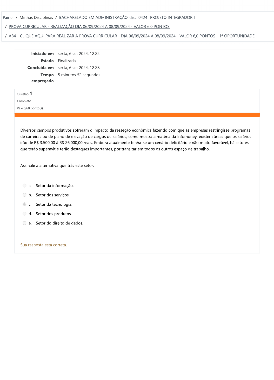 <p>Painel / Minhas Disciplinas / BACHARELADO EM ADMINISTRAÇÃO-disc 0424- PROJETO INTEGRADOR / PROVA CURRICULAR - REALIZAÇÃO DIA 06/09/2024 A 08/09/2024 - VALOR 6.0 PONTOS / AB4 - CLIQUE AQUI PARA REALIZAR A PROVA CURRICULAR - DIA 06/09/2024 A 08/09/2024 - VALOR 6,0 PONTOS - OPORTUNIDADE Iniciado em sexta, 6 set 2024, 12:22 Estado Finalizada Concluída em sexta, 6 set 2024, 12:28 Tempo 5 minutos 52 segundos empregado Questão 1 Completo Vale 0,60 ponto(s). Diversos campos produtivos sofreram o impacto da resseção econômica fazendo com que as empresas restringisse programas de carreiras ou de plano de elevação de cargos ou salários, como mostra a matéria da Infomoney, existem áreas que os salários irão de R$ à R$ 26.000,00 reais. Embora atualmente tenha-se um cenário deficitário e não muito favorável, há setores que terão superavit e terão destaques importantes, por transitar em todos os outros espaço de trabalho. Assinale a alternativa que trás este setor. a. Setor da informação. b. Setor dos serviços. C. Setor da tecnologia. d. Setor dos produtos. e. Setor do direito de dados. Sua resposta está correta.</p><p>Questão 2 Completo Vale 0,60 ponto(s). Um dos maiores desafios de qualquer pessoa que está em busca de uma oportunidade de emprego ou buscando uma recolocação, é construir um bom currículo. Muitos erros são encontrados por recrutadores e selecionadores de talentos, que as empresas contratam com a finalidade de buscar o melhor perfil, para a vaga existente. Com base no material de estudo, assinale a alternativa que apresenta um erro ao elaborar um currículo. a. Descreva a formação, incluindo o nome da instituição, curso e ano de formação. b. Sempre que possível indicar a área que pretende trabalhar. C. Nas informações pessoais, deve ser inserido nome completo, data de nascimento, endereço e número de documentos pessoais como RG, CPF e CNH. d. Seja claro nas experiências profissionais inserindo o nome da empresa, período de trabalho e atividades de atividades desenvolvidas. e. Faça um resumo das qualificações Sua resposta está correta. Questão 3 Completo Vale 0,60 ponto(s). planejamento de carreira é uma estratégia que permite que você assuma, de maneira proativa, o verdadeiro controle de sua vida profissional. Conseguir isso é muito importante, não apenas do ponto de vista financeiro, mas também no âmbito pessoal. Dessa forma, as chances de subir alguns degraus na carreira e de atingir os objetivos são bem maiores. Planejar sua carreira também permite que você conheça seus pontos fortes, assim como ajuda a as suas falhas. Alguns pontos são relevantes para em relação as vantagens de investir no plano de carreira. Leia as alterativas abaixo e indique a correta. a. Preocupar-se pouco com novos talentos e habilidades b. Tornar-se mais competitivo C. Crescer em paralelo com a empresa d. Ter mais motivação fora do ambiente de trabalho e. Ter atenção voltada para o destaque do concorrente. Sua resposta está correta.</p><p>Questão 4 Completo Vale 0,60 ponto(s). Costuma-se dizer que, após uma crise, o tempo de recuperação de um País ou empresa é três ou quatro vezes superior ao período que a situação demorou para chegar ao fundo do poço. A questão é que estamos nos recuperando de uma pandemia, algo bem mais sério que uma qualquer. Especialistas da edição do Guia Salarial da Robert Half, mapearam quatro mensagens chaves para 2021. Sobre as mensagens chaves, relacione os itens com seus significados. 1 - Habilidades comportamentais Um modelo vivenciado na pandemia e que será explorado como modelo de contratação no futuro. 2 - Alfabetização digital Pessoas são contratadas pelas competências técnicas e demitidas por aspectos comportamentais. 3 - Desafio na Retenção de talentos Independente do cargo ou função todos na organização devem se manter atualizado sobre a sua existência tecnológica. 4 - Contratação por projetos O home office alavancou este cenário, por levar os profissionais a todos no mundo. a. 2, 1, 3, 4. b. 1, 2, 3, 4. C. 4, 1, 2, 3. d. 4, 1, 3, 2. e. Sua resposta está correta.</p><p>Questão 5 Completo Vale 0,60 ponto(s). Para entendimento da importância do plano de carreira é importante reconhecer como se estrutura a carreira profissional. Carreira profissional é um termo amplamente utilizado, porém sua definição não está clara e uniforme, pois esta pode assumir significados diferentes, no entanto, diversos autores trazem definições acerca dos seus estudos. Considere as afirmativas abaixo e assinale a alternativa correta. I - Carreira é o que é relativo à mobilidade ocupacional, à estabilidade profissional, ou uma vida profissional bem estruturada e até a ideia de progresso constante. II - Carreira como associada às experiências e atividades relacionadas ao campo pessoal, sendo uma sequência de atitudes e comportamentos pessoais durante o período que ele integra a organização. III - Carreira são sequências de posições ocupadas e de trabalhos realizados durante toda a vida do indivíduo. IV - Carreira é oriunda do latim medieval via carraria, que quer dizer estrada rústica para carros. a. Afirmativas II, III e IV estão corretas. b. Afirmativas e III estão corretas. C. Afirmativas e IV estão corretas. d. Afirmativa I, III e IV estão corretas. e. Afirmativa I, e III estão corretas. Sua resposta está correta.</p><p>Questão 6 Completo Vale 0,60 ponto(s). As empresas estão buscando estabelecer ferramentas e processos que apoiem a jornadas das pessoas dentro da empresa, desta forma tem-se debruçado em busca de aprimorar o conhecimento dos profissionais de Rh ou treinamento. Mesmo que não seja consiga dar degraus a quem deseja crescer, elas buscam dar visibilidade dentro do cenário atual e dos planos para o futuro. Um dos propósitos dentro das organizações é estabelecer treinamentos que contribuam para o crescimento pessoal dos colaboradores, 