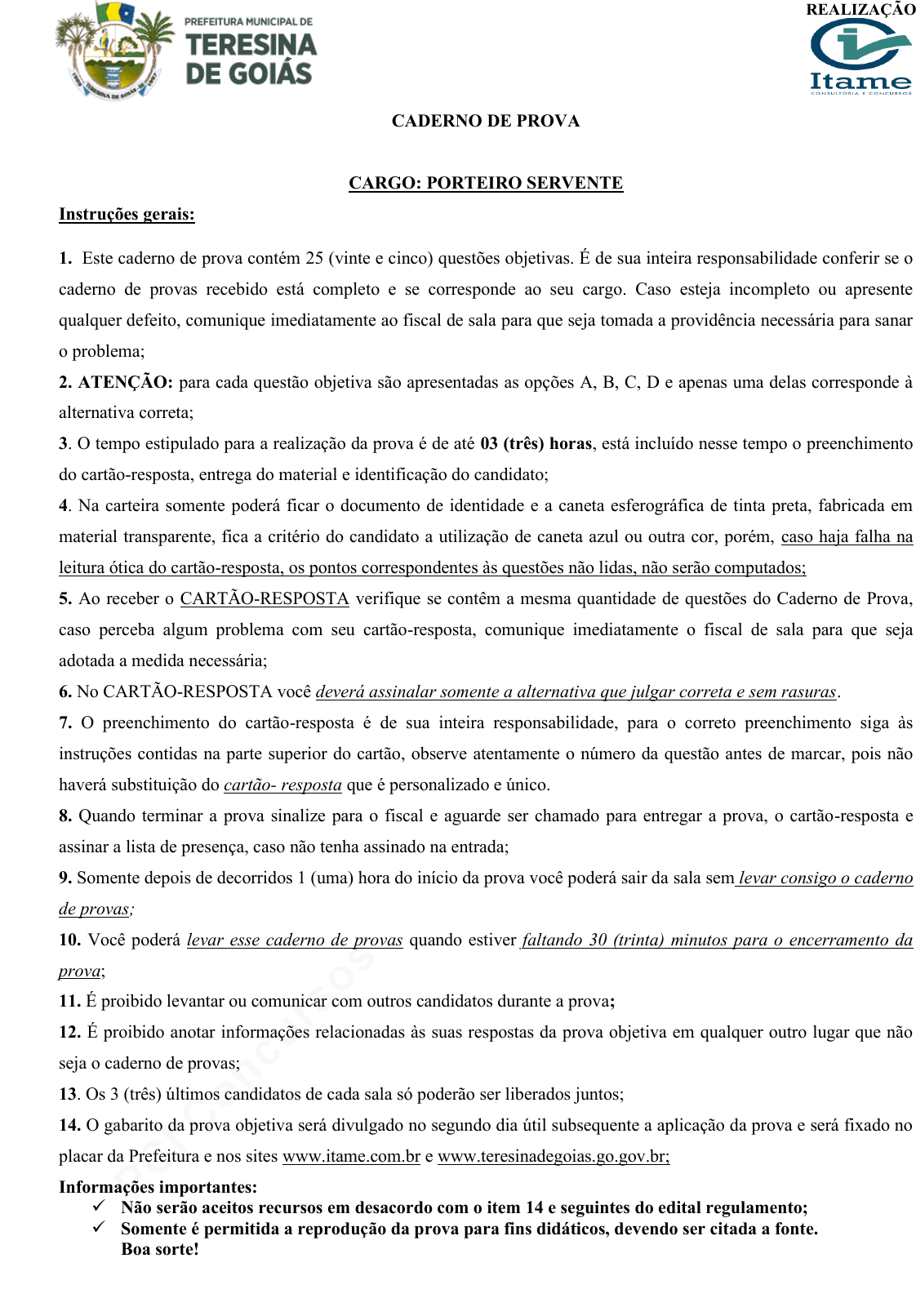 pcimarkpci MDAwMDowMDAwOjAwMDA6MDAwMDowMDAwOmZmZmY6YmYyMzo4Mjdh:VGh1LCAyMSBOb3YgMjAyNCAxNDo0NjowNyAtMDMwMA== www.pciconcursos.com.br REALIZAÇÃO CADERNO DE PROVA CARGO: PORTEIRO SERVENTE Instruções gerais: 1. Este caderno de prova contém 25 (vinte e cinco) questões objetivas. É de sua inteira responsabilidade conferir se o caderno de provas recebido está completo e se corresponde ao seu cargo. Caso esteja incompleto ou apresente qualquer defeito, comunique imediatamente ao fiscal de sala para que seja tomada a providência necessária para sanar o problema; 2. ATENÇÃO: para cada questão objetiva são apresentadas as opções A, B, C, D e apenas uma delas corresponde à alternativa correta; 3. O tempo estipulado para a realização da prova é de até 03 (três) horas, está incluído nesse tempo o preenchimento do cartão-resposta, entrega do material e identificação do candidato; 4. Na carteira somente poderá ficar o documento de identidade e a caneta esferográfica de tinta preta, fabricada em material transparente, fica a critério do candidato a utilização de caneta azul ou outra cor, porém, caso haja falha na leitura ótica do cartão-resposta, os pontos correspondentes às questões não lidas, não serão computados; 5. Ao receber o CARTÃO-RESPOSTA verifique se contêm a mesma quantidade de questões do Caderno de Prova, caso perceba algum problema com seu cartão-resposta, comunique imediatamente o fiscal de sala para que seja adotada a medida necessária; 6. No CARTÃO-RESPOSTA você deverá assinalar somente a alternativa que julgar correta e sem rasuras. 7. O preenchimento do cartão-resposta é de sua inteira responsabilidade, para o correto preenchimento siga às instruções contidas na parte superior do cartão, observe atentamente o número da questão antes de marcar, pois não haverá substituição do cartão- resposta que é personalizado e único. 8. Quando terminar a prova sinalize para o fiscal e aguarde ser chamado para entregar a prova, o cartão-resposta e assinar a lista de presença, caso não tenha assinado na entrada; 9. Somente depois de decorridos 1 (uma) hora do início da prova você poderá sair da sala sem levar consigo o caderno de provas; 10. Você poderá levar esse caderno de provas quando estiver faltando 30 (trinta) minutos para o encerramento da prova; 11. É proibido levantar ou comunicar com outros candidatos durante a prova; 12. É proibido anotar informações relacionadas às suas respostas da prova objetiva em qualquer outro lugar que não seja o caderno de provas; 13. Os 3 (três) últimos candidatos de cada sala só poderão ser liberados juntos; 14. O gabarito da prova objetiva será divulgado no segundo dia útil subsequente a aplicação da prova e será fixado no placar da Prefeitura e nos sites www.itame.com.br e www.teresinadegoias.go.gov.br; Informações importantes: ✓ Não serão aceitos recursos em desacordo com o item 14 e seguintes do edital regulamento; ✓ Somente é permitida a reprodução da prova para fins didáticos, devendo ser citada a fonte. Boa sorte! pcimarkpci MDAwMDowMDAwOjAwMDA6MDAwMDowMDAwOmZmZmY6YmYyMzo4Mjdh:VGh1LCAyMSBOb3YgMjAyNCAxNDo0NjowNyAtMDMwMA== www.pciconcursos.com.brTeresina de Goiás - GO / Porteiro Servente 1 Leia a lenda e responda os itens de 1 a 8. Lenda da Vitória Régia Conta a lenda que uma bela índia chamada Naiá apaixonou-se por Jaci (a Lua), que brilhava no céu a iluminar as noites. Nos contos dos pajés e caciques, Jaci de quando em quando descia à Terra para buscar alguma virgem e transformá-la em estrela do céu para lhe fazer companhia. Naiá, ouvindo aquilo, quis também virar estrela para brilhar ao lado de Jaci. Durante o dia, bravos guerreiros tentavam cortejar Naiá, mas era tudo em vão, pois ela recusava todos os convites de casamento. E mal podia esperar a noite chegar, quando saía para admirar Jaci, que parecia ignorar a pobre Naiá. Mas ela esperava sua subida e sua descida no horizonte e, já quase de manhãzinha, saía correndo em sentido oposto ao Sol para tentar alcançar a Lua. Corria e corria até cair de cansaço no meio da mata. Noite após noite, a tentativa de Naiá se repetia. Até que ela adoeceu. De tanto ser ignorada por Jaci, a moça começou a definhar. Mesmo doente, não havia uma noite que não fugisse para ir em busca da Lua. Numa dessas vezes, a índia caiu cansada à beira de um igarapé. Quando acordou, teve um susto e quase não acreditou: o reflexo da Lua nas águas claras do igarapé a fizeram exultar de felicidade! Finalmente ela estava ali, bem próxima de suas mãos. Naiá não teve dúvidas: mergulhou nas águas profundas e acabou se afogando. Jaci, vendo o sacrifício da índia, resolveu transformá-la numa estrela incomum. O destino de Naiá não estava no céu, mas nas águas, a refletir o clarão do luar. Naiá virou a Vitória Régia, a grande flor amazônica das águas calmas, a estrela das águas, tão linda quanto as estrelas e com um perfume inconfundível. E que só abre suas pétalas ao luar. 1. Qual foi o destino de Naiá após se sacrificar por seu amor a Jaci? (A) Ela se transformou em uma estrela do céu. (B) Ela se casou com um bravo guerreiro. (C) Ela virou uma Vitória Régia, uma grande flor amazônica. (D) Ela foi ignorada e continuou vivendo normalmente na tribo. 2. De acordo com o texto, qual substantivo é usado para se referir à Lua? (A) Naiá. (B) Índia. (C) Noite. (D) Jaci. 3. No trecho “Mesmo doente, não havia uma noite que não fugisse para ir em busca da Lua”, qual termo é um advérbio que indica negação? (A) Lua. (B) Não. (C) Doente. (D) Mesmo. 4. De acordo com as regras de acentuação gráfica das palavras, marque a alternativa em que a palavra destacada é uma oxítona. (A) “Naiá não teve dúvidas” (B) “Naiá virou a Vitória Régia”. (C) “Finalmente ela estava ali, bem próxima de suas mãos”. (D) “Conta a lenda que uma bela índia chamada Naiá apaixonou-se por