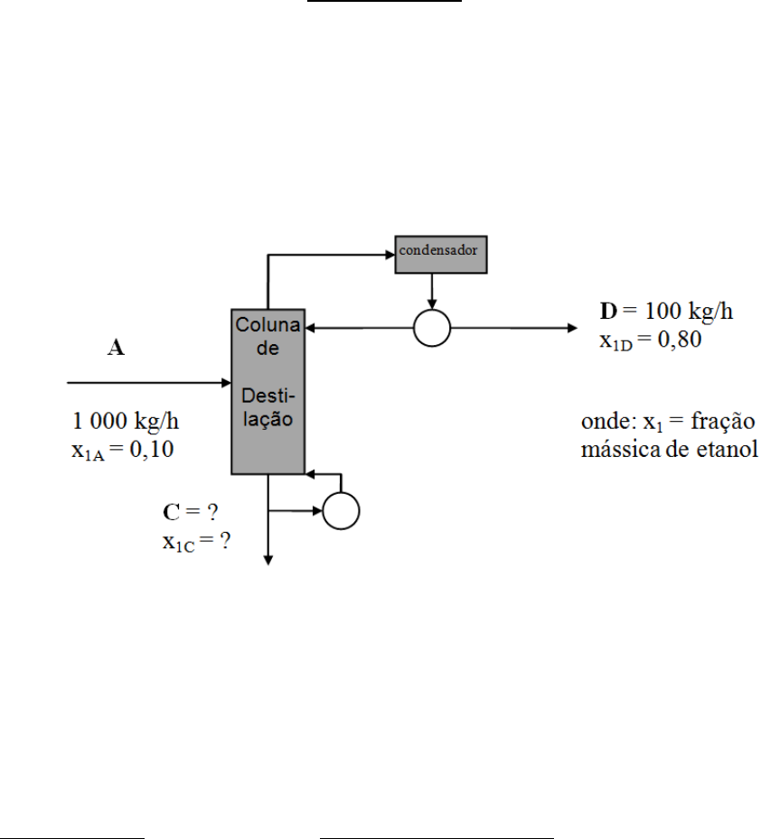 UTFPR – CAMPUS DE CAMPO MOURÃO CURSO DE ENGENHARIA DE ALIMENTOS DISCIPLINA: FUNDAMENTOS ENGENHARIA DE ALIMENTOS PROFESSORA: STÉPHANI LISTA DE EXERCÍCIOS 1 – BALANÇO DE MASSA E X E R C Í C I O S 1 - Tendo-se uma alimentação de 1000 kg/h de suco integral de fruta com 12% de sólidos solúveis em um evaporador, quanto se produz de suco concentrado com 40% de sólidos solúveis? Quanto de água será evaporada? 2 - Alimenta-se uma coluna de destilação (como esquematizada na Figura), com 1000 kg/h de uma solução contendo 10% de etanol em peso, obtendo-se 100 kg/h de destilado com 80% em peso de álcool. Pede-se determinar a vazão de vinhaça (produto de cauda), sua composição e a quantidade percentual de álcool perdido no processo. 3 - Grãos de soja (12% de umidade em base úmida) contém 18% de óleo. Em um processo de prensagem, consegue-se extrair 80% do óleo original. a) Qual a concentração de óleo na torta? b) e a umidade? Suponha que o óleo extraído não contém umidade e nem arrasta sólidos da torta. 4 - Para se produzir leite condensado açucarado (composição abaixo), faz-se a concentração do leite (composição típica abaixo), adicionando-se em seguida um xarope com 65% de sacarose. Para a produção de 1000 kg de leite condensado, calcule: a) Quantidade de leite utilizado. b) Quantidade de xarope e de açúcar. c) Quantidade de água evaporada. d) Composição química do leite condensado quanto a água, sacarose, proteína, gordura, ... composição do leite composição do leite condensado água ..............................87,0% água ....................................35% proteína ........................3,3% sacarose ..............................41% gordura .........................3,8% sólidos de leite ....................24% lactose ..........................4,8% sais minerais ................0,8% outros ...........................0,3% 5 - Na produção de etanol a partir de soluções de sacarose, tem-se um rendimento de 90% sobre o máximo teórico. Quanto de etanol será produzido com 1000 litros de uma solução 10% em peso de sacarose a 30oC. Quanto se produz de CO2 e qual a concentração de etanol resultante? C H O O H OH 12 22 11 5 + H 2 4 C 2 + 4 CO 2 sacarose etanol → 6 - O óleo diesel pode ser representado pela cetona C16H34. Supondo que uma caldeira queima 20 kg de óleo com 400 kg de ar. a) Calcule a porcentagem molar de excesso de ar. b) Supondo que 20% do diesel queima produzindo CO e 80% queima produzindo CO2, determine a composição dos gases de chaminé. Considere o ar composto de 21 mol % de O2 (M=32,0) e 79 mol% de N2 atmosférico (M=28,2). 7 - Morangos contém cerca de 15% de sólidos e 85% de água. Para a fabricação de geléia, estes são desintegrados com açúcar na proporção de 45:55, respectivamente. Sendo a mistura, evaporada até que o produto contenha 1/3 de água. Para produzir 1 kg de geléia: a) Quantos kg de morangos são necessários ? b) Quantos kg de açúcar são necessários? c) Quanto de água deve ser evaporada? 8 - Deseja-se secar 100 kg/h de um vegetal que contém 85% de umidade. Para isto utiliza-se um secador no qual entra ar quente com umidade de 0,010 kg água/ kg de ar seco saindo do secador com umidade 0,040 kg água/kg ar seco. Sabendo-se que a vazão de ar é de 2500 kg/h de ar seco. Pede-se qual será a produção horária do produto seco e qual sua umidade. 9 - Uma usina de leite produz aproximadamente 1933 litros por hora de leite padronizado (2,5% de gordura) a 4oC a partir de leite com 3,8% de gordura. A padronização é realizada em uma centrífuga que separa creme de leite, composto de 35% de gordura e 65% de leite desnatado. a) Quanto de leite integral é alimentado no processo e quanto de creme é obtido ? b) Qual deverá ser a nova produção de leite padronizado em L/h e de creme em kg/h, partindo-se da mesma alimentação, mas ajustando a centrífuga para obter um creme com 70% de gordura e 30% de leite desnatado. 10 - Em um extrator de açúcar, entra cana de açúcar triturada e água, saindo bagaço lavado e uma solução rica em açúcares (15% de sólidos solúveis). O extrator tem capacidade para processar 1000 kg/h de cana e dispõe de alguns dados sobre a composição das correntes de entrada e saída. Considerando que consegue-se extrair 90% dos sólidos solúveis da cana e que toda a fibra sai no bagaço, calcule a vazão de água necessária para a extração. cana triturada bagaço úmido 70% água 93% água 15% sólidos solúveis 10% dos sólidos solúveis originais 15% fibras 100% das fibras originais 11 - U tanque (cristalizador ou cozedor) contém 10 000 kg de uma solução saturada de sacarose a 60oC. Até que temperatura deve ser resfriada essa solução para cristalizar 2000 kg de sacarose? 12 - Na fabricação de café solúvel, o extrato que sai dos extratores contém cerca de 25% de sólidos, sendo concentrado por evaporação até 42% de sólidos. Após a concentração, o extrato segue para o secador “Spray”, do qual sai com 5% de água. Como na evaporação perde-se muito mais aroma que na secagem, uma alternativa interessante é dividir o extrato em duas correntes: uma passa pelo evaporador e outra vai direto ao secador. Assim, se 1/5 do extrato for direto ao secador, qual a concentração do café na saída do evaporador de forma que a alimentação do secador tenha 42% de sólidos? 13 - Em uma indústria de processamento de pescado salgado seco, o produto deve sair com as especificações recomendadas pela FAO, ou seja, 30% de umidade, 25% de sal e 45% de sólidos originais. Na etapa de salga, o sal adicionado deve ser suficiente para salgar o pescado e ainda propiciar a formação de salmoura saturada a 30oC (solubilidade de NaCl em água = 33,6 g / 100 g solução). Antes da salga o produto deve ter 70% de umidade e, após a mesma, 56,5%. Assim para uma produção de 1000 kg de produto. a) Qual a quantidade de pescado fresco? b) Qual a