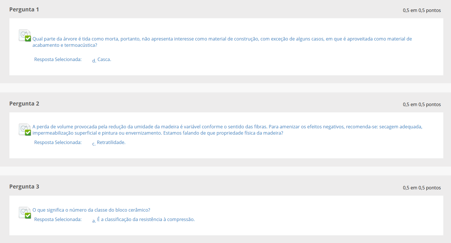 Pergunta 1 0,5 em 0,5 pontos Qual parte da árvore é tida como morta, portanto, não apresenta interesse como material de construção, com exceção de alguns casos, em que é aproveitada como material de acabamento e termoacústica? Resposta Selecionada: d. Casca. Pergunta 2 0,5 em 0,5 pontos A perda de volume provocada pela redução da umidade da madeira é variável conforme o sentido das fibras. Para amenizar os efeitos negativos, recomenda-se: secagem adequada, impermeabilização superficial e pintura ou envernizamento. Estamos falando de que propriedade física da madeira? Resposta Selecionada: C. Retratilidade. Pergunta 3 0,5 em 0,5 pontos o que significa número da classe do bloco cerâmico? Resposta Selecionada: a. É a classificação da resistência à compressão.