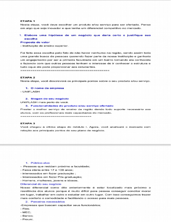 ***Cole aqui as etapas 1, 2, 3, 4, 5 e 6desenvolvidas nos módulosI e II (apenas, se você entregou essas etapas). ***Cole aqui as etapas 1, 2 e 3 desenvolvidas do módulo I (apenas se você entregou essas etapas). PROJETO INTEGRADOR – MÓDULO II ETAPA 4 Nesta etapa, você deve apresentar o protótipo do seu produto e/ou serviço: 1. Descreva e apresente um protótipo. Faculdade localizada no bairro mais próximos dos estudantes facilitando o acesso de todos e com uma das melhores infraestrutura do mercado! 2. Insira uma imagem, uma foto ou um vídeo do protótipo do seu negócio (por exemplo, você pode enviar fotos de uma maquete demonstrando a empresa; ua história em quadrinhos para demonstrar como será o serviço oferecido etc.). ETAPA 5 Nesta etapa, você descreveráum plano de ação para conhecer o mercado no qual deseja entrar: 1. Crie um questionário com no mínimo 5 e no máximo 10 perguntas para empresários do mesmo ramo de atuação para conhecer melhor o ramo. 1 Qual a sua margem de lucro? 2 Qual diferencial da sua instituição de ensino 3 Qual a faixa etária do seu público? 4 Quem são seus principais parceiros? 5 Qual é a missão, visão e valores da sua empresa? 2. Determine o prazo de aplicação do questionário. Imagine um cronograma demonstrando em quanto tempo você conseguiria entrevistar a concorrência. Estipule um período. AÇÃO RESPONSAVEL PRIORIDADE ESTADO INÍCIO FIM Aplicação do questionário concorrente 1 Francyellen Alta concluído 20/03 22/03 Aplicação do questionário concorrente 2 Francyellen Alta Em andamento 22/03 24/03 Aplicação do questionário concorrente 2 Francyellen Alta - 24/03 26/03 3. Quanto você imagina investir para obter as informações solicitadas no questionário? Não pagaria valor nenhum em dinheiro de início, faria uma proposta caso minha instituição utilizasse como base alguma das informação que ele nos passou e tivesse um bom resultado daria 10 por cento do meu lucro no primeiro mês de abertura do meu negócio. ETAPA 6 Você chegou à última etapa do módulo II. Agora, você descreverá um plano de ação para conhecer os consumidores do mercado no qual deseja entrar: 1. Crie um questionário com no mínimo 5 e no máximo 10 perguntas para entrevistar possíveis consumidores do seu produto e/ou serviço. 1 Qual curso pretende fazer? 2 Qual valor acessível? 3 mora em qual região? 4 daqui quanto tempo pretende ingressar na faculdade? 5 Pretende fazer pós-graduação? 6 irá fazer ENEM? 7 Qual ponto considera mais importa na hora de fazer a escolha da unidade onde irá cursar? 2. Determine o prazo de aplicação do questionário. Imagine um cronograma demonstrando em quanto tempo você conseguiria entrevistar os consumidores. Estipule um período. AÇÃO RESPONSAVEL PRIORIDADE ESTADO INICIO FIM Aplicação do questionário em escolas Francyellen Alta concluído 20/04 20/05 Aplicação do questionário em empresas Francyellen Alta Em andamento 20/04 20/05 Aplicação do questionário nas ruas Francyellen Alta - 20/04 20/05 3. Quanto você imagina investir para obter as informações solicitadas no questionário? Investiria em torno de R$ 10.000 mil reais para ser feito uma palestra divulgando meu empreendimento junto ao questionário e oferecia um desconto para alunos e funcionários que fizessem matricula conosco. PROJETO INTEGRADOR – MÓDULO III ETAPA 7 Nesta etapa, apresentea segmentação de mercado do seu negócio: Segmento de mercado Seguimento educacional para jovens e adultos. (Seguimento por benefício) Nichos de mercado Unidade de ensino superior próximo à residência dos alunos economizando tempo e dinheiro. Diferencial: - Impressão gratuita; - Biblioteca física e virtual disponível 24 horas; - Cantina com preços acessíveis; - Cobre qualquer oferta dos concorrentes Quais produtos ou serviços você ofertará em sua empresa? Ensino de graduação e pós-graduação em nível de especialização, mestrado e doutorado. Focado nas áreas de Medicina e Odontologia. ETAPA 8 Nesta etapa, descrevaas características das pessoas que devem fazer parte do time de trabalho do seu negócio: Quais conhecimentos essas pessoas deverão ter? Conhecimentos amplos, cada um direcionado para cada profissional de sua área especifica, sendo do menor ao maior cargo tendo em conta que são todos de suma importância, para que possa funcionar e termos uma bom resultado levando em conta que somos uma equipe e deverão sempre estar buscando novos conhecimentos e se antenar a tecnologia. Quais habilidades essas pessoas deverão ter? Flexibilidade; Autoconfiança; Persuasão; Visão do aluno; Trabalho em equipe; Comunicação .... Quais atitudes essas pessoas deverão ter? Iniciativa; Atitudes proativa; Autoconhecimento; Pensamento crítico; Empatia; Saber impor limites; ETAPA 9 Você chegou à última etapa do módulo III.Agora, você descreveráaspectos sobre preço e valor do seu produto e/ou serviço: Quais métodos você utilizará para que os consumidores tenham conhecimento do seu produto e/ou serviço? - Comerciais na TV; - Comerciais no rádio - Panfletos; - Palestras de divulgação em escolas; - Anúncios na internet; - Editoras; - Sites; - Palestras em empresas. Quanto custará o seu produto ou serviço? Quais os custos e despesas para ofertá-los (colocá-los no mercado)? -Curso de medicina: R$ 7.645,00 Mensal -Curso de Odontologia R$ 2.128,59 Mensal. O Custo seria os salários de todos os colaboradores, aluguel da instituição, moveis e utensílios como mesa, cadeiras, computadores entre outros, livros, água, luz... Quanto as pessoas pagariam para ter esse produto ou serviço? -Curso de medicina: R$ 9,000,00 Mensal -Curso de Odontologia R$ 3,500 Mensal. image1.png image2.jpeg