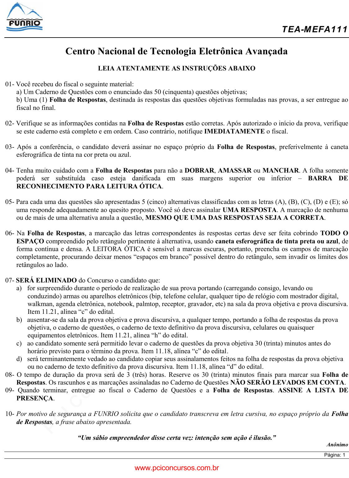 pcimarkpci MDAwMDowMDAwOjAwMDA6MDAwMDowMDAwOmZmZmY6YmQyODo1NmRj:U3VuLCAxNyBOb3YgMjAyNCAxMToxNToxOSAtMDMwMA== www.pciconcursos.com.br TEA-MEFA111 Página: 1 Centro Nacional de Tecnologia Eletrônica Avançada LEIA ATENTAMENTE AS INSTRUÇÕES ABAIXO 01- Você recebeu do fiscal o seguinte material: a) Um Caderno de Questões com o enunciado das 50 (cinquenta) questões objetivas; b) Uma (1) Folha de Respostas, destinada às respostas das questões objetivas formuladas nas provas, a ser entregue ao fiscal no final. 02- Verifique se as informações contidas na Folha de Respostas estão corretas. Após autorizado o início da prova, verifique se este caderno está completo e em ordem. Caso contrário, notifique IMEDIATAMENTE o fiscal. 03- Após a conferência, o candidato deverá assinar no espaço próprio da Folha de Respostas, preferivelmente à caneta esferográfica de tinta na cor preta ou azul. 04- Tenha muito cuidado com a Folha de Respostas para não a DOBRAR, AMASSAR ou MANCHAR. A folha somente poderá ser substituída caso esteja danificada em suas margens superior ou inferior – BARRA DE RECONHECIMENTO PARA LEITURA ÓTICA. 05- Para cada uma das questões são apresentadas 5 (cinco) alternativas classificadas com as letras (A), (B), (C), (D) e (E); só uma responde adequadamente ao quesito proposto. Você só deve assinalar UMA RESPOSTA. A marcação de nenhuma ou de mais de uma alternativa anula a questão, MESMO QUE UMA DAS RESPOSTAS SEJA A CORRETA. 06- Na Folha de Respostas, a marcação das letras correspondentes às respostas certas deve ser feita cobrindo TODO O ESPAÇO compreendido pelo retângulo pertinente à alternativa, usando caneta esferográfica de tinta preta ou azul, de forma contínua e densa. A LEITORA ÓTICA é sensível a marcas escuras, portanto, preencha os campos de marcação completamente, procurando deixar menos “espaços em branco” possível dentro do retângulo, sem invadir os limites dos retângulos ao lado. 07- SERÁ ELIMINADO do Concurso o candidato que: a) for surpreendido durante o período de realização de sua prova portando (carregando consigo, levando ou conduzindo) armas ou aparelhos eletrônicos (bip, telefone celular, qualquer tipo de relógio com mostrador digital, walkman, agenda eletrônica, notebook, palmtop, receptor, gravador, etc) na sala da prova objetiva e prova discursiva. Item 11.21, alínea “c” do edital. b) ausentar-se da sala da prova objetiva e prova discursiva, a qualquer tempo, portando a folha de respostas da prova objetiva, o caderno de questões, o caderno de texto definitivo da prova discursiva, celulares ou quaisquer equipamentos eletrônicos. Item 11.21, alínea “h” do edital. c) ao candidato somente será permitido levar o caderno de questões da prova objetiva 30 (trinta) minutos antes do horário previsto para o término da prova. Item 11.18, alínea “c” do edital. d) será terminantemente vedado ao candidato copiar seus assinalamentos feitos na folha de respostas da prova objetiva ou no caderno de texto definitivo da prova discursiva. Item 11.18, alínea “d” do edital. 08- O tempo de duração da prova será de 3 (três) horas. Reserve os 30 (trinta) minutos finais para marcar sua Folha de Respostas. Os rascunhos e as marcações assinaladas no Caderno de Questões NÃO SERÃO LEVADOS EM CONTA. 09- Quando terminar, entregue ao fiscal o Caderno de Questões e a Folha de Respostas. ASSINE A LISTA DE PRESENÇA. 10- Por motivo de segurança a FUNRIO solicita que o candidato transcreva em letra cursiva, no espaço próprio da Folha de Respostas, a frase abaixo apresentada. “Um sábio empreendedor disse certa vez: intenção sem ação é ilusão.” Anônimo www.pciconcursos.com.br pcimarkpci MDAwMDowMDAwOjAwMDA6MDAwMDowMDAwOmZmZmY6YmQyODo1NmRj:U3VuLCAxNyBOb3YgMjAyNCAxMToxNToxOSAtMDMwMA== www.pciconcursos.com.br TEA-MEFA111 Página: 2 www.pciconcursos.com.br pcimarkpci MDAwMDowMDAwOjAwMDA6MDAwMDowMDAwOmZmZmY6YmQyODo1NmRj:U3VuLCAxNyBOb3YgMjAyNCAxMToxNToxOSAtMDMwMA== www.pciconcursos.com.br TEA-MEFA111 Página: 3 ♦ Língua Portuguesa ♦ Questão 01 Segundo a gramática normativa, o substantivo sempre há de pertencer a um gênero, o que não ocorre com o adjetivo que assumirá o gênero em que o substantivo está empregado. Assim sendo, assinale a alternativa em que ambos os adjetivos não se flexionam em gênero: A) Cientista hindu; homem célebre. B) Costume andaluz; material lúdico-instrutivo. C) Elemento motor; tratamento médico-dentário. D) Esforço vão; passeio matinal. E) Juiz arrogante; sentimento fraterno. Questão 02 Há certo número de substantivos cuja significação varia de acordo com a mudança de gênero imposta a ele pela estrutura frasal em que ocorre: a partir dessa informação, assinale o item em que todas as palavras mudam de significado de acordo com o gênero em que são empregadas: A) capital – nascente – cabeça. B) cura – diabete – edema. C) grama – sanduíche – plasma. D) motocicleta – apendicite – cisma. E) telefonema – trema – diadema. Questão 03 Considerando a classe das palavras MAL e MAU e o seu emprego frasal, numere a 1ª coluna de acordo com a 2ª. Em seguida, assinale, na coluna 3, a letra que contém a série numérica cuja ordenação representa corretamente a relação que une a coluna 1 à 2: Coluna 1 Coluna 2 ( ) Faz mau tempo (1) Substantivo comum concreto ( ) Os maus serão punidos (2) Substantivo comum abstrato ( ) Amor é mal sem cura (3) Adjetivo ( ) Você lê muito mal (4) Advérbio de modo ( ) Quem não lê, mal entende as coisas (5) Advérbio de intensidade ( ) Mal cheguei, recebi a notícia triste (6) Conjunção subordinativa temporal Coluna 3 A) 1 – 2 – 3 – 5 – 6 – 4 B) 2 – 1 – 3 – 4 – 5 – 6 C) 3 – 1 – 2 – 4 – 5 – 6 D) 3 – 1 – 2 – 5 – 6 – 4 E) 3 – 2 – 1 – 5 – 4 – 6 Questão 04 “Abro esta crônica como uma janela – Bom dia – e nela me debruço para conversar contigo