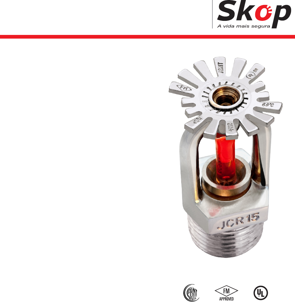 DESCRIÇÃO DO PRODUTO SPRINKLER JCR 1 O sprinkler modelo JCR é o único chuveiro automático contra incêndio (sprinkler) no mundo a obter simultaneamente as certificações / aprovações da ABNT, FM Global e UL. Esteticamente apresenta dimensões similares à categoria de sprinklers destinada ao uso comercial e residencial. É uma linha composta por 48 modelos, resultantes da combinação de diâmetros, tipo de resposta do elemento sensível, posição e acabamento. O elemento termo-sensível do modelo JCR é do tipo bulbo de vidro, desenvolvido sob a mais alta tecnologia. Os bulbos são de 5mm para resposta padrão e 3mm para resposta rápida. O modelo JCR foi desenvolvido para ser aplicado em sistemas fixos de tubulações de incêndio, tanto para tubulação seca, quanto molhada e pré-ação. Para sua instalação, recomendamos o uso da Chave de Fixação da Skop, desenvolvida para tornar confortável a operação de fixação do sprinkler, sem causar danos ao forro / teto da obra. Além disso, todos os outros acessórios da linha Skop, como canoplas e gaiolas, poderão ser utilizados no modelo JCR. A partir do sprinkler modelo JCR, o mercado brasileiro tem à disposição um produto com certificação nacional e internacional, contando com as mesmas facilidades de atendimento rápido, suporte técnico e prazo de entrega que a Skop disponibiliza há mais de 35 anos. CERTIFICAÇÕES O modelo a ser especificado para sprinklers da Skop com ABNT, FM e UL será sempre JCR. Associação Brasileira de Normas Técnicas - ABNT; Seguradora Americana de Gestão de Risco - FM (FACTORY MUTUAL); (JCR 15 Nº 3030565 / JCR 20 Nº 3030564); Sistema de Gestão da Qualidade (ISO 9001/2008); UL Certificações - (Certificado Nº 14.0269). MODELO TIPO DE RESPOSTA Os elementos termo-sensíveis do modelo JCR podem ser do tipo Resposta Padrão (bulbo de 5mm) e Resposta Rápida (bulbo de 3mm). Quando o tipo de resposta for padrão, não coloque nenhuma numeração ou letra na descrição do modelo JCR e, quando o tipo de resposta for rápida, coloque as letras QR, que é a nomenclatura universal para Quick Response. JCR H 15 68 CR Para especificar, por exemplo, o sprinkler modelo JCR, tipo Resposta Padrão, pendente, de ", 68 ºC e acabamento cromado. ¾ 2 . . . .Rua Braga, 57 Penha Circular Rio de Janeiro RJ Cep.: 21011-500 .Tel.: 21 3147-7777 Fax.: 21 3147-7799 .skop@skop.com.br www.skop.com.br O código de descrição dos sprinklers da Skop é composto por 6 (seis) conjuntos de letras e números que diz exatamente o modelo especificado em projeto e / ou pelo setor de compras. Note-se que todos os sprinklers certificados devem ter estampados no defletor / corpo do produto todas essas 6 (seis) marcações, além da data de fabricação e órgão certificador. A partir destes códigos, apresentam-se as variações técnicas disponíveis para o seu projeto. Abaixo o exemplo de especificação do modelo JCR tipo Resposta Rápida, para cima, de ½", 79 ºC e acabamento natural: modelo posição diâmetro temperatura acabamento JCR H 20 68 CR modelo tipo de resposta posição diâmetro temperatura acabamento JCR QR F 15 79 NA TEMPERATURA COMO ESPECIFICAR UM CHUVEIRO AUTOMÁTICO CONTRA INCÊNDIO (sprinkler) MODELO JCR POSIÇÃO DO SPRINKLER O modelo JCR foi desenvolvido para trabalhar em duas posições: Pendente e Para Cima (upright). No mercado brasileiro, convenciona-se utilizar o código ‘’H’’ para os modelos Pendentes e ‘’F’’ para os modelos Para Cima. As temperaturas de acionamento do elemento termo-sensível (bulbo) dos sprinklers da linha JCR da Skop estão descritas na tabela abaixo. Cada cor do líquido encontrado dentro do bulbo indica a temperatura de acionamento do mesmo, seguindo as normas internacionais de sinalização. Tubo de 1" R ED U ÇÃ O D E 1X 1 / 2 " Tubo de 1" Tubo de 1" T D E R ED U ÇÃ O D E 1X 1 /2 " Classificação da Temperatura Temperatura Máx. Temp. Ambiente Cor do Bulbo ºC ºF ºC ºF Ordinário 68 155 38 100 vermelho Intermediário 79 175 66 150 amarelo Alto 141 286 107 225 azul Os acabamentos disponíveis para todos os modelos de sprinkler JCR da Skop são cromado e natural. 3 . . . .Rua Braga, 57 Penha Circular Rio de Janeiro RJ Cep.: 21011-500 .Tel.: 21 3147-7777 Fax.: 21 3147-7799 .skop@skop.com.br www.skop.com.br Os produtos da linha Skop utilizam dois diâmetros, conforme tabela abaixo: Orifício Nominal Rosca Fator K Métrico US ½’’ (15mm) ½’’ NPT 5.6 80 ¾’’ (20mm) ¾’’ NPT 8.0 115 DIÂMETRO E DIMENSÕES DO SPRINKLER ACABAMENTO JCR 15 F 141 NAJCR QR F 79 CR15 JCR QR H 68 CR15 JCR 15 QR F 141 NA JCR 15 H 68 CR JCR 15 F 79 CR JCR 20 QR H 68 CR JCR 20 QR F 79 CR JCR 20 QR F 141 NA JCR 20 H 68 CR JCR 20 F 79 CR JCR 20 F 141 NA 54 .0 0 m m 24.06 mm ½" NPT 28.50 mm 28.50 mm 54 .0 0 m m 24.06 mm ½" NPT 33.32 mm 57 .0 0 m m 27.00 mm 3/4" NPT 27.00 mm 3/4'’ NPT 57 .0 0 m m 28.50 mm INSTALAÇÃO E MANUTENÇÃO DOS SPRINKLERS JCR 4 FOL JCR - rev03 . . . .Rua Braga, 57 Penha Circular Rio de Janeiro RJ Cep.: 21011-500 .Tel.: 21 3147-7777 Fax.: 21 3147-7799 .skop@skop.com.br www.skop.com.br ACESSÓRIOS A linha completa de acessórios Skop, como canoplas e gaiolas, são compatíveis com os sprinklers JCR. NATURAL CROMADO PRETOBRANCO Os sprinklers da Skop foram desenvolvidos para suportar uma pressão de trabalho de 175psi (12bar/1200KPa), contudo 100% da produção é testada a 507psi (35bar/3500KPa), segundo procedimentos específicos da ABNT, com o objetivo de garantir total confiabilidade do produto. Os Sprinklers JCR devem ser inspecionados periodicamente e o sistema hidráulico deve estar de acordo com as normas de instalação e limites de pressão de trabalho dos sprinklers. Para instalar os Sprinklers Modelo JCR 15, use a chave modelo CHFIX15; para os modelos JCR 20, use a chave modelo CHFIX20. Qualquer outro tipo de chave pode danificar esses sprinklers. Não limpe os sprinklers com sabão e água, amônia ou qualquer outro fluido d