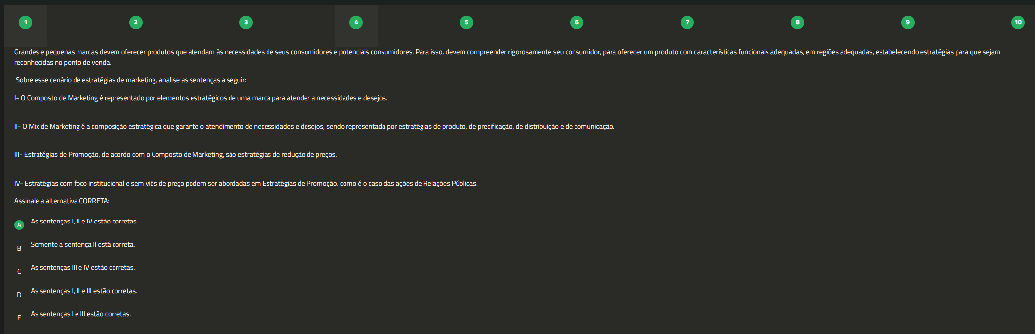 1 2 3 5 6 7 9 10 Grandes e pequenas marcas devem oferecer produtos que atendam às necessidades de seus consumidores e potenciais consumidores Para isso, devem compreender rigorosamente seu para oferecer um produto com características funcionais em regiões estabelecendo estratégias para que sejam reconhecidas no ponto de venda Sobre esse cenário de estratégias de marketing, analise as sentenças a I- Composto de Marketing é representado por elementos estratégicos de uma marca para atender a necessidades e desejos Mix de Marketing é a composição estratégica que garante atendimento de necessidades e desejos, sendo representada por estratégias de produto, de precificação, de distribuição e de comunicação. III- Estratégias de Promoção, de acordo com Composto de são estratégias de redução de preços IV- Estratégias com foco institucional e sem viés de preço podem ser abordadas em Estratégias de Promoção, como caso das ações de Relações Públicas Assinale a alternativa CORRETA: As sentenças e IV estão Somente a II está correta. As sentenças III e IV estão corretas D As sentenças I, III estão As sentenças III estão