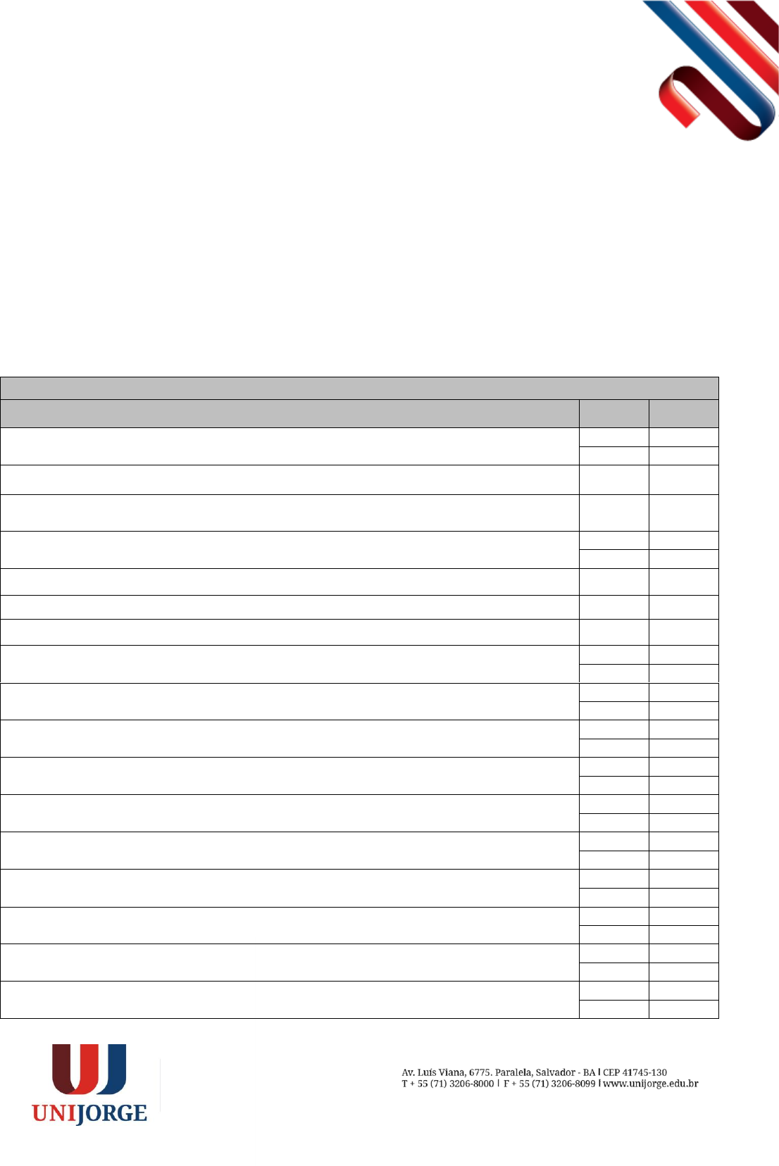 ‘ EDITAL MATRÍCULA ESPECIAL PARA PORTADOR DE DIPLOMA GRADUAÇÃO PRESENCIAL 2024.2 2º TRIMESTRE A Pró-Reitoria de Graduação do CENTRO UNIVERSITÁRIO JORGE AMADO, no uso de suas atribuições, e tendo em vista a existência de vagas disponíveis em cursos de graduação deste Centro Universitário, torna público que estarão abertas inscrições para o Processo Seletivo de Transferência Externa e Matrícula Especial para Portador de Diploma, para os cursos relacionados a seguir: 1. Bacharelados e Licenciaturas: CAMPUS PARALELA AUTORIZADO (A) E RECONHECIDO (R) TURNO VAGAS Bacharelado em Administração – RR - Portaria Nº 205 de 25 de junho de 2020 – D.O.U. em 07/07/2020. Matutino 60 Noturno 60 Bacharelado em Ciências Contábeis - RR - Portaria Nº 205 de 25.06.2020 – D.O.U. de 07.07.2020. Noturno 60 Bacharelado em Arquitetura e Urbanismo – RR – Portaria Nº 915, de 27 de dezembro de 2018 - D.O.U. em 28/12/2018. Matutino 60 Bacharelado em Biomedicina – A – RS. CONSUPE.006.16.00 Matutino 60 Noturno 60 Bacharelado em Ciências da Computação – A - RS. CONSUPE 005.17.00 Matutino 60 Bacharelado em Cinema e Audiovisual – A - RS. CONSUPE.006.16.00. Matutino 40 Bacharelado em Design – RR - Portaria Nº 205 de 25 de junho de 2020 – D.O.U. em 07/07/2020. Matutino 40 Bacharelado em Direito – RR - Portaria Nº 205 de 25 de junho de 2020 – D.O.U. em 07/07/2020. Matutino 120 Noturno 120 Bacharelado em Educação Física – RR – Portaria Nº 134 de 01 de março de 2018 - D.O.U. em 02/03/2018. Matutino 60 Noturno 60 Bacharelado em Enfermagem – RR - Portaria N° 948 de 30 de agosto de 2021 – D.O.U. em 31/08/2021. Matutino 140 Noturno 150 Bacharelado em Engenharia Ambiental e Sanitária – RR - Portaria Nº 915, de 27 de novembro de 2018 - D.O.U. em 28/12/2018. Matutino 40 Noturno 40 Bacharelado em Engenharia Civil – RR – Portaria Nº 915, de 27 de novembro de 2018 - D.O.U. em 28/12/2018. Matutino 120 Noturno 120 Bacharelado em Engenharia de Computação – A – RS. CONSUPE.006.16.00. Matutino 40 Noturno 40 Bacharelado em Engenharia Elétrica – RR – Portaria Nº 915, de 27 de novembro de 2018 - D.O.U. em 28/12/2018. Matutino 40 Noturno 50 Bacharelado em Engenharia de Produção – RR – Portaria Nº 915, de 27 de novembro de 2018 - D.O.U. em 28/12/2018. Matutino 50 Noturno 50 Bacharelado em Engenharia Mecânica – RR – Portaria Nº 915, de 27 de novembro de 2018 - D.O.U. em 28/12/2018. Matutino 50 Noturno 50 Bacharelado em Fisioterapia – RR – Portaria Nº 134 de 01 de março de 2018 - D.O.U. em 02/03/2018. Matutino 50 Noturno 50 ‘ Bacharelado em Fonoaudiologia – RR – Portaria Nº 134 de 01 de março de 2018 - D.O.U. em 02/03/2018. Matutino 100 Bacharelado em Jornalismo –2017 - RR - Portaria Nº 205 de 25 de junho de 2020 – D.O.U. em 07/07/2020. Matutino 50 Bacharelado em Medicina Veterinária - RS.CONSUPE.013.20.00. Matutino 60 Noturno 60 Bacharelado em Nutrição – RR – Portaria Nº 134 de 01 de março de 2018 - D.O.U. em 02/03/2018. Matutino 50 Bacharelado em Odontologia - Portaria de autorização nº 566 01/04/2022. Matutino 60 Noturno 60 Bacharelado em Psicologia – RR - Portaria Nº 205 de 25 de junho de 2020 – D.O.U. em 07/07/2020. Matutino 60 Noturno 60 Bacharelado em Publicidade e Propaganda – RR - Portaria Nº 205 de 25 de junho de 2020 – D.O.U. em 07/07/2020. Matutino 50 Bacharelado em Relações Internacionais – RR - Portaria Nº 205 de 25 de junho de 2020 – D.O.U. em 07/07/2020. Matutino 60 Licenciatura em Pedagogia – A – RS. CONSUPE 007.15.00. Noturno 60 2. Das inscrições e matrículas As inscrições serão feitas através do site www.unijorge.edu.br. Para a inscrição, o candidato ou seu representante deverá realizar as etapas descritas a seguir: 1. Acessar o site www.unijorge.edu.br, clicar no menu Forma de Ingresso - Transferência Externa / Portadores de Diploma 2024.2 2º Trimestre e preencher o cadastro de inscrição com os dados do candidato, o curso e turno desejados e demais informações necessárias; 2. O candidato deverá realizar o aceite eletrônico do contrato de prestação de serviço educacional e pagar o boleto da 1ª parcela do 2º trimestre de 2024.2. Atenção: a) No ato da inscrição, o candidato ou seu representante só poderá indicar um único curso para transferência externa ou portador de diploma e, declarar que tem conhecimento deste Edital e concorda com o mesmo. b) Não poderão se candidatar alunos matriculados em cursos sequenciais. c) Ao Centro Universitário Jorge Amado fica reservado o direito de, a qualquer tempo, cancelar o recebimento de inscrição que não atenda a todos os requisitos fixados neste Edital. http://www.unijorge.edu.br/ http://www.unijorge.edu.br/ ‘ d) Importante: Devido à estrutura de nosso currículo, oferecemos atualmente vagas para alunos de transferência externa apenas nas turmas do 1º e 2º semestres. Não temos disponibilidade de vagas para estudantes que desejam ingressar em semestres mais avançados. e) No caso de candidato de instituição de ensino superior estrangeira, toda documentação acadêmica relacionada no item 2 deverá ser traduzida para a Língua Portuguesa, por tradutor oficial. f) Na hipótese de cancelamento de matrícula referente ao primeiro semestre do curso, o CONTRATANTE deve formalizar o pedido junto à CONTRATADA, através de requerimento eletrônico, ou, na indisponibilidade deste, através de requerimento manual, até o dia imediatamente anterior ao do início das aulas, para fazer jus ao ressarcimento da importância correspondente a 1ª parcela do 2º trimestre de 2024.2, caso tenha sido paga. g) O aluno entrará cursando as disciplinas oferecidas no 2º trimestre/2024.2 h) O aluno PROUNI e FIES deverá antes de efetivar a matrícula, enviar a documentação através da página Unijorge. 3. Da promoção 2024.2 2º Trimestre A Promoção é válida para o Campus Paralela e será exclusiva para alun