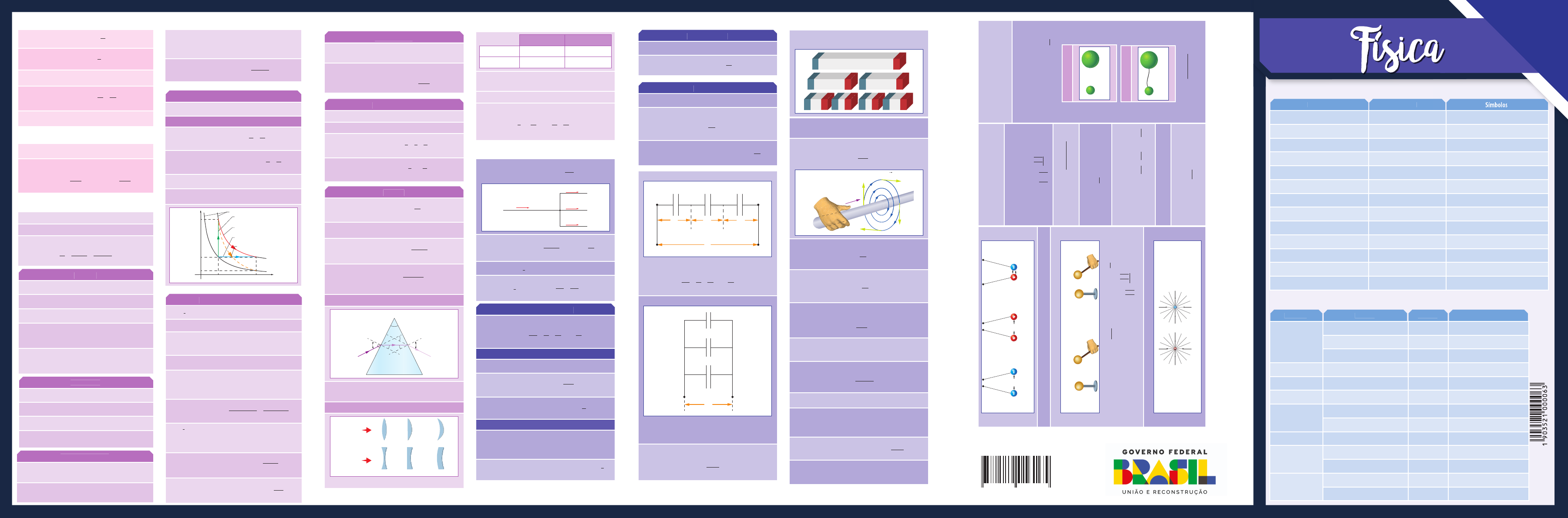 9 788579 011603 ISBN 978-85-7901-160-3 Grandeza Unidade Símbolos Ângulo plano radiano rad Frequência hertz Hz ou s–1 Força newton N ou kg ∙ m/s2 Pressão, tensão pascal Pa ou N/m2 ou m–1 ∙ kg ∙ s–2 Energia, trabalho, quantidade de calor joule J ou N ∙ m ou m2 ∙ kg ∙ s–2 Potência, fluxo de energia watt W ou J/s ou m2 ∙ kg ∙ s–3 Carga elétrica coulomb C ou A ∙ s Diferença de potencial elétrico volt V ou W/A ou m2 ∙ kg ∙ s–3 ∙ A–1 Capacitância farad F ou C/V ou m–2 ∙ kg–1 ∙ s4 ∙ A2 Resistência elétrica ohm Ω ou V/A ou m2 ∙ kg ∙ s–3 ∙ A–2 Fluxo de indução magnética weber Wb ou V ∙ s ou m2 ∙ kg ∙ s–2 ∙ A–1 Indução magnética tesla T ou Wb/m2 ou kg ∙ s–2 ∙ A–1 Indutância henry H ou Wb/A ou m2 ∙ kg ∙ s–2 ∙ A–2 Grandeza Unidade Símbolo Relação com SI Tempo minuto min 1 min = 60 s hora h 1 h = 3 600 s dia d 1 d = 86 400 s Velocidade quilômetros por hora km/h 1 km/h = (1/3,6) m/s Volume litro L 1 L = 1 dm3 Massa tonelada t 1 t = 1 000 kg Pressão milímetro de Mercúrio mmHg 1 mmHg ≅ 133,3 Pa atmosfera atm 1 atm ≅ 1,0 ∙ 105 Pa Comprimento angstrom Å 1 Å = 10–10 m Força quilograma-força kgf 1 kgf ≅ 9,8 N dina dyn 1 dyn = 10–5 N Energia caloria cal 1 cal ≅ 4,18 J elétronvolt eV 1 eV ≅ 1,602 ∙ 10–19 J Algumas grandezas físicas e suas unidades no SI Algumas unidades não-SI Densidade: d m V = Pressão: P F A = Pressão de uma coluna de líquido: P dgh= Prensa hidráulica: F A F A 1 1 2 2 = Empuxo: E d V gS= Equação da continuidade: ρ ρ1 1 1 2 2 2A v A v= Equação de Bernoulli: P g h v P g h v 1 1 1 2 2 2 2 2 2 2 + + = + +ρ ρ ρ ρ Hidrostática Hidrodinâmica Dilatação Linear: ∆ ∆L L T= 0 α Superficial: ∆ ∆S S T= 0 β Volumétrica: ∆ ∆V V T= 0 γ Relação entre os coeficientes de dilatação: γ α β α= =3 2 e Dilatação aparente: γ γ γaparente do l q real do l q real do recipienteí í. .= − Gases Equação dos gases perfeitos: PV nRT= Transformações Isobárica (P = cte.): V T V T i i f f = Isométrica ou isocórica (V = cte.): P T P T i i f f = Isotérmica (T = cte.): P V P Vi i f f⋅ = ⋅ Adiabática: P V P Vi i f f γ γ= e ∆ ∆Q U= → = −0 τ P1 = P3 V1 = V2 V3 = V4 P(atm) 2 1 3 4 V(L) T1 T2 P2 P4 0 Isotermas Aquecimento isométrico (1 → 2) Expansão isotérmica (2 → 3) Expansão isobárica (1 → 3) Expansão adiabática (2 → 4) Princípios da termodinâmica 1° princípio da termodinâmica: ∆ ∆Q U= +τ Trabalho: τ = ⋅P V∆ Energia interna de um gás ideal: ∆U só depende da temperatura. Constante dos gases ideais: R C CP V= − Ciclo de Carnot: duas expansões, uma isotérmica e outra adiabática, e duas compressões, uma isotérmica e uma adiabática. Rendimento: ηCarnot Quente Fria Quente Quente Fria Quente Q Q Q T T T = − = − 2° princípio da termodinâmica: é impossível a conversão total de calor em trabalho. A entropia total do universo não diminui. Rendimento de um motor: η τ= QQuente Eficiência de uma bomba de calor: e QFria= τ Calorimetria Quantidade de calor: Q m c T= ∆ Calor em mudança de fase: Q m L= Capacidade térmica: C = m c Balanço energético: Q∑ = 0 Propagação de calor Condução: calor passa de uma região para outra por meio de contato. Convecção: deslocamento de fluido com diferentes densidades. Irradiação: propagação através de ondas eletromagnéticas. Não exige necessariamente um meio material. Fluxo de calor: Φ = − K A T T d ( )1 2 Espelhos esféricos Espelho côncavo: f > 0 Espelho convexo: f nmeio convergente divergente nL 0. Lente divergente: f0 Po te nc ial el ét ric o g er ad o po r v ár ias ca rg as : V V V V Kq r Kq r Kq r n n n = + + + = + + + 1 2 1 1 2 2 ... ... Tra ba lh o d e A at é B : τ AB A B q V V = − ( ) En er gi a p ot en cia l e lét ric a d e d ua s c ar ga s pu nt ifo rm es : E KQ q d P = Po te nc ial el ét ric o n o i nt er io r d e u m co nd ut or ca rre ga do : V cte int = Po te nc ial el ét ric o n o e xt er io r d e u m co nd ut or ca rre ga do co m ca rg a Q : c om o se to da a ca rg a e sti ve ss e c on ce nt ra da n o ce nt ro d o c on du to r: V KQ r ex t= An te s Q a, R a Q b, R b De po is Q a’ Q b’ V VR VR R R f a a b b a b = + + 5616109758879 ISBN 978-85-7901-616-5 PDF FINAL / CONFIGURAÇÕES DO DOCUMENTO ATUAL / ANDERSON.OLIVEIRA / 26-09-2018 (08:19) MRU (movimento retilíneo uniforme) Velocidade média: v s tm = ∆ ∆ Função horária do espaço: s s v t= +0 Movimento progressivo: ∆s v> >0 0 e Movimento retrógrado: ∆s v 0) Movimento uniforme retrógrado (v > → ≅ ≅ −v v v v vA A B A B ’ ’ e 2 Centro de massa Posição: x m x m x m x m m mCM n n n = + + + + + + 1 1 2 2 1 2 ... ... A mesma relação vale para yCM e zCM. MCU (movimento circular uniforme) Velocidade angular: ω π= 2 T ou ω π= 2 f Função horária angular: θ θ ω= +0 t MCUV (movimento circular uniformemente variado) Função horária da velocidade angular: ω ω γ= +0 t Função horária angular: θ θ ω γ= + +0 0 2 2 t t Equação de Torricelli: ω ω γ θ2 0 2 2= + ∆ Transmissão de movimento circular Correia comum a duas rodas A e B RB ωBB Corrente RA A ωA Catraca e coroa unidas por uma corrente comum. v vA B= Rodas A e B em contato direto A ωA RA RB ωB B Duas rodas em contato. vA = vB Eixo de rotação comum a duas rodas B A RA RB ωA ωB Duas rodas unidas por eixo comum. ω ωA B= Lançamento vertical no vácuo Altura máxima: hmáx = v g 0 2 2 Tempo de subida: t v gS = 0 Tempo de voo: t t v gvoo S= =2 2 0 Lançamento oblíquo vx y = x0 A H θ vy vy v g vx vx v0y v0 0 Posição em x: x v t= 0 cosθ Posição em y: y y v t gt y= + −0 0 2 2 Velocidade em x: v vx = 0 cosθ Velocidade inicial em y: v v seny0 0= θ Velocidade em y: v v gty y= −0 Equação de Torricelli em y: v v g yy y 2 0 2 2= − ∆ Altura máxima: hmáx = v sen g 0 2 2 2 θ , v v vy x x= =0 0 e Tempo de subida: t v sen gs = 0 θ Tem