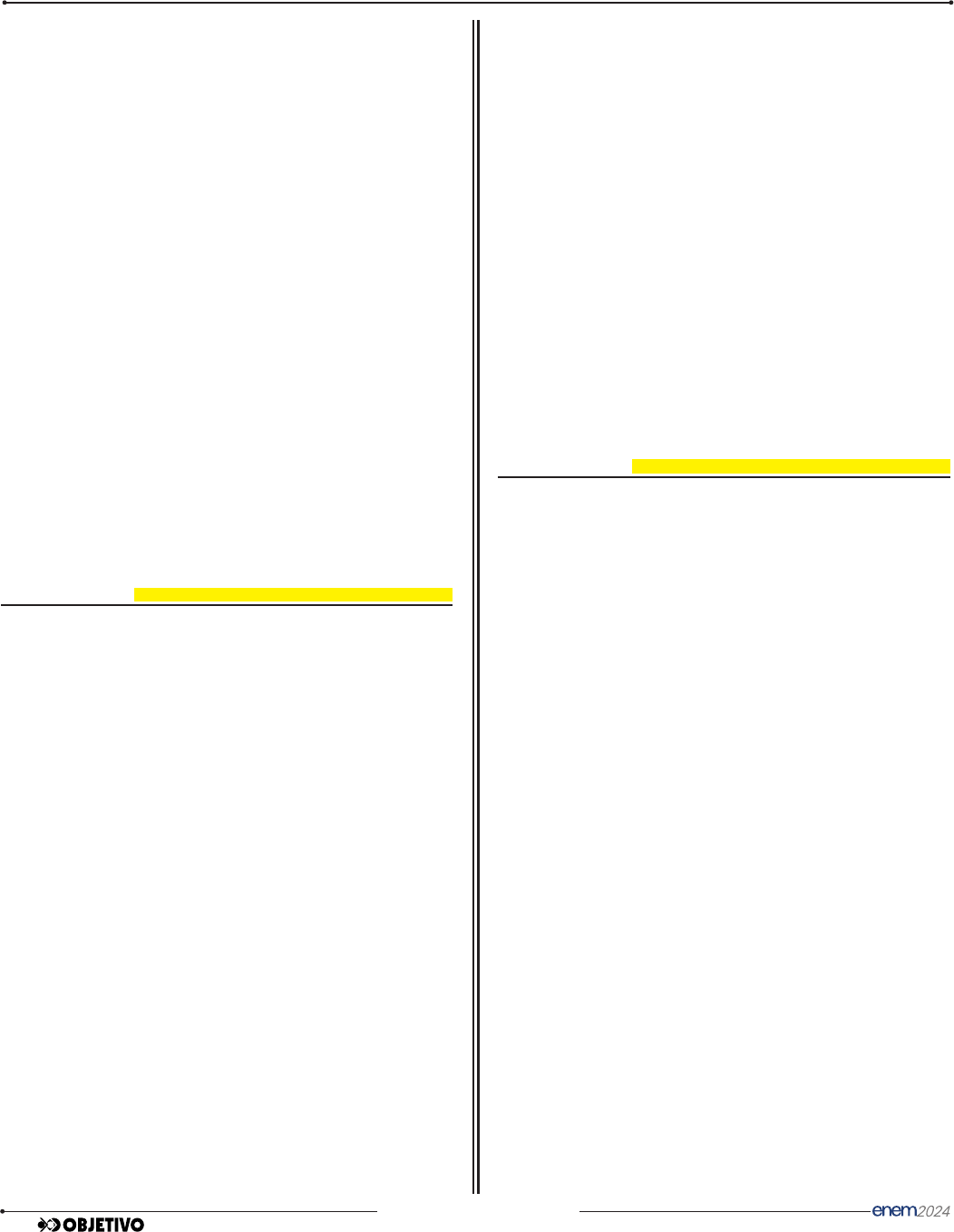 18 LC • 1.o dia • RESOLUÇÕES � garantir o acesso dos povos indígenas à legisla - ção brasileira de forma inclusiva e culturalmente relevante. � demonstrar a diversidade linguística existente nas comunidades indígenas da Amazônia. � exemplificar a influência histórica das línguas indígenas na formação do português amazônico. � reforçar a necessidade de padronização linguística entre as comunidades indígenas e a sociedade brasileira. � estabelecer novos parâmetros legais para a atua - ção das populações indígenas na região amazônica. Resolução A tradução das leis para línguas indígenas, como o nheengatu, pretende garantir o acesso dos povos indígenas à legislação brasileira. Isso promove a compreensão e o respeito às leis do País, além de fortalecer a identidade e os direitos dos povos indígenas por meio de uma abordagem linguística adaptada às suas culturas e tradições. Resposta: A Sim, na terra em que brotou o clássico indiscutível “trocando de biquíni sem parar” (por “tocando B.B. King sem parar”, verso da canção “Noite do Prazer”, da banda Brylho), a produção de virunduns é tão vasta quanto variada. (…) Todos têm em comum a incapacidade de reprimir sorrisos quando expostos a versos crus como “Quem sabe a índia assou uma garotinha” (“Malandragem”, Frejat e Cazuza, na voz de Cássia Eller) ou “Aí um analista me comeu” (“Divina comédia humana”, Belchior). (…) Consta que o nome virundum, baseado em “Ouviram do Ipiran - ga”, foi cunhado por Paulo Francis nos tempos do Pasquim para nomear o mal-entendido provocado por uma semelhança sonora fortuita. (…) Não fica nisso. Rónai afirma que “o elemento essencial” do trocadilho é a impossibilidade – ou pelo menos a dificuldade – de traduzi-lo para outros idiomas, o que o torna “ligado à substância íntima de cada língua”, como a melhor poesia. O virundum é igual. RODRIGUES, Sérgio. “Virundum é coisa séria, embora seja impossível ficar sério diante dele”. Folha de S.Paulo. 24 maio 2023. As línguas naturais são produtos culturais dinâmicos e seu uso reflete traços sociais e cognitivos de seus falantes. De acordo com o texto, os virunduns estão relacionados à poesia, pois � letras de canções são comumente metrificadas e apresentam rimas. � tratam da matéria sonora própria de cada língua. � quebram a estrutura tradicional das orações. � modificam comicamente o significado original da letra. � não podem ser traduzidos para outras línguas. Resolução O texto relaciona os virunduns à poesia, pois são fenômenos ligados à matéria sonora, àquilo que é concreto nas línguas naturais. Resposta: B A cultura bantus Os bantus têm um papel significativo na formação cultural brasileira e na identidade nacional, seja pelo legado linguístico, pela cultura popular como as artes manuais e culinária, nas práticas agrícolas ou na origem de ritmos e expressões musicais como o samba, o maracatu, a congada, o jongo e a capoeira. A contribuição na nossa formação linguística é expressiva, são inúmeras as palavras presentes em nosso vocabulário que influenciaram nossa língua, entre estas angu, caçula, fubá, miçanga e quitute. Como primeiros negros vindos da África para o Brasil, há mais de 400 anos, trouxeram consigo uma tradição cultural e religiosa muito forte. Assim, sua importância também está na construção da religiosidade do País, responsáveis pelas primeiras práticas de sincretismo afro-religioso e pioneiros nas religiões de matrizes africanas, principalmente a Umbanda e o Candomblé. Disponível em: https://www.sesc.com.br O texto se concentra na importância da cultura bantus na construção da identidade nacional brasileira. Para isso, destaca várias áreas da vida dos brasileiros em que se percebe essa influência, dando destaque à QUESTÃO 17 QUESTÃO 18 ENEM_PROVA1_AMARELO_28_4_ALICE_2024 28/03/2024 16:20 Página 18