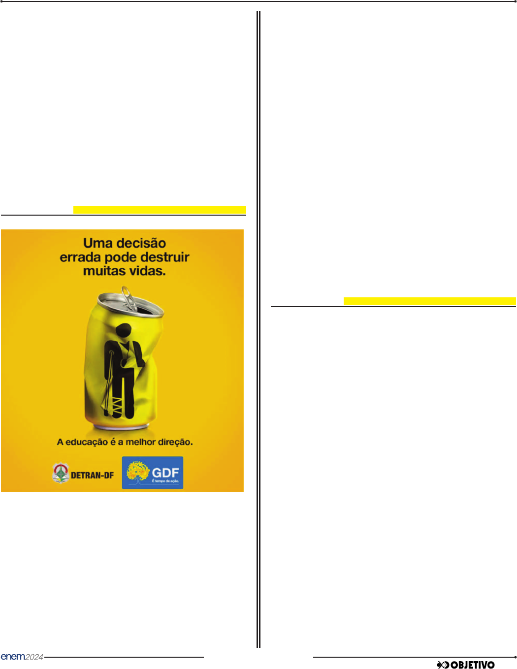 � as línguas são mecanismos que se transformam com o tempo, adaptando-se às necessidades comunicativas dos falantes. � instituições como a ABL têm o poder de promover alterações na língua independentemente das escolhas coletivas dos falantes. Resolução A língua, como elemento central na comunicação humana, se transforma e se adapta, não sendo, portanto, uma entidade estática. Resposta: D Disponível em: https://www.detran.df.gov.br/novas- campanhas-educativas-no-ar/ A propaganda do Detran do Distrito Federal aborda a relação entre consumo de álcool e direção. A intenção da campanha é � informar o interlocutor sobre os riscos de dirigir embriagado, associando a lata de cerveja a um sujeito com ferimentos. � denunciar ao público as consequências nocivas do consumo de álcool, que pode resultar em graves danos à saúde. � conscientizar a população em geral, que ainda não possui informações suficientes, sobre a com - binação de álcool e direção. � sensibilizar o interlocutor, afirmando que é necessário educar-se acerca dos riscos coletivos que o trânsito oferece. � influenciar o comportamento do interlocutor da propaganda, de modo a diminuir o número de acidentes de trânsito. Resolução Uma propaganda é, por definição, um gênero argumentativo. Dessa forma, procura convencer o interlocutor a adotar uma ideia; no texto, a intenção é evitar a combinação de álcool e direção. Resposta: E Aplicativo permite que indígenas da Amazônia enviem mensagens em seus idiomas Linklado foi lançado em agosto de 2022 e tem opções para 40 línguas indígenas da Amazônia Escrever mensagens em seus telefones foi, durante muito tempo, uma dor de cabeça para os povos indígenas da Amazônia. Agora, um aplicativo facilita a sua comunicação, ao colocar seus idiomas nativos ao seu alcance. Lançado em agosto de 2022, o “Linklado” – pa - lavra formada pela combinação de lin, em referência às línguas indígenas, e klado, derivado da palavra teclado – disponibiliza um teclado digital adequado para populações indígenas que vivem em áreas remotas da imensa região amazônica ou em centros urbanos. “O aplicativo Linklado traz assim muitas coisas boas para mim e para os povos indígenas”, disse Cristina Quirino Mariano, de 30 anos, da comunidade ticuna em entrevista à AFP. “Facilita muito porque antes a gente não conseguia escrever no celular”, afirmou, já que nestas comunidades nem todos dominam o português. QUESTÃO 07 QUESTÃO 08 11 LC • 1.o dia • RESOLUÇÕES ENEM_PROVA1_AMARELO_28_4_ALICE_2024 28/03/2024 16:20 Página 11