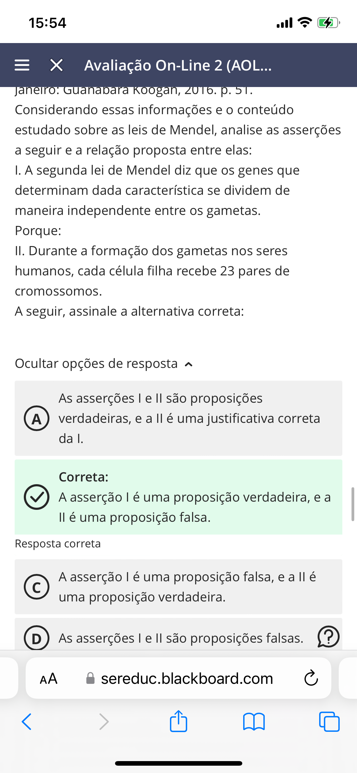 15:54 X Avaliação On-Line 2 (AOL... Guanabara Koogan, 2016. p. Considerando essas informações e o conteúdo estudado sobre as leis de Mendel, analise as asserções a seguir e a relação proposta entre elas: I. A segunda lei de Mendel diz que os genes que determinam dada característica se dividem de maneira independente entre os gametas. Porque: II. Durante a formação dos gametas nos seres humanos, cada célula filha recebe 23 pares de cromossomos. A seguir, assinale a alternativa correta: Ocultar opções de resposta ^ As asserções e são proposições A verdadeiras, e a é uma justificativa correta da I. Correta: A asserção I é uma proposição verdadeira, e a é uma proposição falsa. Resposta correta A asserção é uma proposição falsa, e a é uma proposição verdadeira. D As asserções e são proposições falsas. ? AA sereduc.blackboard.com