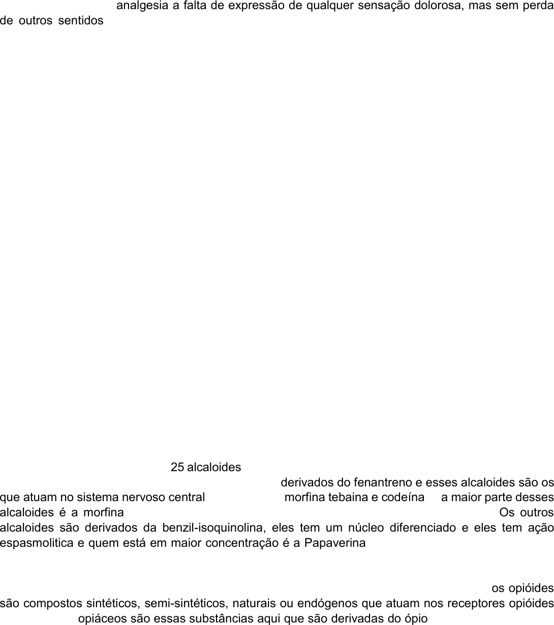 Analgésicos Opióides Histórico É considerada como analgesia a falta de expressão de qualquer sensação dolorosa, mas sem perda de outros sentidos, de outros modos de sensibilidade, a gente tenta sanar as diversas dores que acometem a humanidade. Quando a gente pensa em dor, a história mais antiga que se tem é o ópio, ali no século III a.c. já se conhecia o ópio que é retirado da papoula, ele já foi introduzido como fármaco no oriente, mas ele era utilizado em controle da disenteria, porque também não tinha atividades analgésicas ainda relacionadas. Só em 1680 é que se fez uma preparação líquida com o ópio e aí começou-se a utilizá-lo como analgésico porque o criador desta preparação disse que: “Dentre os remédios que Deus o Todo Poderoso houve por bem dar ao homem para aliviar-lhes os sofrimentos, nenhum é tão universal e tão eficaz quanto o ópio”. Então a partir de 1680 ele foi realmente utilizado com função analgésica. Ao mesmo tempo que se conheceu esse potencial analgésico, também foi ficando evidente o potencial tóxico desse composto, tanto era tóxico quanto viciante, quem já fazia uso desse composto já foi identificando esses dois pontos em relação a ele. Desde 1600 se utilizava o ópio, mas em 1830 que se isolou a morfina deste ópio, chamou-se de morfina por associação a Morfeu “deus grego dos sonhos”, e aí à morfina que foi atribuída essa capacidade analgésica, então se isolou na verdade um pó branco e amargo que se chamou de morfina. Quem isolou foi Friedrich, ele fez várias aulas e experiências de uso da morfina e já relatou esse efeito tóxico e viciante, então ele disse: “considere meu desejo chamar a atenção aos efeitos terríveis dessa nova substância, afim de que uma calamidade possa ser evitada”. Então embora o grande potencial analgésico, já se sabia desde então que ela também tinha um potencial para vicio e um potencial que era tóxico e o próprio cara que isolou, relatou e fez essa auto experiência. Em 1933 os químicos da companhia Macfarlane-Smith da Escócia, isolaram e purificaram a morfina em escala comercial e a partir disso, em 1853 foi comercializada uma seringa com uma solução injetável de morfina, então a morfina começou a ser comercializada após esse período. Então a seringa foi criada em 1853, só se sabia até agora que era um pó branco, em 1881 identificou-se os principais grupos funcionais da morfina. Em 1925 foi que surgiu a primeira proposição da estrutura da morfina. Em 1952 a síntese total da morfina. Em 1968 é que realmente se chegou à estrutura que hoje a gente tem da morfina, porque foi quando começaram a surgir as técnicas de validação de cristalografia e raio x. Então Sir Robert propôs a estrutura da morfina de como a gente conhece hoje, há um longo caminho entre o uso e a identificação real do composto. O uso foi em 1600 e a identificação do composto só foi em 1960. Observando o ópio que foi inicialmente utilizado, observa que ¼ do peso daquele látex que é o ópio é de alcaloide, ele é composto de 25 alcaloides, mas esses alcaloides estão diferenciados em dois grupos de acordo com o número básico deles, a gente tem derivados do fenantreno e esses alcaloides são os que atuam no sistema nervoso central, dentre eles a morfina tebaina e codeína, e a maior parte desses alcaloides é a morfina, então a quantidade de morfina é muito maior do que os outros. Os outros alcaloides são derivados da benzil-isoquinolina, eles tem um núcleo diferenciado e eles tem ação espasmolitica e quem está em maior concentração é a Papaverina, essa ação espasmolítica é o que justifica que no início o ópio era utilizado para tratamento de disenterias porque também tem alcaloides que tem essa propriedade espasmolítica. É importante a gente diferenciar dos opiaceos e os opióides é que os opiáceos e os opióides são dois semelhantes mas que dizem coisas diferentes, os opióides são compostos sintéticos, semi-sintéticos, naturais ou endógenos que atuam nos receptores opióides enquanto que opiáceos são essas substâncias aqui que são derivadas do ópio, então quando a gente fala em opióide a gente está envolvendo tudo que atua naquele receptor, e opiáceo apenas o que saiu da planta, do ópio. debor Realce debor Realce debor Realce debor Realce debor Realce debor Realce debor Realce debor Realce Em relação aos receptores, só em volta de 1970 é que foram observados que a membrana de células nervosas interagiam com receptores, interagiam com os opiódes. A morfina e os derivados sintéticos não eram ligantes naturais, então ficou se utilizando por muito tempo e o corpo devia produzir alguma coisa para ligar com aquele receptor que existia na membrana, porque não era possível que o corpo tivesse receptores para uma molécula que um dia ia ser descoberta e que é externa a ele, então tinha que existir um opióide endógeno, alguma coisa endógena que ligasse naquele receptor e que justificasse então a sua existência. Então em 1975, muito depois do uso da morfina é que foi feito o isolamento dos opióides endógenos, substâncias endógenas que tinham essa atividade opióide, que se ligavam a esses receptores, onde os da morfina também ligava. Então foi isolado o encéfalo de 10 espécies animais, eram substâncias que tem propriedade similar à morfina e elas foram chamadas de encefalinas, então os opióides endógenos foram posterior à descoberta e uso da morfina. Mecanismo de ação dos opióides De forma geral, eles se complexam com os receptores do nosso sistema nervoso central, também da medula espinhal. Esses receptores são acoplados à proteína g, eles abrem canais de potássio e fecham canais de cálcio e com isso eles diminuem a transmissão de alguns neurotransmissores como a GABA, glutamato e glicina, isso faz uma supressão do sinal da dor, então ele suprime ou reduz a transmissão do sinal de dor