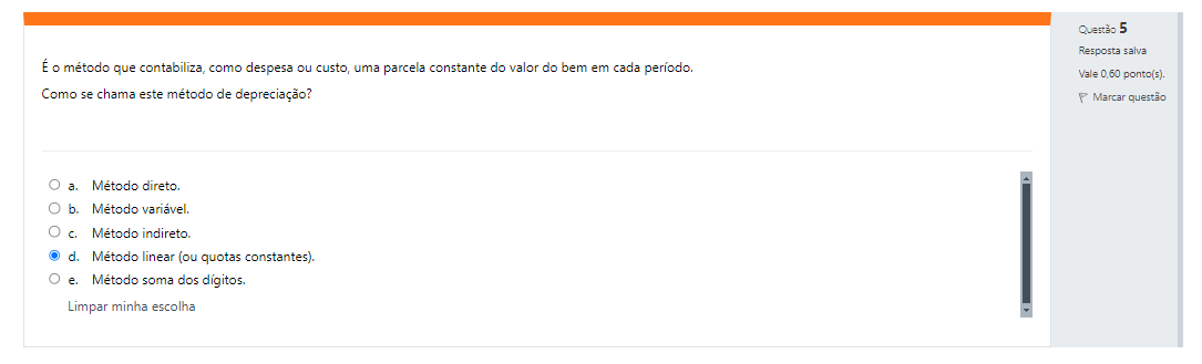 Questão 5 Resposta sa E método que contabiliza, como despesa ou custo, uma parcela constante do valor do bem em cada Vale 0.60 pc Como se chama este método de depreciação? Marcar a. Método direto. b. Método variável. C. Método indireto. d. Método linear (ou quotas constantes). e. Método soma dos dígitos. Limpar minha escolha