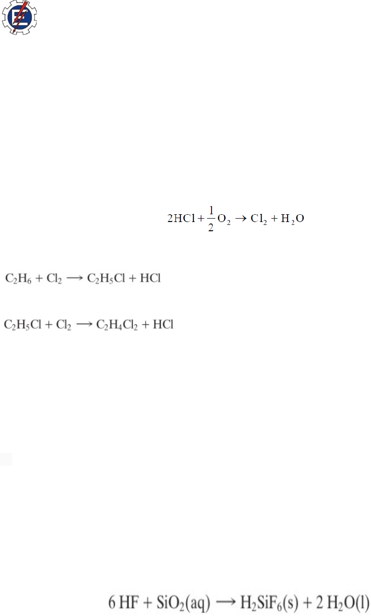 UNIFEI – Universidade Federal de Itajubá ENGENHARIA QUÍMICA Terceira lista de exercícios (valendo 1,0 ponto na P2) 1. No processo Deacon para a fabricação de cloro, HCl e O2 reagem para formar Cl2 e H2O. Alimenta-se o ar (79% molar N2, 21% O2) o suficiente para fornecer 35% de excesso de oxigênio, e a conversão fracional de HCl é 85%. (a) Calcule as frações molares dos componentes na corrente de produto usando balanços de espécies atômicas. (b) Calcule de novo as frações molares na corrente de produto usando agora a extensão da reação. 2. O etano é clorado em um reator contínuo. Parte do produto, monocloroetano, é depois clorado em uma reação paralela não desejada. (a) Tome como base 100 mol C2H5Cl produzido. Admita que a alimentação contém apenas etano e cloro e que todo o cloro é consumido; faça uma análise dos graus de liberdade baseada nos balanços de espécies atômicas. (b) O reator é projetado para fornecer uma conversão de 15% de etano e uma seletividade de 14 mol C2H5Cl/ mol C2H4Cl2, com uma quantidade desprezível de cloro no produto gasoso. Calcule a razão de alimentação (mol Cl2/mol C2H6) e o rendimento fracional de monocloroetano. 3. O fluoreto de cálcio sólido (CaF2) reage com ácido sulfúrico para formar sulfato de cálcio sólido e fluoreto de hidrogênio gasoso. O HF é então dissolvido em água para formar ácido fluorídrico. Uma fonte de fluoreto de cálcio é o minério de fluorita, que contém 96,0% em massa de CaF2 e 4,0% de SiO2. Em um processo típico de produção de ácido fluorídrico, o minério de fluorita reage com uma solução aquosa 93% em massa de ácido sulfúrico, fornecida com 15% de excesso em relação à quantidade estequiométrica. Noventa e cinco por cento do minério se dissolvem no ácido. Parte do HF formado reage com o silício dissolvido através da reação O fluoreto de hidrogênio que deixa o reator é subseqüentemente dissolvido em água suficiente para produzir ácido fluorídrico 60,0% em massa. Calcule a quantidade de minério de fluorita necessária para produzir uma tonelada de ácido. 4. Um gás contém 80,0% em massa de propano, 15,0% de n-butano e o resto de H2O. (a) Calcule a composição molar deste gás em base seca e em base úmida, e a razão (mol H2O/mol ar seco). (b)Se 100 kg/h deste combustível são queimados com 30% de ar em excesso, qual será a vazão de ar de alimentação requerida (kmol/h)? 5. Um gás natural contendo uma mistura de metano, etano, propano e butano é queimado em uma fornalha com excesso de ar. (a) Cem kmol/h de um gás contendo 94,4% molar de metano, 3,40% de etano, 0,60% de propano e 0,50% de butano são queimados com 17% de excesso de ar. Calcule a vazão molar de ar necessária. 6. Uma mistura 75% molar de propano e 25% de hidrogênio é queimada com 25% de ar em excesso. São atingidas conversões fracionais de 90% do propano e 85% do hidrogênio; do propano que reage, 95% formam CO2 e o resto forma CO. O produto gasoso quente passa através de uma caldeira, na qual o calor transferido do gás converte a água da caldeira em vapor de água. Calcule a concentração de CO (ppm) no gás de chaminé. Base de cálculo: 100 mol de gás