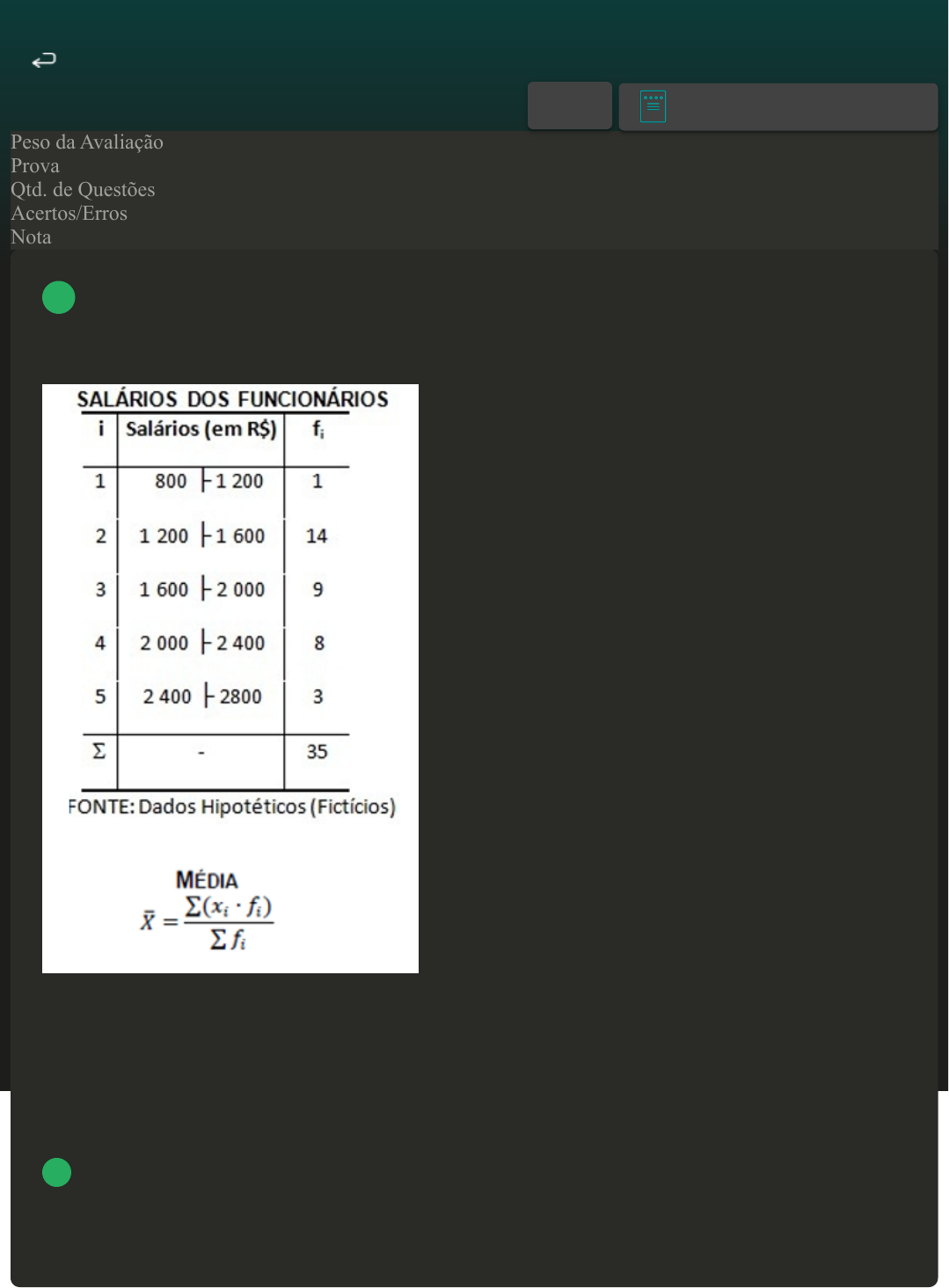 Prova Impressa GABARITO | Avaliação II - Individual (Cod.:990763) Peso da Avaliação 2,00 Prova 92676409 Qtd. de Questões 10 Acertos/Erros 10/0 Nota 10,00 Determine a média do seguinte agrupamento em classes, referente aos salários dos funcionários da Empresa FORTALEZA Ltda.: Assinale a alternativa CORRETA: A Média = R$ 1.985,38. B Média = R$ 2.015,68. C Média = R$ 1.813,21. D Média = R$ 1.777,14. E Média = R$ 1.974,24. VOLTAR A+ Alterar modo de visualização 1 Com base nos dados brutos a seguir, organize um ROL e determine o valor da mediana do valores : 16 - 22 - 17 - 13 - 31 - 12 - 14 - 9 - 30 - 4. Assinale a alternativa CORRETA que representa a mediana: A A mediana é 17. B A mediana é 13. C A mediana é 16. D A mediana é 19. E A mediana é 15. A tabela representa o agrupamento em classes, das idades (em anos) de um grupo de usuários cadastrados no plano de saúde XYZ: 2 3 Qual a média aritmética e a moda das idades do grupo de usuários desse plano de saúde? A Média = 58,92 anos e moda = 57,81 anos. B Média = 57,18 anos e moda = 59,16 anos. C Média = 54,63 anos e moda = 53,15 anos. D Média = 58,28 anos e moda = 59,32 anos. E Média = 52,89 anos e moda = 55,45 anos. Determinado produto utilizado na construção civil é vendido em milhares de unidades. Doze lojas de materiais de construção foram pesquisadas quanto ao valor desse produto e foram obtidos os seguintes valores (em reais): 980, 940, 1020, 980, 950, 1000, 900, 940, 1100, 980, 1120, 960. Qual o custo médio, em reais, desse produto, considerando as lojas pesquisadas? A O custo médio é de R$ 989,17. B O custo médio é de R$ 968,33. C O custo médio é de R$ 1.015,00. D O custo médio é de R$ 932,67. E O custo médio é de R$ 952,33. Observe a distribuição de frequências das médias de um grupo de alunos em intervalos de classes: Sobre os dados da tabela apresentada, assinale a alternativa CORRETA: A A frequência acumulada da 2ª classe é 24. B O ponto médio da 2ª classe é 18. C A frequência total da distribuição é 10. D A moda da distribuição encontra-se na 1ª classe. E A moda da distribuição encontra-se na 4ª classe. 4 5 As medidas de tendência central expressam a posição da distribuição com relação ao eixo dos valores da situação estudada. Com relação à mediana, classifique V para as sentenças verdadeiras e F para as falsas: ( ) A mediana pode ser considerada uma separatriz, pois seria o mesmo que calcular C50, que nos daria 50% dos dados para analisar. ( ) Ao fazer uma análise de dados, a mediana pode ser utilizada no lugar da média, pois sempre apresentarão o mesmo resultado. ( ) Para o cálculo da mediana pela fórmula estudada, deve-se, considerar a frequência acumulada para encontrar e determinar a classe mediana. Assinale a alternativa que apresenta a sequência CORRETA: A F - F - V. B V - V - F. C V - V - V. D V - F - V. E F - V - F. Foi realizada uma enquete sobre o investimento semanal das famílias em lazer. Os resultados estão representados pela distribuição de frequências representada a seguir: O que podemos afirmar acerca do investimento médio em lazer pelas famílias pesquisadas? A É superior a R$ 100,00. B Está entre R$ 50,00 e R$ 75,00. C Está entre R$ 75,00 e R$ 90,00. D É superior a R$ 200,00. E É menor que R$ 50,00. 6 7 A média aritmética, a mediana e a moda são as medidas de tendência central mais comuns e importantes. Sobre essas três tendências centrais, avalie as asserções a seguir e a relação proposta entre elas: I- A escolha da medida de tendência central para a pesquisa que está sendo realizada depende, em princípio, dos objetivos da pesquisa. PORQUE II- Enquanto a média é influenciada pelos valores extremos, a moda e a mediana não são afetadas por tais valores. A respeito dessas asserções, assinale a opção correta: A As asserções I e II são falsas. B As asserções I e II são verdadeiras, mas a II não é uma justificativa correta da I. C A asserção I é uma proposição falsa e a II é uma proposição verdadeira. D A asserção I é uma proposição verdadeira e a II é uma proposição falsa. E As asserções I e II são verdadeiras, e a II é uma justificativa correta da I. Uma pizzaria pretende contratar um pizzaiolo e verificou que os salários/hora de 4 profissionais em sua região são: R$ 25,00, R$ 30,00, R$ 35,00 e R$ 38,00. Nessas condições, qual o salário/hora médio dos pizzaiolos da região pesquisada? A Salário/hora médio é R$ 32,50. B Salário/hora médio é R$ 34,00. C Salário/hora médio é R$ 32,00. D Salário/hora médio é R$ 31,00. E Salário/hora médio é R$ 35,00. Determinado eletrodoméstico é vendido em 15 lojas de uma cidade. Ao realizar a pesquisa de preços, uma pessoa interessada em adquirir tal bem obteve os seguintes valores, em reais: 960, 1030, 945, 960, 1000, 950, 930, 1020, 1010, 980, 940, 950, 890, 930, 960. Com base nesses dados, qual o preço médio e a moda do preço, em reais, do eletrodoméstico pesquisado? A Média = R$ 985,12 e moda = R$ 960,00. B Média = R$ 972,87 e moda = R$ 950,00. 8 9 10 C Média = R$ 1005,24 e moda = R$ 980,00. D Média = R$ 1025,14 e moda = R$ 950,00 E Média = R$ 963,67 e moda = R$ 960,00. Imprimir