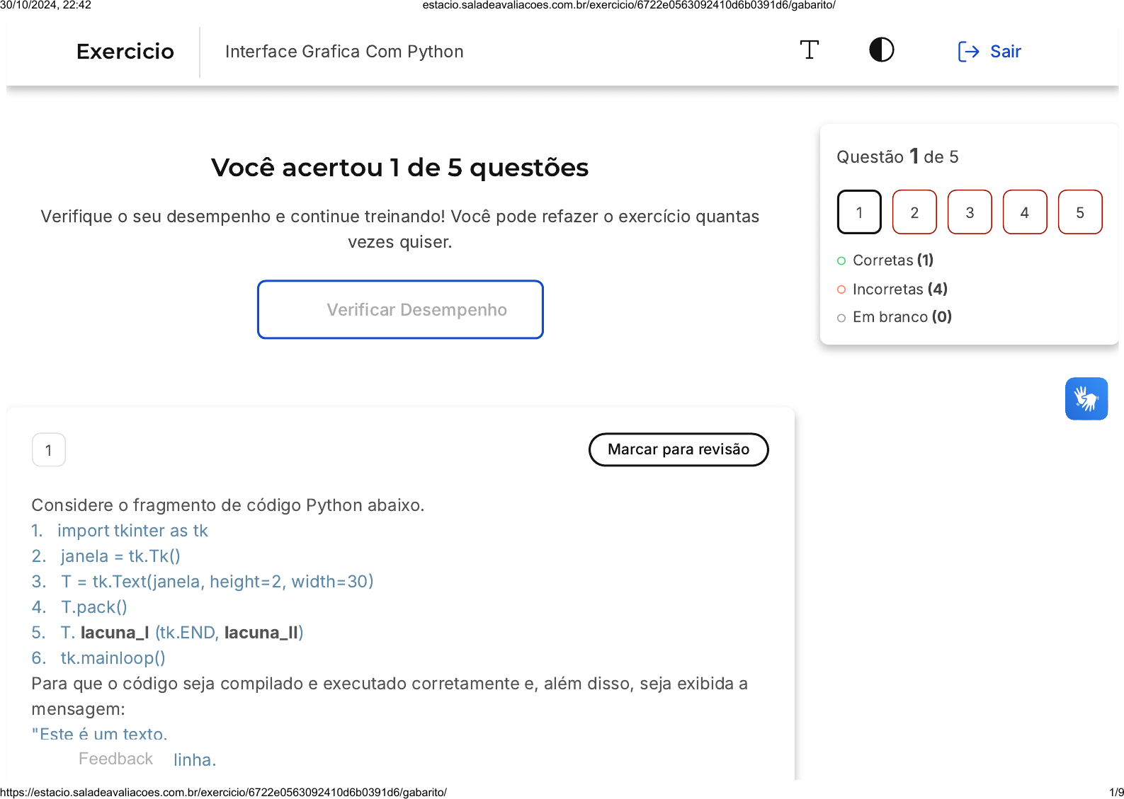 Você acertou 1 de 5 questões Verifique o seu desempenho e continue treinando! Você pode refazer o exercício quantas vezes quiser. Verificar Desempenho 1 Marcar para revisão Considere o fragmento de código Python abaixo. 1. import tkinter as tk 2. janela = tk.Tk() 3. T = tk.Text(janela, height=2, width=30� 4. T.pack() 5. T. lacuna_I (tk.END, lacuna_II) 6. tk.mainloop() Para que o código seja compilado e executado corretamente e, além disso, seja exibida a mensagem: "Este é um texto. Esta é a segunda linha. Questão 1 de 5 Corretas �1� Incorretas �4� Em branco �0� 1 2 3 4 5 Exercicio Interface Grafica Com Python Sair Feedback 30/10/2024, 22:42 estacio.saladeavaliacoes.com.br/exercicio/6722e0563092410d6b0391d6/gabarito/ https://estacio.saladeavaliacoes.com.br/exercicio/6722e0563092410d6b0391d6/gabarito/ 1/9 A B C D E Esta é a terceira linha." as palavras lacuna_I, e lacuna_II devem ser substituídas, respectivamente, por: text e "Este é um texto. Esta é a segunda linha. \nEsta é a terceira linha.\n") insert e "Este é um texto.\nEsta é a segunda linha. \nEsta é a terceira linha.\n") insert e "Este é um texto. Esta é a segunda linha. \nEsta é a terceira linha.\n") text e "Este é um texto. Esta é a segunda linha. Esta é a terceira linha.\n") Nenhuma das outras alternativas. Resposta correta Parabéns, você selecionou a alternativa correta. Confira o gabarito comentado! Gabarito Comentado A resposta correta é: insert e "Este é um texto.\nEsta é a segunda linha. \nEsta é a terceira linha.\n") 30/10/2024, 22:42 estacio.saladeavaliacoes.com.br/exercicio/6722e0563092410d6b0391d6/gabarito/ https://estacio.saladeavaliacoes.com.br/exercicio/6722e0563092410d6b0391d6/gabarito/ 2/9 A B C 2 Marcar para revisão O Python adquiriu destaque na área de desenvolvimento, em parte, pela sua simplicidade, mas também por possuir diversos pacotes e frameworks que facilitam, por exemplo, a construção de aplicações de bancos de dados, ciência de dados e construção de interfaces. A quantidade de recursos associada ao Python auxilia o desenvolvedor a construir aplicações padronizadas, adaptadas às funções de negócio e preparadas para mudanças, de forma mais rápida e com menor custo. Tais características fazem do Python uma linguagem apropriada ao desenvolvimento rápido de projetos de software. Com base no texto apresentado, conclui-se que A linguagem Python estabelece padrões de simplicidade que exigem dos pacotes e frameworks de terceiros adaptação estrutural. A linguagem Python permite criar rapidamente aplicações flexíveis que permitem o desenvolvedor re-projetar conforme a necessidade. A linguagem Python possui mecanismos embutidos para construção de interfaces ricas, padronizando assim os projetos de software. 30/10/2024, 22:42 estacio.saladeavaliacoes.com.br/exercicio/6722e0563092410d6b0391d6/gabarito/ https://estacio.saladeavaliacoes.com.br/exercicio/6722e0563092410d6b0391d6/gabarito/ 3/9 D E A linguagem Python possui uma grande quantidade de recursos, o que torna a adaptação às funções de negócio mais demorada. A linguagem Python se destaca pela quantidade de pacotes e frameworks, no entanto, a aplicação do RAD fica prejudicada devido à falta de padronização. Resposta incorreta Opa! A alternativa correta é a letra B. Confira o gabarito comentado! Gabarito Comentado A alternativa correta é a B, que afirma que a linguagem Python permite criar rapidamente aplicações flexíveis que permitem o desenvolvedor re-projetar conforme a necessidade. Isso é verdadeiro, pois o texto destaca a simplicidade e a flexibilidade do Python, além da grande quantidade de recursos disponíveis, que auxiliam o desenvolvedor a construir aplicações adaptáveis e preparadas para mudanças de forma rápida e com menor custo. As demais alternativas são incorretas. A alternativa A sugere que o Python exige adaptação estrutural dos pacotes e frameworks de terceiros, o que não é mencionado no texto. A alternativa C afirma que o Python possui mecanismos embutidos para construção de interfaces ricas, o que também não é mencionado no texto. A alternativa D sugere que a grande quantidade de recursos do Python torna a adaptação às funções de negócio mais demorada, o que contradiz o texto. Por fim, a alternativa E afirma que a aplicação do RAD fica prejudicada devido à falta de padronização, o que é contrário ao que o texto apresenta, pois o Python é destacado 30/10/2024, 22:42 estacio.saladeavaliacoes.com.br/exercicio/6722e0563092410d6b0391d6/gabarito/ https://estacio.saladeavaliacoes.com.br/exercicio/6722e0563092410d6b0391d6/gabarito/ 4/9 A B C D E pela sua simplicidade e flexibilidade, características que favorecem a aplicação do RAD. 3 Marcar para revisão A biblioteca tkinter possui diversos componentes que devem ser usados em determinadas situações que auxiliem o usuário na realização de uma tarefa. Selecione a opção CORRETA que apresenta o componente do tkinter mais adequado para tratar a situação em que uma mensagem deve ser exibida para o usuário logo depois que ele realizou uma tarefa e que ele precisa fazer algum tipo de confirmação: Dialog Checkbox Label Button Message 30/10/2024, 22:42 estacio.saladeavaliacoes.com.br/exercicio/6722e0563092410d6b0391d6/gabarito/ https://estacio.saladeavaliacoes.com.br/exercicio/6722e0563092410d6b0391d6/gabarito/ 5/9 Resposta incorreta Opa! A alternativa correta é a letra A. Confira o gabarito comentado! Gabarito Comentado O componente "Dialog" da biblioteca tkinter é o mais adequado para a situação descrita no enunciado. Isso ocorre porque o "Dialog" é um componente que permite a exibição de uma mensagem para o usuário e aguarda uma resposta deste, sendo ideal para situações em que é necessário fazer uma confirmação após a realização de uma tarefa. 4 Marcar para revisão Considere o fragmento de código Python abaixo. from kivy.app import App from kivy.uix.button