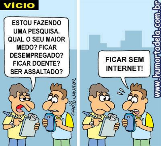 sonhos e expectativas. Mesmo roubada, traída e judiada, posso rezar e, às vezes, é isso o que me conforta”. (Marília Litvin, via Internet. In: Super Interessante - Edição 185, fevereiro, 2003. Cartas dos leitores.) 4. A carta do leitor é frequentemente publicada em jornais, revistas e sites variados. Ela traz pontos de vista dos leitores, com base na matéria veiculada anteriormente em algum desses canais. Nesse sentido, o propósito principal desse gênero textual é a) opinar. b) descrever. c) explicar. d) aconselhar. e) narrar. 5. No último período da Carta do leitor: “Mesmo roubada, traída e judiada, posso rezar e, às vezes, é isso o que me conforta.”, podemos identificar como função da linguagem predominante a: a) função referencial. b) função fática. c) função emotiva. d) função metalinguística. e) função poética. A questão 6 refere-se à charge abaixo: 6. A charge permite concluir que a) a postura crítica se manifesta pelo emprego das interrogativas. b) a afirmação “ficar sem internet” é demonstração assumida de uma postura dependente. c) as pessoas denunciam a problemática social através de entrevistas. d) nosso país apresenta um grande número de internautas. e) o enunciador desqualifica-se, ao afirmar que “ficar sem internet” é o seu maior medo.