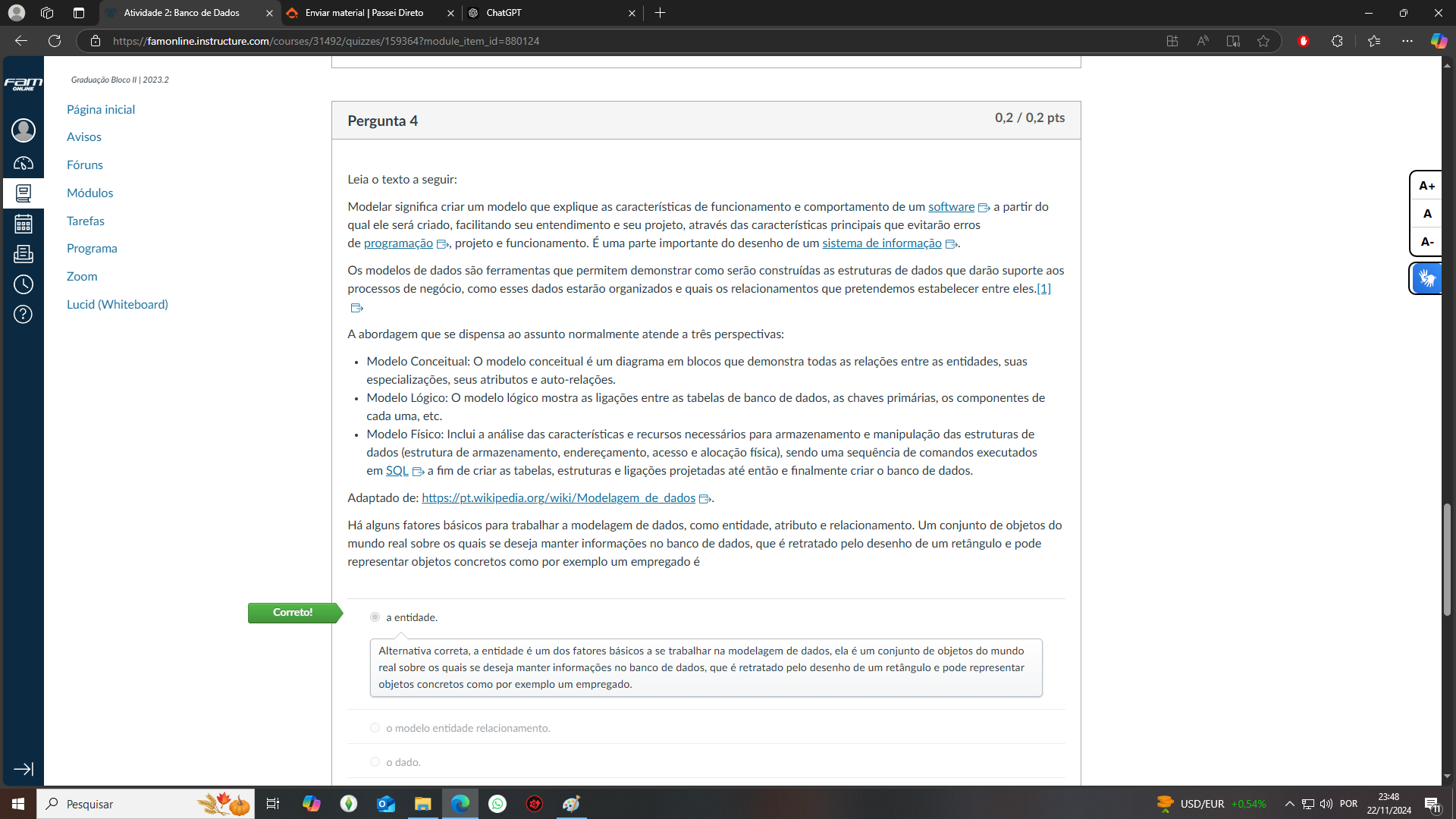Atividade 2: Banco de Dados Enviar materia Passei Direta ChatGPT + Graduação Bloco 2023.2 Página inicial Pergunta 4 0,2 / 0,2 pts Avisos Fóruns Leia o texto a seguir: A+ Módulos Modelar significa criar um modelo que explique as características de funcionamento e comportamento de um software a partir do A Tarefas qual ele será criado, facilitando seu entendimento e seu projeto, através das características principais que evitarão erros de programação projeto e É uma parte importante do desenho de um sistema de informação A- Programa Zoom Os modelos de dados são ferramentas que permitem como serão construídas as estruturas de dados que darão suporte aos processos de negócio, como esses dados estarão organizados e quais os relacionamentos que pretendemos estabelecer entre Lucid (Whiteboard) ? A abordagem que se dispensa ao assunto normalmente atende a três perspectivas: Modelo Conceitual: modelo conceitual é um diagrama em blocos que demonstra todas as relações entre as entidades, suas especializações, seus atributos e auto-relações. Modelo Lógico: modelo lógico mostra as ligações entre as tabelas de banco de as chaves primárias, os componentes de cada uma, etc. Modelo Físico: Inclui a análise das características e recursos necessários para armazenamento e manipulação das estruturas de dados (estrutura de armazenamento, endereçamento, acesso e alocação física), sendo uma sequência de comandos executados em a fim de criar as tabelas, estruturas e ligações projetadas até então e finalmente criar o banco de Adaptado de: https://pt.wikipedia.org/wiki/Modelagem de dados Há alguns fatores básicos para trabalhar a modelagem de como entidade, atributo e Um conjunto de objetos do mundo real sobre os quais se deseja manter informações no banco de que é retratado pelo desenho de um retângulo e pode representar objetos concretos como por exemplo um empregado é Correto! Alternativa correta, a entidade é um dos fatores básicos a se trabalhar na modelagem de ela é um conjunto de objetos do mundo real sobre os quais se deseja manter informações no banco de dados, que é retratado pelo desenho de um retângulo e pode representar objetos concretos como por exemplo um empregado. modelo entidade 23:48 Pesquisar USD/EUR +0,54% POR 22/11/2024