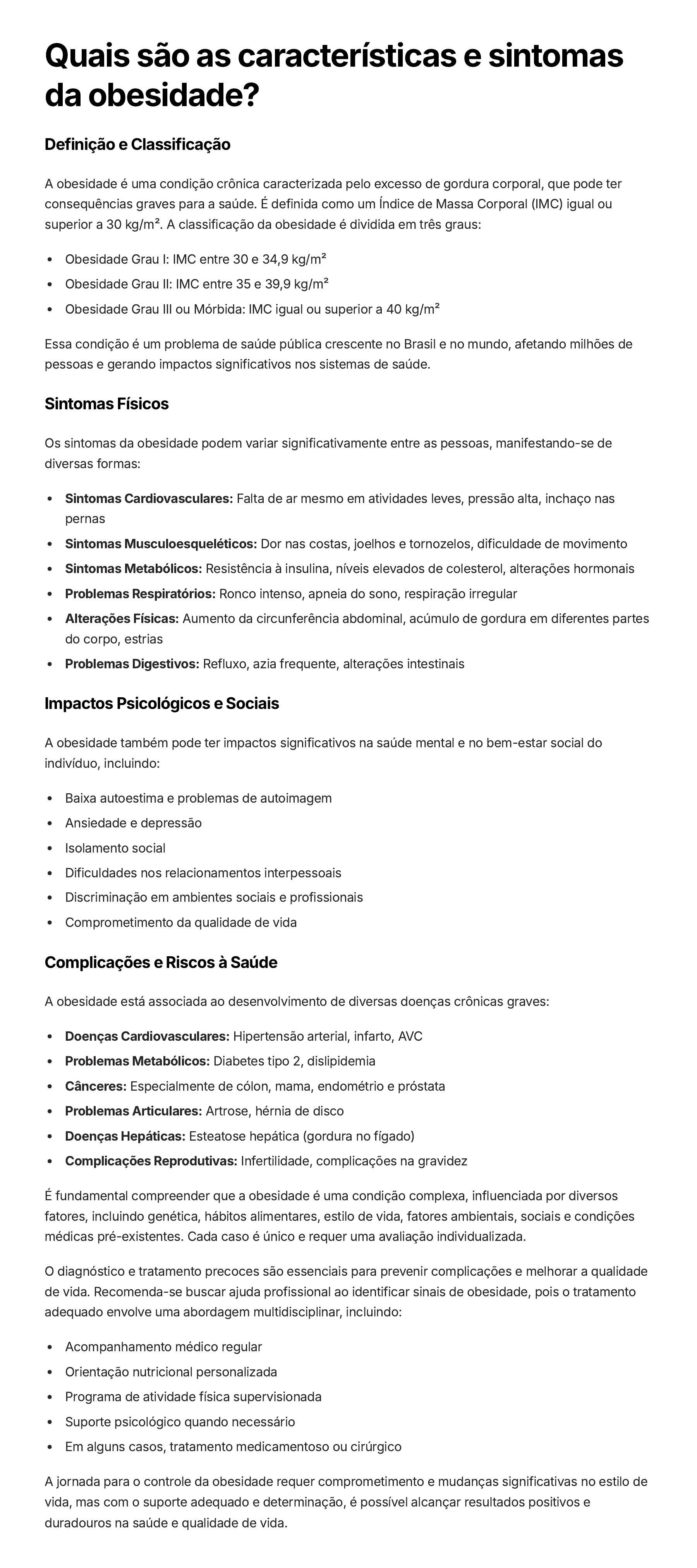 Quais são as características e sintomas da obesidade? Definição e Classificação A obesidade é uma condição crônica caracterizada pelo excesso de gordura corporal, que pode ter consequências graves para a saúde. É definida como um Índice de Massa Corporal (IMC) igual ou superior a 30 kg/m². A classificação da obesidade é dividida em três graus: Obesidade Grau I: IMC entre 30 e 34,9 kg/m² Obesidade Grau II: IMC entre 35 e 39,9 kg/m² Obesidade Grau III ou Mórbida: IMC igual ou superior a 40 kg/m² Essa condição é um problema de saúde pública crescente no Brasil e no mundo, afetando milhões de pessoas e gerando impactos significativos nos sistemas de saúde. Sintomas Físicos Os sintomas da obesidade podem variar significativamente entre as pessoas, manifestando-se de diversas formas: Sintomas Cardiovasculares: Falta de ar mesmo em atividades leves, pressão alta, inchaço nas pernas Sintomas Musculoesqueléticos: Dor nas costas, joelhos e tornozelos, dificuldade de movimento Sintomas Metabólicos: Resistência à insulina, níveis elevados de colesterol, alterações hormonais Problemas Respiratórios: Ronco intenso, apneia do sono, respiração irregular Alterações Físicas: Aumento da circunferência abdominal, acúmulo de gordura em diferentes partes do corpo, estrias Problemas Digestivos: Refluxo, azia frequente, alterações intestinais Impactos Psicológicos e Sociais A obesidade também pode ter impactos significativos na saúde mental e no bem-estar social do indivíduo, incluindo: Baixa autoestima e problemas de autoimagem Ansiedade e depressão Isolamento social Dificuldades nos relacionamentos interpessoais Discriminação em ambientes sociais e profissionais Comprometimento da qualidade de vida Complicações e Riscos à Saúde A obesidade está associada ao desenvolvimento de diversas doenças crônicas graves: Doenças Cardiovasculares: Hipertensão arterial, infarto, AVC Problemas Metabólicos: Diabetes tipo 2, dislipidemia Cânceres: Especialmente de cólon, mama, endométrio e próstata Problemas Articulares: Artrose, hérnia de disco Doenças Hepáticas: Esteatose hepática (gordura no fígado) Complicações Reprodutivas: Infertilidade, complicações na gravidez É fundamental compreender que a obesidade é uma condição complexa, influenciada por diversos fatores, incluindo genética, hábitos alimentares, estilo de vida, fatores ambientais, sociais e condições médicas pré-existentes. Cada caso é único e requer uma avaliação individualizada. O diagnóstico e tratamento precoces são essenciais para prevenir complicações e melhorar a qualidade de vida. Recomenda-se buscar ajuda profissional ao identificar sinais de obesidade, pois o tratamento adequado envolve uma abordagem multidisciplinar, incluindo: Acompanhamento médico regular Orientação nutricional personalizada Programa de atividade física supervisionada Suporte psicológico quando necessário Em alguns casos, tratamento medicamentoso ou cirúrgico A jornada para o controle da obesidade requer comprometimento e mudanças significativas no estilo de vida, mas com o suporte adequado e determinação, é possível alcançar resultados positivos e duradouros na saúde e qualidade de vida.