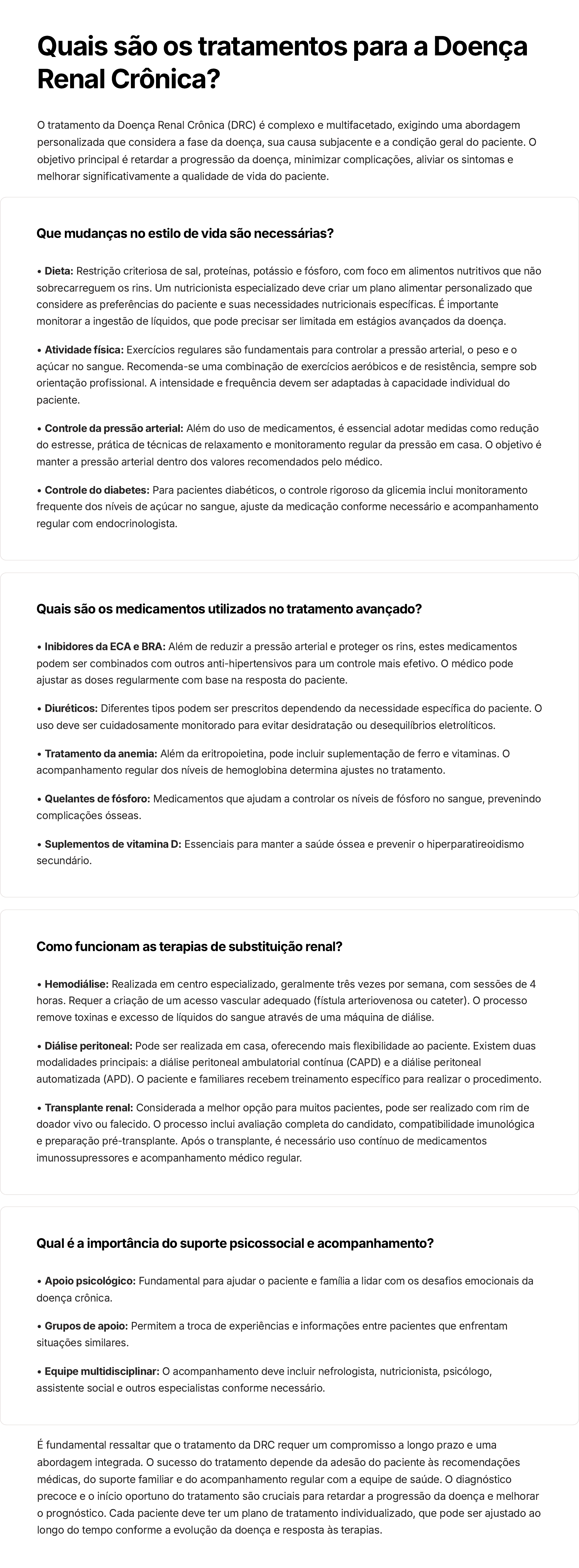 Quais são os tratamentos para a Doença Renal Crônica? O tratamento da Doença Renal Crônica (DRC) é complexo e multifacetado, exigindo uma abordagem personalizada que considera a fase da doença, sua causa subjacente e a condição geral do paciente. O objetivo principal é retardar a progressão da doença, minimizar complicações, aliviar os sintomas e melhorar significativamente a qualidade de vida do paciente. É fundamental ressaltar que o tratamento da DRC requer um compromisso a longo prazo e uma abordagem integrada. O sucesso do tratamento depende da adesão do paciente às recomendações médicas, do suporte familiar e do acompanhamento regular com a equipe de saúde. O diagnóstico precoce e o início oportuno do tratamento são cruciais para retardar a progressão da doença e melhorar o prognóstico. Cada paciente deve ter um plano de tratamento individualizado, que pode ser ajustado ao longo do tempo conforme a evolução da doença e resposta às terapias. Que mudanças no estilo de vida são necessárias? • Dieta: Restrição criteriosa de sal, proteínas, potássio e fósforo, com foco em alimentos nutritivos que não sobrecarreguem os rins. Um nutricionista especializado deve criar um plano alimentar personalizado que considere as preferências do paciente e suas necessidades nutricionais específicas. É importante monitorar a ingestão de líquidos, que pode precisar ser limitada em estágios avançados da doença. • Atividade física: Exercícios regulares são fundamentais para controlar a pressão arterial, o peso e o açúcar no sangue. Recomenda-se uma combinação de exercícios aeróbicos e de resistência, sempre sob orientação profissional. A intensidade e frequência devem ser adaptadas à capacidade individual do paciente. • Controle da pressão arterial: Além do uso de medicamentos, é essencial adotar medidas como redução do estresse, prática de técnicas de relaxamento e monitoramento regular da pressão em casa. O objetivo é manter a pressão arterial dentro dos valores recomendados pelo médico. • Controle do diabetes: Para pacientes diabéticos, o controle rigoroso da glicemia inclui monitoramento frequente dos níveis de açúcar no sangue, ajuste da medicação conforme necessário e acompanhamento regular com endocrinologista. Quais são os medicamentos utilizados no tratamento avançado? • Inibidores da ECA e BRA: Além de reduzir a pressão arterial e proteger os rins, estes medicamentos podem ser combinados com outros anti-hipertensivos para um controle mais efetivo. O médico pode ajustar as doses regularmente com base na resposta do paciente. • Diuréticos: Diferentes tipos podem ser prescritos dependendo da necessidade específica do paciente. O uso deve ser cuidadosamente monitorado para evitar desidratação ou desequilíbrios eletrolíticos. • Tratamento da anemia: Além da eritropoietina, pode incluir suplementação de ferro e vitaminas. O acompanhamento regular dos níveis de hemoglobina determina ajustes no tratamento. • Quelantes de fósforo: Medicamentos que ajudam a controlar os níveis de fósforo no sangue, prevenindo complicações ósseas. • Suplementos de vitamina D: Essenciais para manter a saúde óssea e prevenir o hiperparatireoidismo secundário. Como funcionam as terapias de substituição renal? • Hemodiálise: Realizada em centro especializado, geralmente três vezes por semana, com sessões de 4 horas. Requer a criação de um acesso vascular adequado (fístula arteriovenosa ou cateter). O processo remove toxinas e excesso de líquidos do sangue através de uma máquina de diálise. • Diálise peritoneal: Pode ser realizada em casa, oferecendo mais flexibilidade ao paciente. Existem duas modalidades principais: a diálise peritoneal ambulatorial contínua (CAPD) e a diálise peritoneal automatizada (APD). O paciente e familiares recebem treinamento específico para realizar o procedimento. • Transplante renal: Considerada a melhor opção para muitos pacientes, pode ser realizado com rim de doador vivo ou falecido. O processo inclui avaliação completa do candidato, compatibilidade imunológica e preparação pré-transplante. Após o transplante, é necessário uso contínuo de medicamentos imunossupressores e acompanhamento médico regular. Qual é a importância do suporte psicossocial e acompanhamento? • Apoio psicológico: Fundamental para ajudar o paciente e família a lidar com os desafios emocionais da doença crônica. • Grupos de apoio: Permitem a troca de experiências e informações entre pacientes que enfrentam situações similares. • Equipe multidisciplinar: O acompanhamento deve incluir nefrologista, nutricionista, psicólogo, assistente social e outros especialistas conforme necessário.