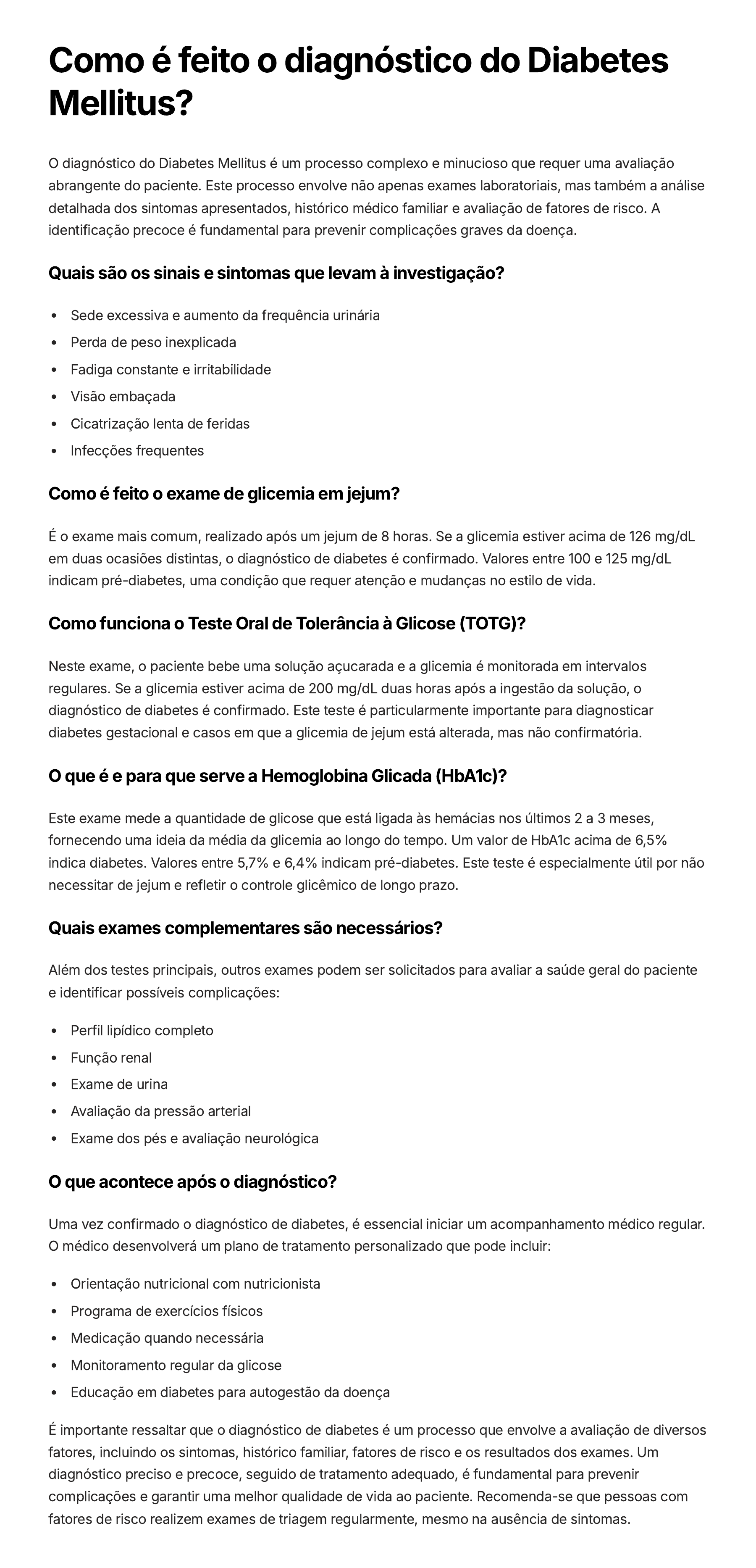 Como é feito o diagnóstico do Diabetes Mellitus? O diagnóstico do Diabetes Mellitus é um processo complexo e minucioso que requer uma avaliação abrangente do paciente. Este processo envolve não apenas exames laboratoriais, mas também a análise detalhada dos sintomas apresentados, histórico médico familiar e avaliação de fatores de risco. A identificação precoce é fundamental para prevenir complicações graves da doença. Quais são os sinais e sintomas que levam à investigação? Sede excessiva e aumento da frequência urinária Perda de peso inexplicada Fadiga constante e irritabilidade Visão embaçada Cicatrização lenta de feridas Infecções frequentes Como é feito o exame de glicemia em jejum? É o exame mais comum, realizado após um jejum de 8 horas. Se a glicemia estiver acima de 126 mg/dL em duas ocasiões distintas, o diagnóstico de diabetes é confirmado. Valores entre 100 e 125 mg/dL indicam pré-diabetes, uma condição que requer atenção e mudanças no estilo de vida. Como funciona o Teste Oral de Tolerância à Glicose (TOTG)? Neste exame, o paciente bebe uma solução açucarada e a glicemia é monitorada em intervalos regulares. Se a glicemia estiver acima de 200 mg/dL duas horas após a ingestão da solução, o diagnóstico de diabetes é confirmado. Este teste é particularmente importante para diagnosticar diabetes gestacional e casos em que a glicemia de jejum está alterada, mas não confirmatória. O que é e para que serve a Hemoglobina Glicada (HbA1c)? Este exame mede a quantidade de glicose que está ligada às hemácias nos últimos 2 a 3 meses, fornecendo uma ideia da média da glicemia ao longo do tempo. Um valor de HbA1c acima de 6,5% indica diabetes. Valores entre 5,7% e 6,4% indicam pré-diabetes. Este teste é especialmente útil por não necessitar de jejum e refletir o controle glicêmico de longo prazo. Quais exames complementares são necessários? Além dos testes principais, outros exames podem ser solicitados para avaliar a saúde geral do paciente e identificar possíveis complicações: Perfil lipídico completo Função renal Exame de urina Avaliação da pressão arterial Exame dos pés e avaliação neurológica O que acontece após o diagnóstico? Uma vez confirmado o diagnóstico de diabetes, é essencial iniciar um acompanhamento médico regular. O médico desenvolverá um plano de tratamento personalizado que pode incluir: Orientação nutricional com nutricionista Programa de exercícios físicos Medicação quando necessária Monitoramento regular da glicose Educação em diabetes para autogestão da doença É importante ressaltar que o diagnóstico de diabetes é um processo que envolve a avaliação de diversos fatores, incluindo os sintomas, histórico familiar, fatores de risco e os resultados dos exames. Um diagnóstico preciso e precoce, seguido de tratamento adequado, é fundamental para prevenir complicações e garantir uma melhor qualidade de vida ao paciente. Recomenda-se que pessoas com fatores de risco realizem exames de triagem regularmente, mesmo na ausência de sintomas.