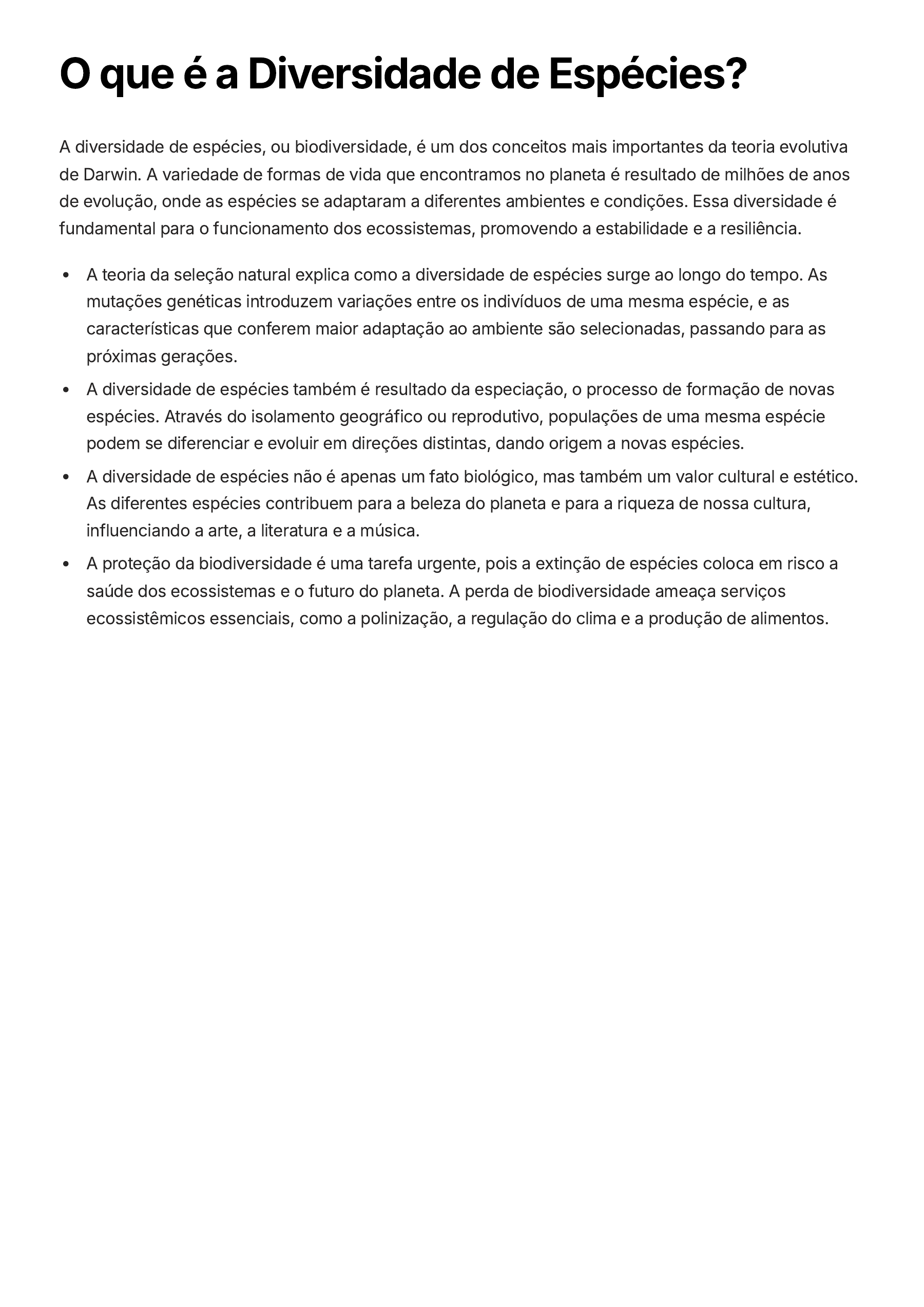 O que é a Diversidade de Espécies? A diversidade de espécies, ou biodiversidade, é um dos conceitos mais importantes da teoria evolutiva de Darwin. A variedade de formas de vida que encontramos no planeta é resultado de milhões de anos de evolução, onde as espécies se adaptaram a diferentes ambientes e condições. Essa diversidade é fundamental para o funcionamento dos ecossistemas, promovendo a estabilidade e a resiliência. A teoria da seleção natural explica como a diversidade de espécies surge ao longo do tempo. As mutações genéticas introduzem variações entre os indivíduos de uma mesma espécie, e as características que conferem maior adaptação ao ambiente são selecionadas, passando para as próximas gerações. A diversidade de espécies também é resultado da especiação, o processo de formação de novas espécies. Através do isolamento geográfico ou reprodutivo, populações de uma mesma espécie podem se diferenciar e evoluir em direções distintas, dando origem a novas espécies. A diversidade de espécies não é apenas um fato biológico, mas também um valor cultural e estético. As diferentes espécies contribuem para a beleza do planeta e para a riqueza de nossa cultura, influenciando a arte, a literatura e a música. A proteção da biodiversidade é uma tarefa urgente, pois a extinção de espécies coloca em risco a saúde dos ecossistemas e o futuro do planeta. A perda de biodiversidade ameaça serviços ecossistêmicos essenciais, como a polinização, a regulação do clima e a produção de alimentos. Como os Seres Vivos Evoluem ao Longo do Tempo? A teoria da evolução de Darwin explica como os seres vivos se modificam ao longo do tempo, dando origem a novas espécies e adaptando-se aos ambientes em constante mudança. Este processo, chamado de evolução, é gradual e ocorre através de mecanismos como a seleção natural, a mutação, a recombinação genética e a deriva genética. A seleção natural é um processo fundamental que favorece os indivíduos com características mais adaptáveis ao ambiente. Esses indivíduos têm maior probabilidade de sobreviver e se reproduzir, transmitindo suas características para as próximas gerações. As características mais vantajosas se tornam mais frequentes na população, levando à evolução da espécie ao longo do tempo. As mutações são alterações aleatórias no material genético, que podem ser benéficas, neutras ou deletérias. As mutações benéficas podem conferir vantagens adaptativas, enquanto as deletérias podem prejudicar a sobrevivência. As mutações neutras não alteram significativamente a capacidade de sobrevivência. A recombinação genética, que ocorre durante a reprodução sexual, mistura o material genético dos pais, criando novas combinações de genes na descendência. Essa mistura genética aumenta a variabilidade da população, fornecendo mais material para a seleção natural trabalhar. A deriva genética é a mudança aleatória na frequência dos genes em uma população, especialmente em populações pequenas. Ela pode levar à perda de genes ou à fixação de genes, independentemente de sua adaptabilidade. A deriva genética pode ser um fator importante na evolução, principalmente em populações isoladas. Em resumo, a evolução dos seres vivos é um processo complexo e gradual que envolve a interação de diversos fatores. Através da seleção natural, da mutação, da recombinação genética e da deriva genética, as espécies se modificam ao longo do tempo, adaptando-se às mudanças do ambiente e gerando a rica diversidade de vida que observamos no planeta. Quais são as evidências que sustentam a teoria evolutiva? Fósseis Os fósseis são restos preservados de organismos antigos que fornecem evidências tangíveis da evolução. Eles demonstram a existência de espécies extintas, revelam mudanças graduais nas formas de vida ao longo do tempo e permitem a reconstrução de linhagens evolutivas. Através da datação radiométrica, podemos determinar a idade dos fósseis e obter insights sobre a cronologia da vida na Terra. Anatomia Comparada O estudo da anatomia comparada revela semelhanças estruturais entre diferentes espécies, sugerindo ancestrais comuns. Estruturas homólogas, como os ossos da mão humana, a asa de um morcego e a nadadeira de uma baleia, demonstram uma origem comum, apesar de desempenharem funções diferentes. Estruturas vestigiais, como o apêndice humano, são órgãos atrofiados que perderam sua função original, mas persistem como evidências de um passado evolutivo compartilhado. Além da paleontologia e da anatomia comparada, outras áreas de estudo fornecem evidências para a teoria evolutiva. A biogeografia, por exemplo, analisa a distribuição geográfica de espécies e demonstra como a evolução foi influenciada por fatores geográficos e históricos. A embriologia comparada, por sua vez, compara o desenvolvimento embrionário de diferentes espécies, revelando semelhanças que refletem parentesco evolutivo. E, finalmente, a evolução molecular, que analisa as sequências de DNA e proteínas, oferece evidências moleculares robustas para confirmar as relações evolutivas entre os seres vivos.