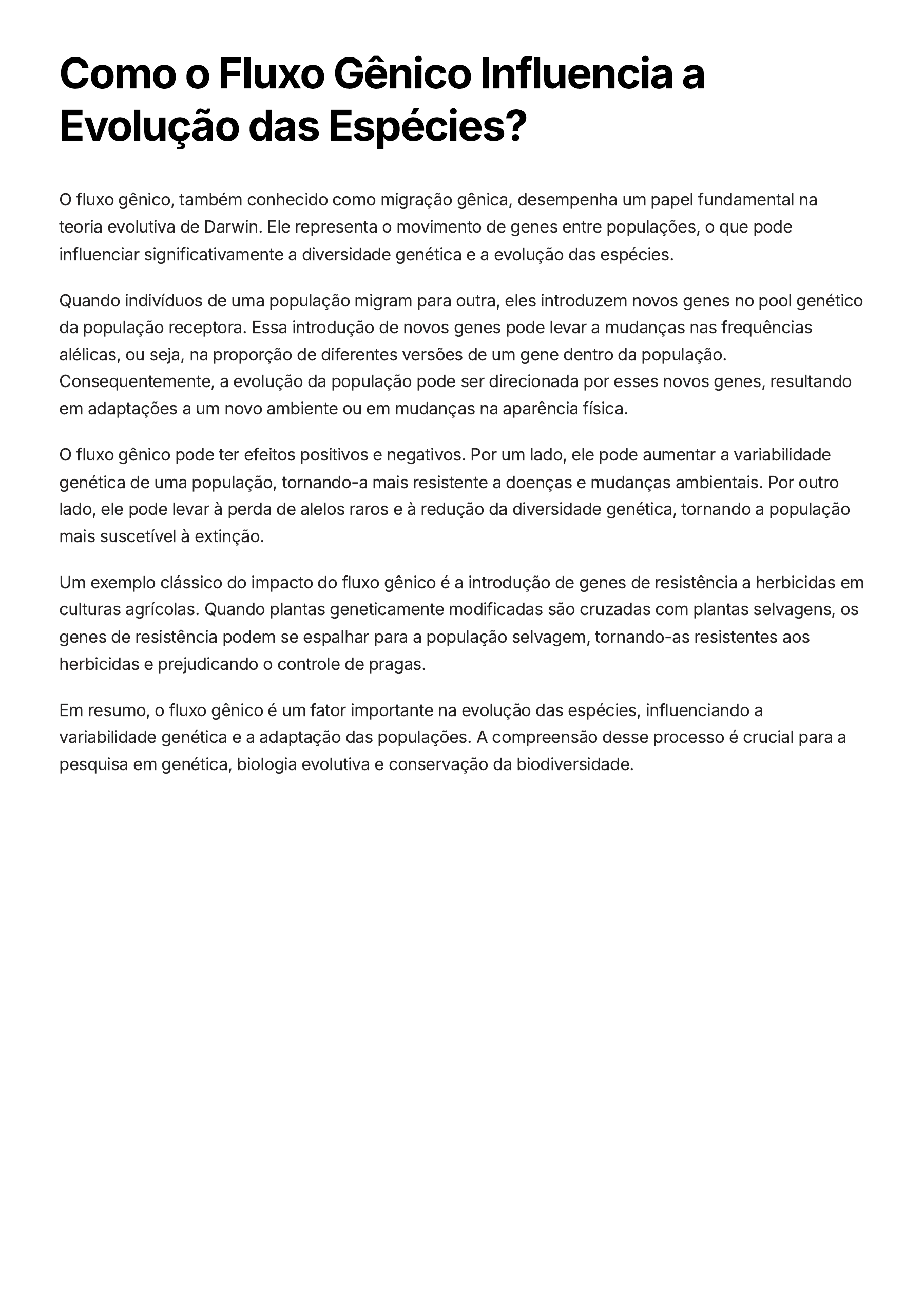 Como o Fluxo Gênico Influencia a Evolução das Espécies? O fluxo gênico, também conhecido como migração gênica, desempenha um papel fundamental na teoria evolutiva de Darwin. Ele representa o movimento de genes entre populações, o que pode influenciar significativamente a diversidade genética e a evolução das espécies. Quando indivíduos de uma população migram para outra, eles introduzem novos genes no pool genético da população receptora. Essa introdução de novos genes pode levar a mudanças nas frequências alélicas, ou seja, na proporção de diferentes versões de um gene dentro da população. Consequentemente, a evolução da população pode ser direcionada por esses novos genes, resultando em adaptações a um novo ambiente ou em mudanças na aparência física. O fluxo gênico pode ter efeitos positivos e negativos. Por um lado, ele pode aumentar a variabilidade genética de uma população, tornando-a mais resistente a doenças e mudanças ambientais. Por outro lado, ele pode levar à perda de alelos raros e à redução da diversidade genética, tornando a população mais suscetível à extinção. Um exemplo clássico do impacto do fluxo gênico é a introdução de genes de resistência a herbicidas em culturas agrícolas. Quando plantas geneticamente modificadas são cruzadas com plantas selvagens, os genes de resistência podem se espalhar para a população selvagem, tornando-as resistentes aos herbicidas e prejudicando o controle de pragas. Em resumo, o fluxo gênico é um fator importante na evolução das espécies, influenciando a variabilidade genética e a adaptação das populações. A compreensão desse processo é crucial para a pesquisa em genética, biologia evolutiva e conservação da biodiversidade. Como surgem novas espécies na natureza? A especiação é um processo fundamental na teoria evolutiva de Darwin, que descreve o surgimento de novas espécies a partir de uma ancestral comum. É um processo gradual que ocorre ao longo de muitas gerações, impulsionado por mecanismos evolutivos como a seleção natural, a deriva genética e o fluxo gênico. A especiação é um dos pilares da teoria evolutiva, pois explica como a vida na Terra se diversificou em milhões de espécies. Para que ocorra a especiação, é necessário que haja um isolamento reprodutivo entre populações, impedindo o fluxo gênico entre elas. Esse isolamento pode ser causado por diversos fatores, como: Isolamento geográfico: Quando uma população é separada por uma barreira geográfica, como um rio, uma montanha ou um oceano, impedindo o contato entre os indivíduos. Isolamento ecológico: Quando duas populações ocupam nichos ecológicos diferentes, mesmo dentro da mesma área geográfica, podem se reproduzir menos entre si, levando à divergência genética. Isolamento comportamental: Diferenças no comportamento reprodutivo, como rituais de acasalamento ou períodos de reprodução distintos, podem impedir o cruzamento entre populações. Como as Espécies Evoluem Juntas através da Coevolução? A coevolução é um conceito fundamental dentro da teoria evolutiva de Darwin, que descreve a influência mútua da evolução de duas ou mais espécies. Essas espécies interagem de maneira tão próxima que a evolução de uma afeta diretamente a evolução da outra. Essa interação pode ser simbiótica, parasitária, predatória ou competitiva, e a seleção natural atua sobre cada espécie, moldando suas características para melhor lidar com a interação. Um exemplo clássico de coevolução é a relação entre flores e seus polinizadores. As flores evoluíram cores vibrantes, aromas intensos e néctar para atrair os polinizadores, que por sua vez, desenvolveram adaptações específicas para acessar o néctar e o pólen, como bicos longos em beija-flores ou patas peludas em abelhas. Essa relação mutualística beneficia ambas as espécies, garantindo a reprodução das flores e a alimentação dos polinizadores. A coevolução pode levar à especialização de espécies, como a adaptação de um parasita a um hospedeiro específico, ou a adaptação de um predador a uma presa específica. A corrida armamentista evolutiva ocorre quando duas espécies coevoluem em uma relação antagonista, como a relação entre predadores e presas. As presas desenvolvem mecanismos de defesa, enquanto os predadores aprimoram suas estratégias de caça. A coevolução pode ser observada em diversos níveis, desde as interações entre microrganismos até as relações entre grandes mamíferos e plantas. O estudo da coevolução é crucial para entender a biodiversidade e as complexas interações entre as espécies em um ecossistema.