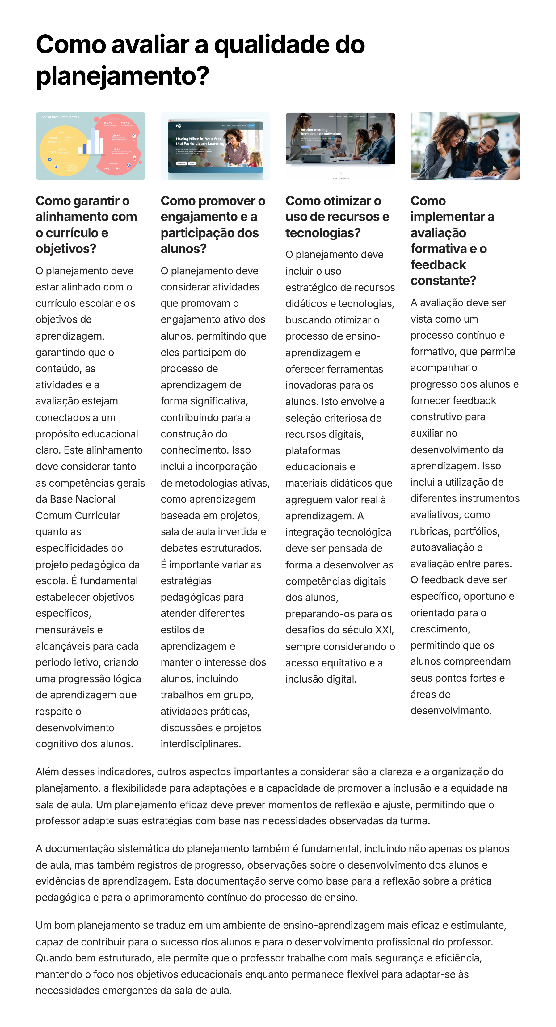 Como avaliar a qualidade do planejamento? Como garantir o alinhamento com o currículo e objetivos? O planejamento deve estar alinhado com o currículo escolar e os objetivos de aprendizagem, garantindo que o conteúdo, as atividades e a avaliação estejam conectados a um propósito educacional claro. Este alinhamento deve considerar tanto as competências gerais da Base Nacional Comum Curricular quanto as especificidades do projeto pedagógico da escola. É fundamental estabelecer objetivos específicos, mensuráveis e alcançáveis para cada período letivo, criando uma progressão lógica de aprendizagem que respeite o desenvolvimento cognitivo dos alunos. Como promover o engajamento e a participação dos alunos? O planejamento deve considerar atividades que promovam o engajamento ativo dos alunos, permitindo que eles participem do processo de aprendizagem de forma significativa, contribuindo para a construção do conhecimento. Isso inclui a incorporação de metodologias ativas, como aprendizagem baseada em projetos, sala de aula invertida e debates estruturados. É importante variar as estratégias pedagógicas para atender diferentes estilos de aprendizagem e manter o interesse dos alunos, incluindo trabalhos em grupo, atividades práticas, discussões e projetos interdisciplinares. Como otimizar o uso de recursos e tecnologias? O planejamento deve incluir o uso estratégico de recursos didáticos e tecnologias, buscando otimizar o processo de ensino- aprendizagem e oferecer ferramentas inovadoras para os alunos. Isto envolve a seleção criteriosa de recursos digitais, plataformas educacionais e materiais didáticos que agreguem valor real à aprendizagem. A integração tecnológica deve ser pensada de forma a desenvolver as competências digitais dos alunos, preparando-os para os desafios do século XXI, sempre considerando o acesso equitativo e a inclusão digital. Como implementar a avaliação formativa e o feedback constante? A avaliação deve ser vista como um processo contínuo e formativo, que permite acompanhar o progresso dos alunos e fornecer feedback construtivo para auxiliar no desenvolvimento da aprendizagem. Isso inclui a utilização de diferentes instrumentos avaliativos, como rubricas, portfólios, autoavaliação e avaliação entre pares. O feedback deve ser específico, oportuno e orientado para o crescimento, permitindo que os alunos compreendam seus pontos fortes e áreas de desenvolvimento. Além desses indicadores, outros aspectos importantes a considerar são a clareza e a organização do planejamento, a flexibilidade para adaptações e a capacidade de promover a inclusão e a equidade na sala de aula. Um planejamento eficaz deve prever momentos de reflexão e ajuste, permitindo que o professor adapte suas estratégias com base nas necessidades observadas da turma. A documentação sistemática do planejamento também é fundamental, incluindo não apenas os planos de aula, mas também registros de progresso, observações sobre o desenvolvimento dos alunos e evidências de aprendizagem. Esta documentação serve como base para a reflexão sobre a prática pedagógica e para o aprimoramento contínuo do processo de ensino. Um bom planejamento se traduz em um ambiente de ensino-aprendizagem mais eficaz e estimulante, capaz de contribuir para o sucesso dos alunos e para o desenvolvimento profissional do professor. Quando bem estruturado, ele permite que o professor trabalhe com mais segurança e eficiência, mantendo o foco nos objetivos educacionais enquanto permanece flexível para adaptar-se às necessidades emergentes da sala de aula.