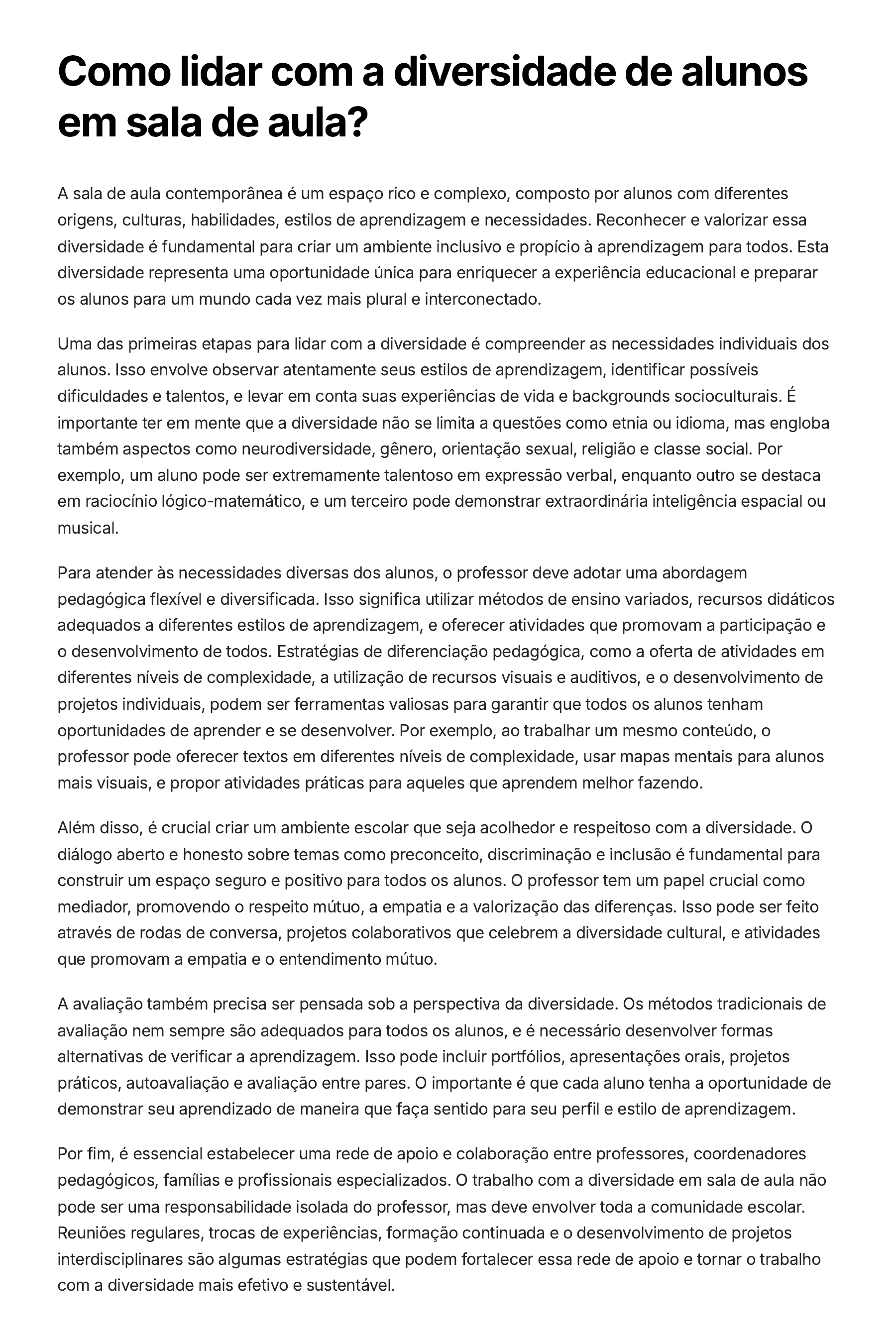 Como lidar com a diversidade de alunos em sala de aula? A sala de aula contemporânea é um espaço rico e complexo, composto por alunos com diferentes origens, culturas, habilidades, estilos de aprendizagem e necessidades. Reconhecer e valorizar essa diversidade é fundamental para criar um ambiente inclusivo e propício à aprendizagem para todos. Esta diversidade representa uma oportunidade única para enriquecer a experiência educacional e preparar os alunos para um mundo cada vez mais plural e interconectado. Uma das primeiras etapas para lidar com a diversidade é compreender as necessidades individuais dos alunos. Isso envolve observar atentamente seus estilos de aprendizagem, identificar possíveis dificuldades e talentos, e levar em conta suas experiências de vida e backgrounds socioculturais. É importante ter em mente que a diversidade não se limita a questões como etnia ou idioma, mas engloba também aspectos como neurodiversidade, gênero, orientação sexual, religião e classe social. Por exemplo, um aluno pode ser extremamente talentoso em expressão verbal, enquanto outro se destaca em raciocínio lógico-matemático, e um terceiro pode demonstrar extraordinária inteligência espacial ou musical. Para atender às necessidades diversas dos alunos, o professor deve adotar uma abordagem pedagógica flexível e diversificada. Isso significa utilizar métodos de ensino variados, recursos didáticos adequados a diferentes estilos de aprendizagem, e oferecer atividades que promovam a participação e o desenvolvimento de todos. Estratégias de diferenciação pedagógica, como a oferta de atividades em diferentes níveis de complexidade, a utilização de recursos visuais e auditivos, e o desenvolvimento de projetos individuais, podem ser ferramentas valiosas para garantir que todos os alunos tenham oportunidades de aprender e se desenvolver. Por exemplo, ao trabalhar um mesmo conteúdo, o professor pode oferecer textos em diferentes níveis de complexidade, usar mapas mentais para alunos mais visuais, e propor atividades práticas para aqueles que aprendem melhor fazendo. Além disso, é crucial criar um ambiente escolar que seja acolhedor e respeitoso com a diversidade. O diálogo aberto e honesto sobre temas como preconceito, discriminação e inclusão é fundamental para construir um espaço seguro e positivo para todos os alunos. O professor tem um papel crucial como mediador, promovendo o respeito mútuo, a empatia e a valorização das diferenças. Isso pode ser feito através de rodas de conversa, projetos colaborativos que celebrem a diversidade cultural, e atividades que promovam a empatia e o entendimento mútuo. A avaliação também precisa ser pensada sob a perspectiva da diversidade. Os métodos tradicionais de avaliação nem sempre são adequados para todos os alunos, e é necessário desenvolver formas alternativas de verificar a aprendizagem. Isso pode incluir portfólios, apresentações orais, projetos práticos, autoavaliação e avaliação entre pares. O importante é que cada aluno tenha a oportunidade de demonstrar seu aprendizado de maneira que faça sentido para seu perfil e estilo de aprendizagem. Por fim, é essencial estabelecer uma rede de apoio e colaboração entre professores, coordenadores pedagógicos, famílias e profissionais especializados. O trabalho com a diversidade em sala de aula não pode ser uma responsabilidade isolada do professor, mas deve envolver toda a comunidade escolar. Reuniões regulares, trocas de experiências, formação continuada e o desenvolvimento de projetos interdisciplinares são algumas estratégias que podem fortalecer essa rede de apoio e tornar o trabalho com a diversidade mais efetivo e sustentável.