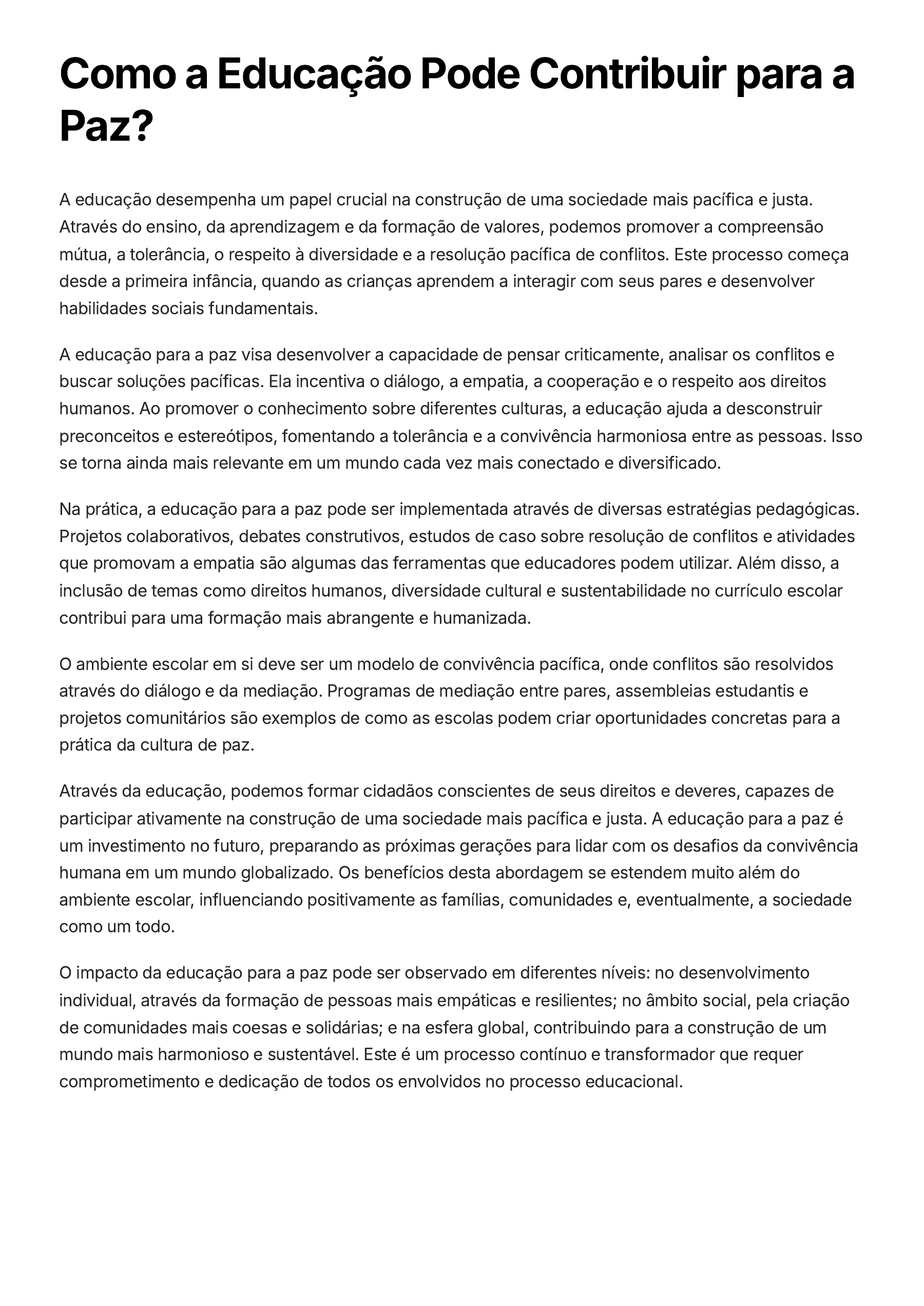 Como a Educação Pode Contribuir para a Paz? A educação desempenha um papel crucial na construção de uma sociedade mais pacífica e justa. Através do ensino, da aprendizagem e da formação de valores, podemos promover a compreensão mútua, a tolerância, o respeito à diversidade e a resolução pacífica de conflitos. Este processo começa desde a primeira infância, quando as crianças aprendem a interagir com seus pares e desenvolver habilidades sociais fundamentais. A educação para a paz visa desenvolver a capacidade de pensar criticamente, analisar os conflitos e buscar soluções pacíficas. Ela incentiva o diálogo, a empatia, a cooperação e o respeito aos direitos humanos. Ao promover o conhecimento sobre diferentes culturas, a educação ajuda a desconstruir preconceitos e estereótipos, fomentando a tolerância e a convivência harmoniosa entre as pessoas. Isso se torna ainda mais relevante em um mundo cada vez mais conectado e diversificado. Na prática, a educação para a paz pode ser implementada através de diversas estratégias pedagógicas. Projetos colaborativos, debates construtivos, estudos de caso sobre resolução de conflitos e atividades que promovam a empatia são algumas das ferramentas que educadores podem utilizar. Além disso, a inclusão de temas como direitos humanos, diversidade cultural e sustentabilidade no currículo escolar contribui para uma formação mais abrangente e humanizada. O ambiente escolar em si deve ser um modelo de convivência pacífica, onde conflitos são resolvidos através do diálogo e da mediação. Programas de mediação entre pares, assembleias estudantis e projetos comunitários são exemplos de como as escolas podem criar oportunidades concretas para a prática da cultura de paz. Através da educação, podemos formar cidadãos conscientes de seus direitos e deveres, capazes de participar ativamente na construção de uma sociedade mais pacífica e justa. A educação para a paz é um investimento no futuro, preparando as próximas gerações para lidar com os desafios da convivência humana em um mundo globalizado. Os benefícios desta abordagem se estendem muito além do ambiente escolar, influenciando positivamente as famílias, comunidades e, eventualmente, a sociedade como um todo. O impacto da educação para a paz pode ser observado em diferentes níveis: no desenvolvimento individual, através da formação de pessoas mais empáticas e resilientes; no âmbito social, pela criação de comunidades mais coesas e solidárias; e na esfera global, contribuindo para a construção de um mundo mais harmonioso e sustentável. Este é um processo contínuo e transformador que requer comprometimento e dedicação de todos os envolvidos no processo educacional.