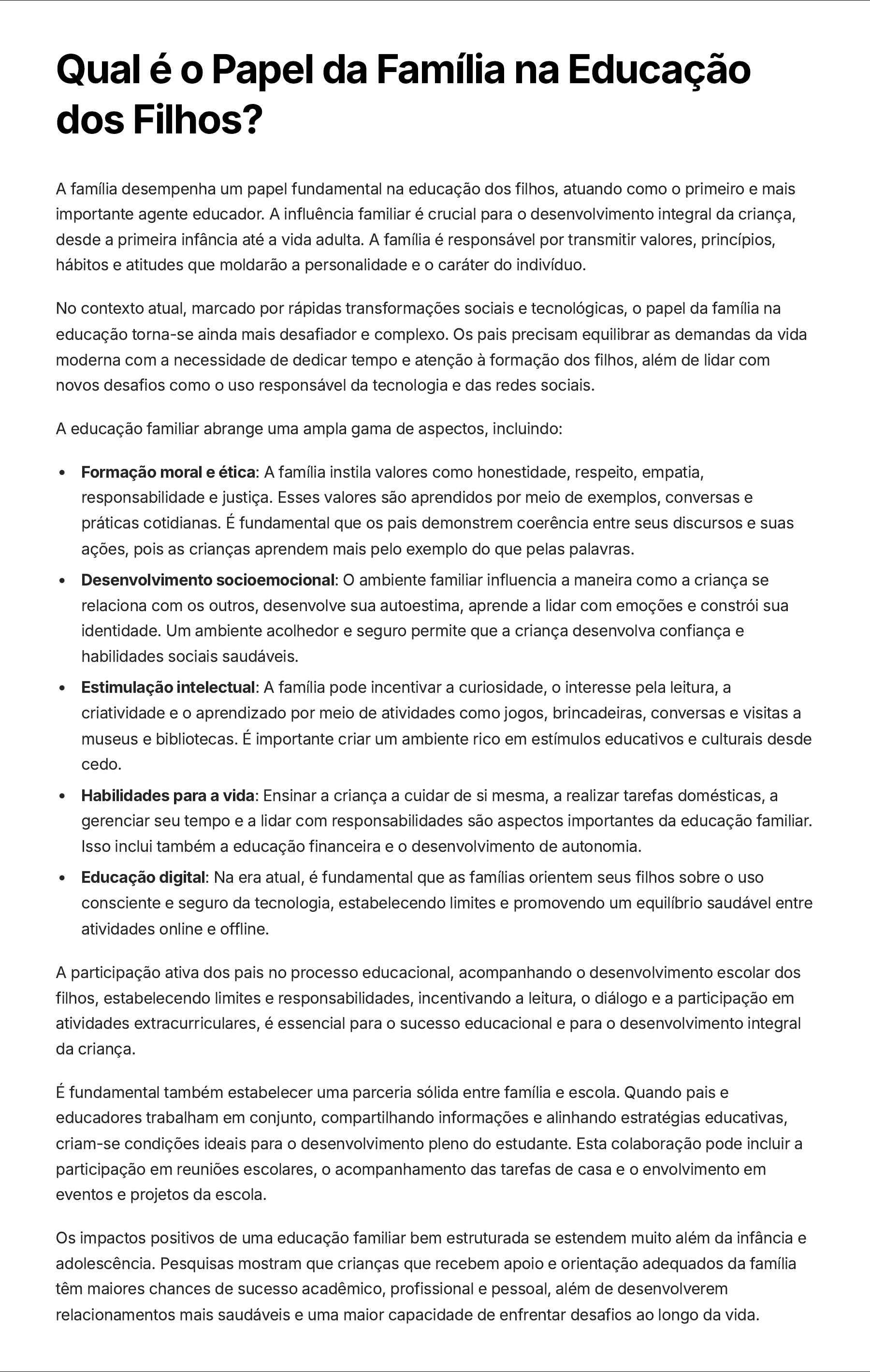 Qual é o Papel da Família na Educação dos Filhos? A família desempenha um papel fundamental na educação dos filhos, atuando como o primeiro e mais importante agente educador. A influência familiar é crucial para o desenvolvimento integral da criança, desde a primeira infância até a vida adulta. A família é responsável por transmitir valores, princípios, hábitos e atitudes que moldarão a personalidade e o caráter do indivíduo. No contexto atual, marcado por rápidas transformações sociais e tecnológicas, o papel da família na educação torna-se ainda mais desafiador e complexo. Os pais precisam equilibrar as demandas da vida moderna com a necessidade de dedicar tempo e atenção à formação dos filhos, além de lidar com novos desafios como o uso responsável da tecnologia e das redes sociais. A educação familiar abrange uma ampla gama de aspectos, incluindo: Formação moral e ética: A família instila valores como honestidade, respeito, empatia, responsabilidade e justiça. Esses valores são aprendidos por meio de exemplos, conversas e práticas cotidianas. É fundamental que os pais demonstrem coerência entre seus discursos e suas ações, pois as crianças aprendem mais pelo exemplo do que pelas palavras. Desenvolvimento socioemocional: O ambiente familiar influencia a maneira como a criança se relaciona com os outros, desenvolve sua autoestima, aprende a lidar com emoções e constrói sua identidade. Um ambiente acolhedor e seguro permite que a criança desenvolva confiança e habilidades sociais saudáveis. Estimulação intelectual: A família pode incentivar a curiosidade, o interesse pela leitura, a criatividade e o aprendizado por meio de atividades como jogos, brincadeiras, conversas e visitas a museus e bibliotecas. É importante criar um ambiente rico em estímulos educativos e culturais desde cedo. Habilidades para a vida: Ensinar a criança a cuidar de si mesma, a realizar tarefas domésticas, a gerenciar seu tempo e a lidar com responsabilidades são aspectos importantes da educação familiar. Isso inclui também a educação financeira e o desenvolvimento de autonomia. Educação digital: Na era atual, é fundamental que as famílias orientem seus filhos sobre o uso consciente e seguro da tecnologia, estabelecendo limites e promovendo um equilíbrio saudável entre atividades online e offline. A participação ativa dos pais no processo educacional, acompanhando o desenvolvimento escolar dos filhos, estabelecendo limites e responsabilidades, incentivando a leitura, o diálogo e a participação em atividades extracurriculares, é essencial para o sucesso educacional e para o desenvolvimento integral da criança. É fundamental também estabelecer uma parceria sólida entre família e escola. Quando pais e educadores trabalham em conjunto, compartilhando informações e alinhando estratégias educativas, criam-se condições ideais para o desenvolvimento pleno do estudante. Esta colaboração pode incluir a participação em reuniões escolares, o acompanhamento das tarefas de casa e o envolvimento em eventos e projetos da escola. Os impactos positivos de uma educação familiar bem estruturada se estendem muito além da infância e adolescência. Pesquisas mostram que crianças que recebem apoio e orientação adequados da família têm maiores chances de sucesso acadêmico, profissional e pessoal, além de desenvolverem relacionamentos mais saudáveis e uma maior capacidade de enfrentar desafios ao longo da vida.
