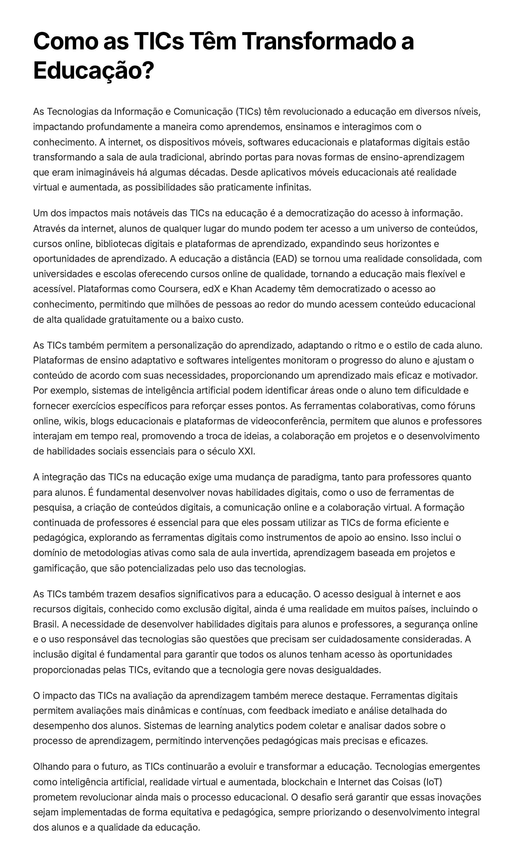 Como as TICs Têm Transformado a Educação? As Tecnologias da Informação e Comunicação (TICs) têm revolucionado a educação em diversos níveis, impactando profundamente a maneira como aprendemos, ensinamos e interagimos com o conhecimento. A internet, os dispositivos móveis, softwares educacionais e plataformas digitais estão transformando a sala de aula tradicional, abrindo portas para novas formas de ensino-aprendizagem que eram inimagináveis há algumas décadas. Desde aplicativos móveis educacionais até realidade virtual e aumentada, as possibilidades são praticamente infinitas. Um dos impactos mais notáveis das TICs na educação é a democratização do acesso à informação. Através da internet, alunos de qualquer lugar do mundo podem ter acesso a um universo de conteúdos, cursos online, bibliotecas digitais e plataformas de aprendizado, expandindo seus horizontes e oportunidades de aprendizado. A educação a distância (EAD) se tornou uma realidade consolidada, com universidades e escolas oferecendo cursos online de qualidade, tornando a educação mais flexível e acessível. Plataformas como Coursera, edX e Khan Academy têm democratizado o acesso ao conhecimento, permitindo que milhões de pessoas ao redor do mundo acessem conteúdo educacional de alta qualidade gratuitamente ou a baixo custo. As TICs também permitem a personalização do aprendizado, adaptando o ritmo e o estilo de cada aluno. Plataformas de ensino adaptativo e softwares inteligentes monitoram o progresso do aluno e ajustam o conteúdo de acordo com suas necessidades, proporcionando um aprendizado mais eficaz e motivador. Por exemplo, sistemas de inteligência artificial podem identificar áreas onde o aluno tem dificuldade e fornecer exercícios específicos para reforçar esses pontos. As ferramentas colaborativas, como fóruns online, wikis, blogs educacionais e plataformas de videoconferência, permitem que alunos e professores interajam em tempo real, promovendo a troca de ideias, a colaboração em projetos e o desenvolvimento de habilidades sociais essenciais para o século XXI. A integração das TICs na educação exige uma mudança de paradigma, tanto para professores quanto para alunos. É fundamental desenvolver novas habilidades digitais, como o uso de ferramentas de pesquisa, a criação de conteúdos digitais, a comunicação online e a colaboração virtual. A formação continuada de professores é essencial para que eles possam utilizar as TICs de forma eficiente e pedagógica, explorando as ferramentas digitais como instrumentos de apoio ao ensino. Isso inclui o domínio de metodologias ativas como sala de aula invertida, aprendizagem baseada em projetos e gamificação, que são potencializadas pelo uso das tecnologias. As TICs também trazem desafios significativos para a educação. O acesso desigual à internet e aos recursos digitais, conhecido como exclusão digital, ainda é uma realidade em muitos países, incluindo o Brasil. A necessidade de desenvolver habilidades digitais para alunos e professores, a segurança online e o uso responsável das tecnologias são questões que precisam ser cuidadosamente consideradas. A inclusão digital é fundamental para garantir que todos os alunos tenham acesso às oportunidades proporcionadas pelas TICs, evitando que a tecnologia gere novas desigualdades. O impacto das TICs na avaliação da aprendizagem também merece destaque. Ferramentas digitais permitem avaliações mais dinâmicas e contínuas, com feedback imediato e análise detalhada do desempenho dos alunos. Sistemas de learning analytics podem coletar e analisar dados sobre o processo de aprendizagem, permitindo intervenções pedagógicas mais precisas e eficazes. Olhando para o futuro, as TICs continuarão a evoluir e transformar a educação. Tecnologias emergentes como inteligência artificial, realidade virtual e aumentada, blockchain e Internet das Coisas (IoT) prometem revolucionar ainda mais o processo educacional. O desafio será garantir que essas inovações sejam implementadas de forma equitativa e pedagógica, sempre priorizando o desenvolvimento integral dos alunos e a qualidade da educação.