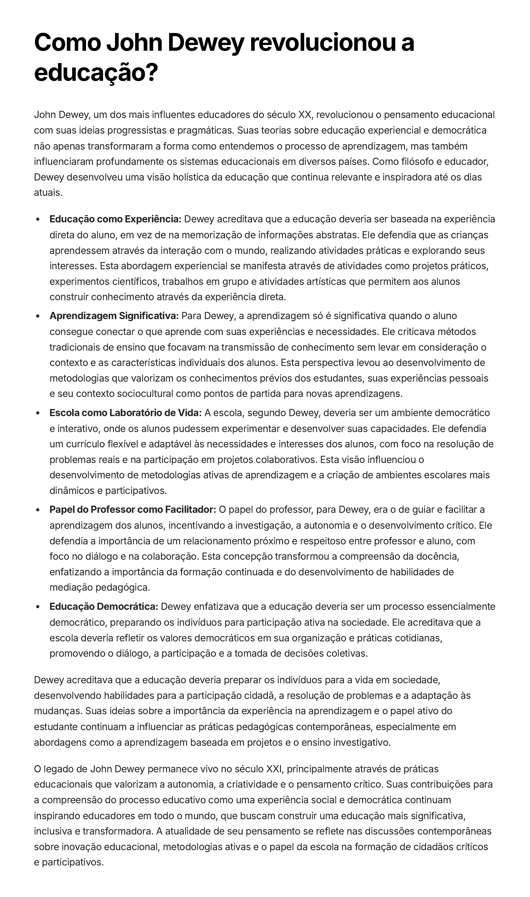 Como John Dewey revolucionou a educação? John Dewey, um dos mais influentes educadores do século XX, revolucionou o pensamento educacional com suas ideias progressistas e pragmáticas. Suas teorias sobre educação experiencial e democrática não apenas transformaram a forma como entendemos o processo de aprendizagem, mas também influenciaram profundamente os sistemas educacionais em diversos países. Como filósofo e educador, Dewey desenvolveu uma visão holística da educação que continua relevante e inspiradora até os dias atuais. Educação como Experiência: Dewey acreditava que a educação deveria ser baseada na experiência direta do aluno, em vez de na memorização de informações abstratas. Ele defendia que as crianças aprendessem através da interação com o mundo, realizando atividades práticas e explorando seus interesses. Esta abordagem experiencial se manifesta através de atividades como projetos práticos, experimentos científicos, trabalhos em grupo e atividades artísticas que permitem aos alunos construir conhecimento através da experiência direta. Aprendizagem Significativa: Para Dewey, a aprendizagem só é significativa quando o aluno consegue conectar o que aprende com suas experiências e necessidades. Ele criticava métodos tradicionais de ensino que focavam na transmissão de conhecimento sem levar em consideração o contexto e as características individuais dos alunos. Esta perspectiva levou ao desenvolvimento de metodologias que valorizam os conhecimentos prévios dos estudantes, suas experiências pessoais e seu contexto sociocultural como pontos de partida para novas aprendizagens. Escola como Laboratório de Vida: A escola, segundo Dewey, deveria ser um ambiente democrático e interativo, onde os alunos pudessem experimentar e desenvolver suas capacidades. Ele defendia um currículo flexível e adaptável às necessidades e interesses dos alunos, com foco na resolução de problemas reais e na participação em projetos colaborativos. Esta visão influenciou o desenvolvimento de metodologias ativas de aprendizagem e a criação de ambientes escolares mais dinâmicos e participativos. Papel do Professor como Facilitador: O papel do professor, para Dewey, era o de guiar e facilitar a aprendizagem dos alunos, incentivando a investigação, a autonomia e o desenvolvimento crítico. Ele defendia a importância de um relacionamento próximo e respeitoso entre professor e aluno, com foco no diálogo e na colaboração. Esta concepção transformou a compreensão da docência, enfatizando a importância da formação continuada e do desenvolvimento de habilidades de mediação pedagógica. Educação Democrática: Dewey enfatizava que a educação deveria ser um processo essencialmente democrático, preparando os indivíduos para participação ativa na sociedade. Ele acreditava que a escola deveria refletir os valores democráticos em sua organização e práticas cotidianas, promovendo o diálogo, a participação e a tomada de decisões coletivas. Dewey acreditava que a educação deveria preparar os indivíduos para a vida em sociedade, desenvolvendo habilidades para a participação cidadã, a resolução de problemas e a adaptação às mudanças. Suas ideias sobre a importância da experiência na aprendizagem e o papel ativo do estudante continuam a influenciar as práticas pedagógicas contemporâneas, especialmente em abordagens como a aprendizagem baseada em projetos e o ensino investigativo. O legado de John Dewey permanece vivo no século XXI, principalmente através de práticas educacionais que valorizam a autonomia, a criatividade e o pensamento crítico. Suas contribuições para a compreensão do processo educativo como uma experiência social e democrática continuam inspirando educadores em todo o mundo, que buscam construir uma educação mais significativa, inclusiva e transformadora. A atualidade de seu pensamento se reflete nas discussões contemporâneas sobre inovação educacional, metodologias ativas e o papel da escola na formação de cidadãos críticos e participativos.