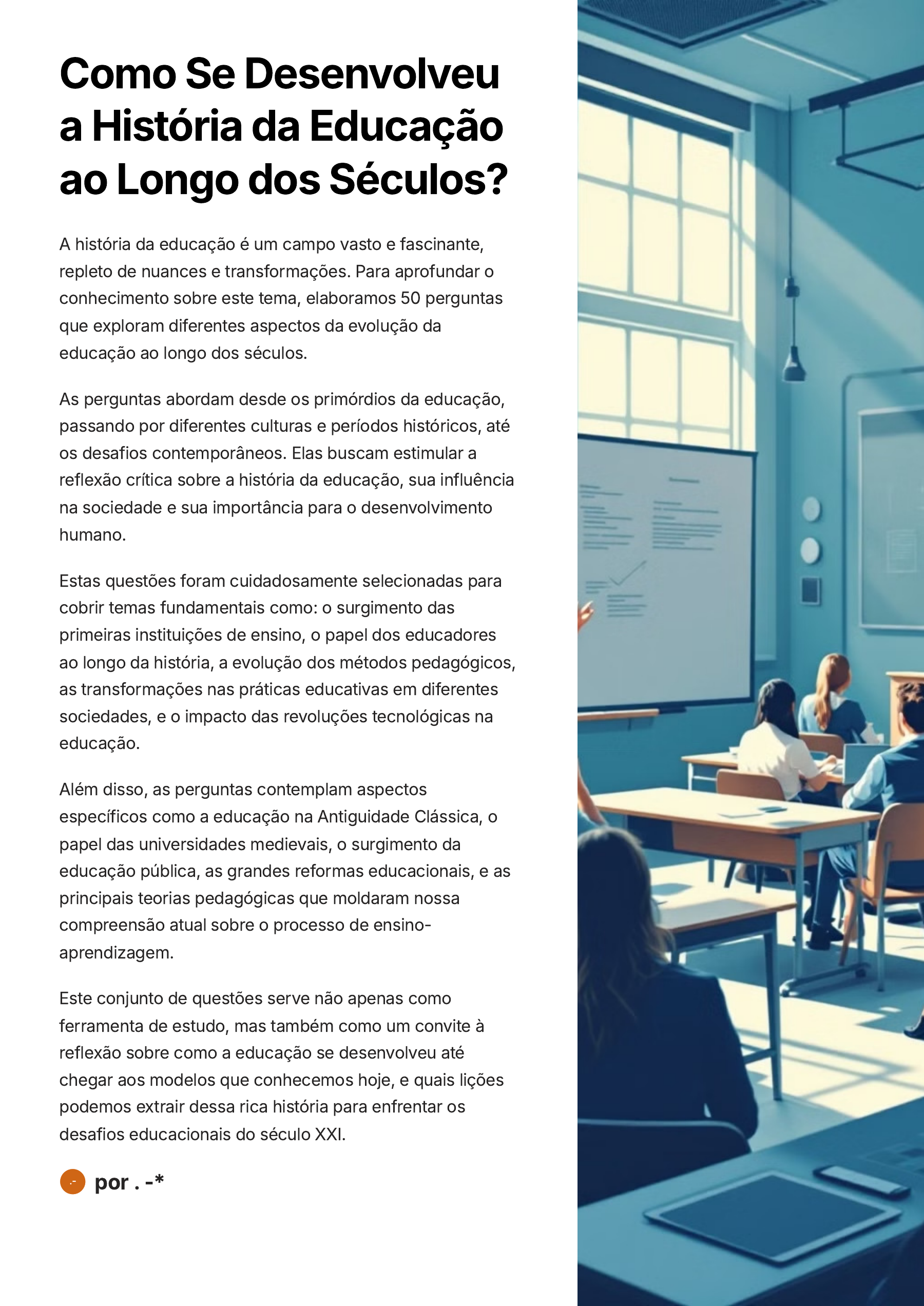 Como Se Desenvolveu a História da Educação ao Longo dos Séculos? A história da educação é um campo vasto e fascinante, repleto de nuances e transformações. Para aprofundar o conhecimento sobre este tema, elaboramos 50 perguntas que exploram diferentes aspectos da evolução da educação ao longo dos séculos. As perguntas abordam desde os primórdios da educação, passando por diferentes culturas e períodos históricos, até os desafios contemporâneos. Elas buscam estimular a reflexão crítica sobre a história da educação, sua influência na sociedade e sua importância para o desenvolvimento humano. Estas questões foram cuidadosamente selecionadas para cobrir temas fundamentais como: o surgimento das primeiras instituições de ensino, o papel dos educadores ao longo da história, a evolução dos métodos pedagógicos, as transformações nas práticas educativas em diferentes sociedades, e o impacto das revoluções tecnológicas na educação. Além disso, as perguntas contemplam aspectos específicos como a educação na Antiguidade Clássica, o papel das universidades medievais, o surgimento da educação pública, as grandes reformas educacionais, e as principais teorias pedagógicas que moldaram nossa compreensão atual sobre o processo de ensino- aprendizagem. Este conjunto de questões serve não apenas como ferramenta de estudo, mas também como um convite à reflexão sobre como a educação se desenvolveu até chegar aos modelos que conhecemos hoje, e quais lições podemos extrair dessa rica história para enfrentar os desafios educacionais do século XXI. por . -*.-