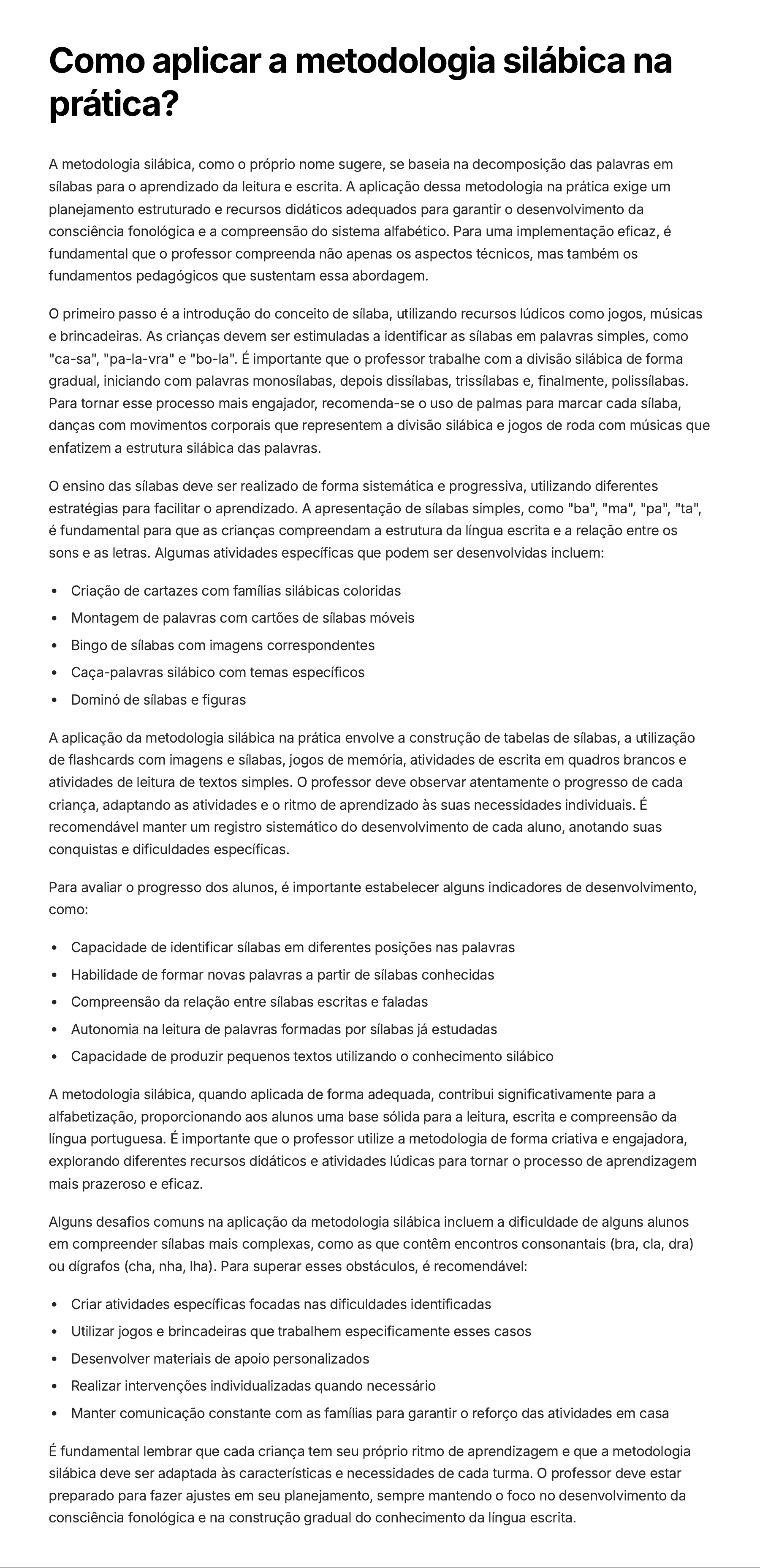 Como aplicar a metodologia silábica na prática? A metodologia silábica, como o próprio nome sugere, se baseia na decomposição das palavras em sílabas para o aprendizado da leitura e escrita. A aplicação dessa metodologia na prática exige um planejamento estruturado e recursos didáticos adequados para garantir o desenvolvimento da consciência fonológica e a compreensão do sistema alfabético. Para uma implementação eficaz, é fundamental que o professor compreenda não apenas os aspectos técnicos, mas também os fundamentos pedagógicos que sustentam essa abordagem. O primeiro passo é a introdução do conceito de sílaba, utilizando recursos lúdicos como jogos, músicas e brincadeiras. As crianças devem ser estimuladas a identificar as sílabas em palavras simples, como "ca-sa", "pa-la-vra" e "bo-la". É importante que o professor trabalhe com a divisão silábica de forma gradual, iniciando com palavras monosílabas, depois dissílabas, trissílabas e, finalmente, polissílabas. Para tornar esse processo mais engajador, recomenda-se o uso de palmas para marcar cada sílaba, danças com movimentos corporais que representem a divisão silábica e jogos de roda com músicas que enfatizem a estrutura silábica das palavras. O ensino das sílabas deve ser realizado de forma sistemática e progressiva, utilizando diferentes estratégias para facilitar o aprendizado. A apresentação de sílabas simples, como "ba", "ma", "pa", "ta", é fundamental para que as crianças compreendam a estrutura da língua escrita e a relação entre os sons e as letras. Algumas atividades específicas que podem ser desenvolvidas incluem: Criação de cartazes com famílias silábicas coloridas Montagem de palavras com cartões de sílabas móveis Bingo de sílabas com imagens correspondentes Caça-palavras silábico com temas específicos Dominó de sílabas e figuras A aplicação da metodologia silábica na prática envolve a construção de tabelas de sílabas, a utilização de flashcards com imagens e sílabas, jogos de memória, atividades de escrita em quadros brancos e atividades de leitura de textos simples. O professor deve observar atentamente o progresso de cada criança, adaptando as atividades e o ritmo de aprendizado às suas necessidades individuais. É recomendável manter um registro sistemático do desenvolvimento de cada aluno, anotando suas conquistas e dificuldades específicas. Para avaliar o progresso dos alunos, é importante estabelecer alguns indicadores de desenvolvimento, como: Capacidade de identificar sílabas em diferentes posições nas palavras Habilidade de formar novas palavras a partir de sílabas conhecidas Compreensão da relação entre sílabas escritas e faladas Autonomia na leitura de palavras formadas por sílabas já estudadas Capacidade de produzir pequenos textos utilizando o conhecimento silábico A metodologia silábica, quando aplicada de forma adequada, contribui significativamente para a alfabetização, proporcionando aos alunos uma base sólida para a leitura, escrita e compreensão da língua portuguesa. É importante que o professor utilize a metodologia de forma criativa e engajadora, explorando diferentes recursos didáticos e atividades lúdicas para tornar o processo de aprendizagem mais prazeroso e eficaz. Alguns desafios comuns na aplicação da metodologia silábica incluem a dificuldade de alguns alunos em compreender sílabas mais complexas, como as que contêm encontros consonantais (bra, cla, dra) ou dígrafos (cha, nha, lha). Para superar esses obstáculos, é recomendável: Criar atividades específicas focadas nas dificuldades identificadas Utilizar jogos e brincadeiras que trabalhem especificamente esses casos Desenvolver materiais de apoio personalizados Realizar intervenções individualizadas quando necessário Manter comunicação constante com as famílias para garantir o reforço das atividades em casa É fundamental lembrar que cada criança tem seu próprio ritmo de aprendizagem e que a metodologia silábica deve ser adaptada às características e necessidades de cada turma. O professor deve estar preparado para fazer ajustes em seu planejamento, sempre mantendo o foco no desenvolvimento da consciência fonológica e na construção gradual do conhecimento da língua escrita.