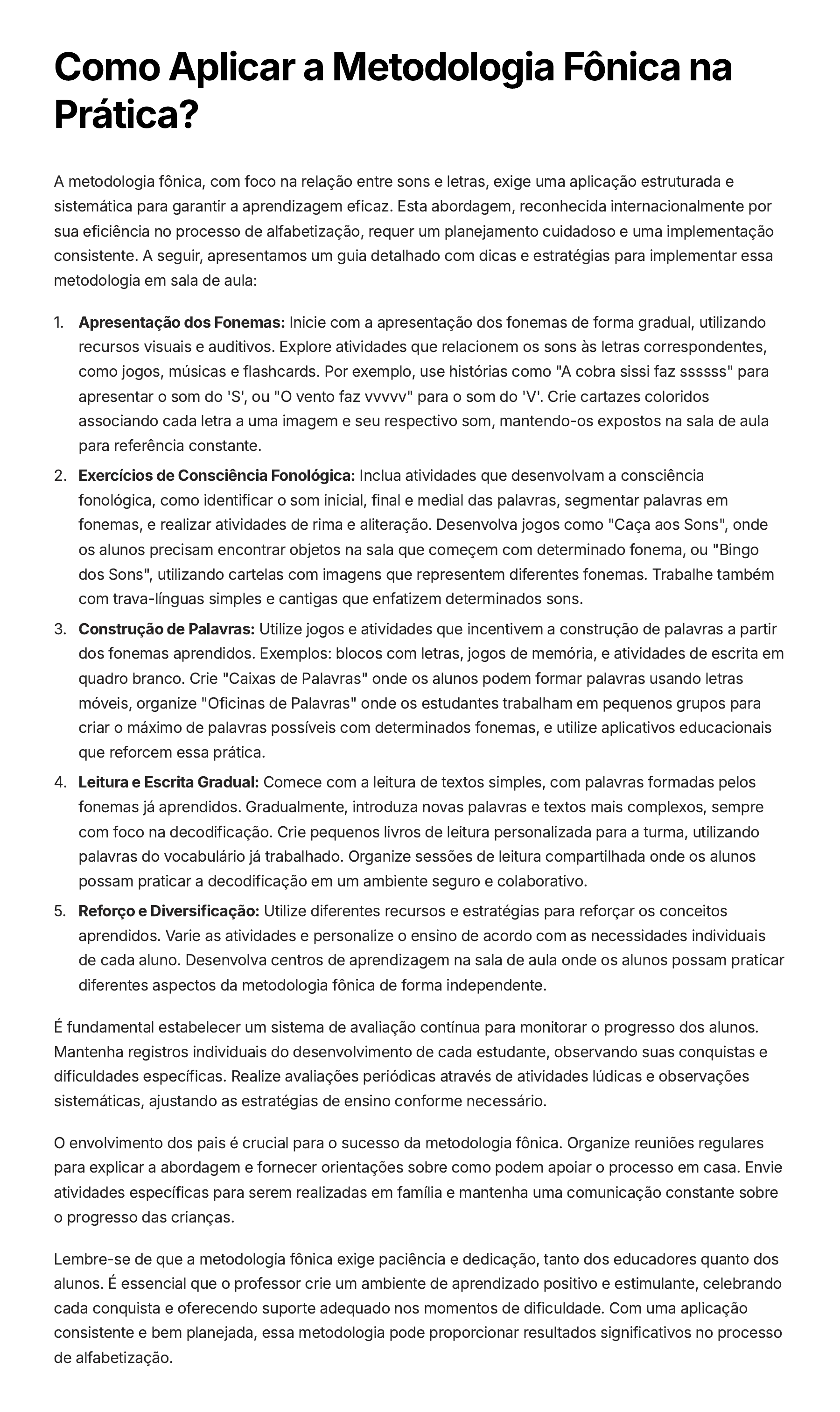 Como Aplicar a Metodologia Fônica na Prática? A metodologia fônica, com foco na relação entre sons e letras, exige uma aplicação estruturada e sistemática para garantir a aprendizagem eficaz. Esta abordagem, reconhecida internacionalmente por sua eficiência no processo de alfabetização, requer um planejamento cuidadoso e uma implementação consistente. A seguir, apresentamos um guia detalhado com dicas e estratégias para implementar essa metodologia em sala de aula: Apresentação dos Fonemas: Inicie com a apresentação dos fonemas de forma gradual, utilizando recursos visuais e auditivos. Explore atividades que relacionem os sons às letras correspondentes, como jogos, músicas e flashcards. Por exemplo, use histórias como "A cobra sissi faz ssssss" para apresentar o som do 'S', ou "O vento faz vvvvv" para o som do 'V'. Crie cartazes coloridos associando cada letra a uma imagem e seu respectivo som, mantendo-os expostos na sala de aula para referência constante. 1. Exercícios de Consciência Fonológica: Inclua atividades que desenvolvam a consciência fonológica, como identificar o som inicial, final e medial das palavras, segmentar palavras em fonemas, e realizar atividades de rima e aliteração. Desenvolva jogos como "Caça aos Sons", onde os alunos precisam encontrar objetos na sala que começem com determinado fonema, ou "Bingo dos Sons", utilizando cartelas com imagens que representem diferentes fonemas. Trabalhe também com trava-línguas simples e cantigas que enfatizem determinados sons. 2. Construção de Palavras: Utilize jogos e atividades que incentivem a construção de palavras a partir dos fonemas aprendidos. Exemplos: blocos com letras, jogos de memória, e atividades de escrita em quadro branco. Crie "Caixas de Palavras" onde os alunos podem formar palavras usando letras móveis, organize "Oficinas de Palavras" onde os estudantes trabalham em pequenos grupos para criar o máximo de palavras possíveis com determinados fonemas, e utilize aplicativos educacionais que reforcem essa prática. 3. Leitura e Escrita Gradual: Comece com a leitura de textos simples, com palavras formadas pelos fonemas já aprendidos. Gradualmente, introduza novas palavras e textos mais complexos, sempre com foco na decodificação. Crie pequenos livros de leitura personalizada para a turma, utilizando palavras do vocabulário já trabalhado. Organize sessões de leitura compartilhada onde os alunos possam praticar a decodificação em um ambiente seguro e colaborativo. 4. Reforço e Diversificação: Utilize diferentes recursos e estratégias para reforçar os conceitos aprendidos. Varie as atividades e personalize o ensino de acordo com as necessidades individuais de cada aluno. Desenvolva centros de aprendizagem na sala de aula onde os alunos possam praticar diferentes aspectos da metodologia fônica de forma independente. 5. É fundamental estabelecer um sistema de avaliação contínua para monitorar o progresso dos alunos. Mantenha registros individuais do desenvolvimento de cada estudante, observando suas conquistas e dificuldades específicas. Realize avaliações periódicas através de atividades lúdicas e observações sistemáticas, ajustando as estratégias de ensino conforme necessário. O envolvimento dos pais é crucial para o sucesso da metodologia fônica. Organize reuniões regulares para explicar a abordagem e fornecer orientações sobre como podem apoiar o processo em casa. Envie atividades específicas para serem realizadas em família e mantenha uma comunicação constante sobre o progresso das crianças. Lembre-se de que a metodologia fônica exige paciência e dedicação, tanto dos educadores quanto dos alunos. É essencial que o professor crie um ambiente de aprendizado positivo e estimulante, celebrando cada conquista e oferecendo suporte adequado nos momentos de dificuldade. Com uma aplicação consistente e bem planejada, essa metodologia pode proporcionar resultados significativos no processo de alfabetização.