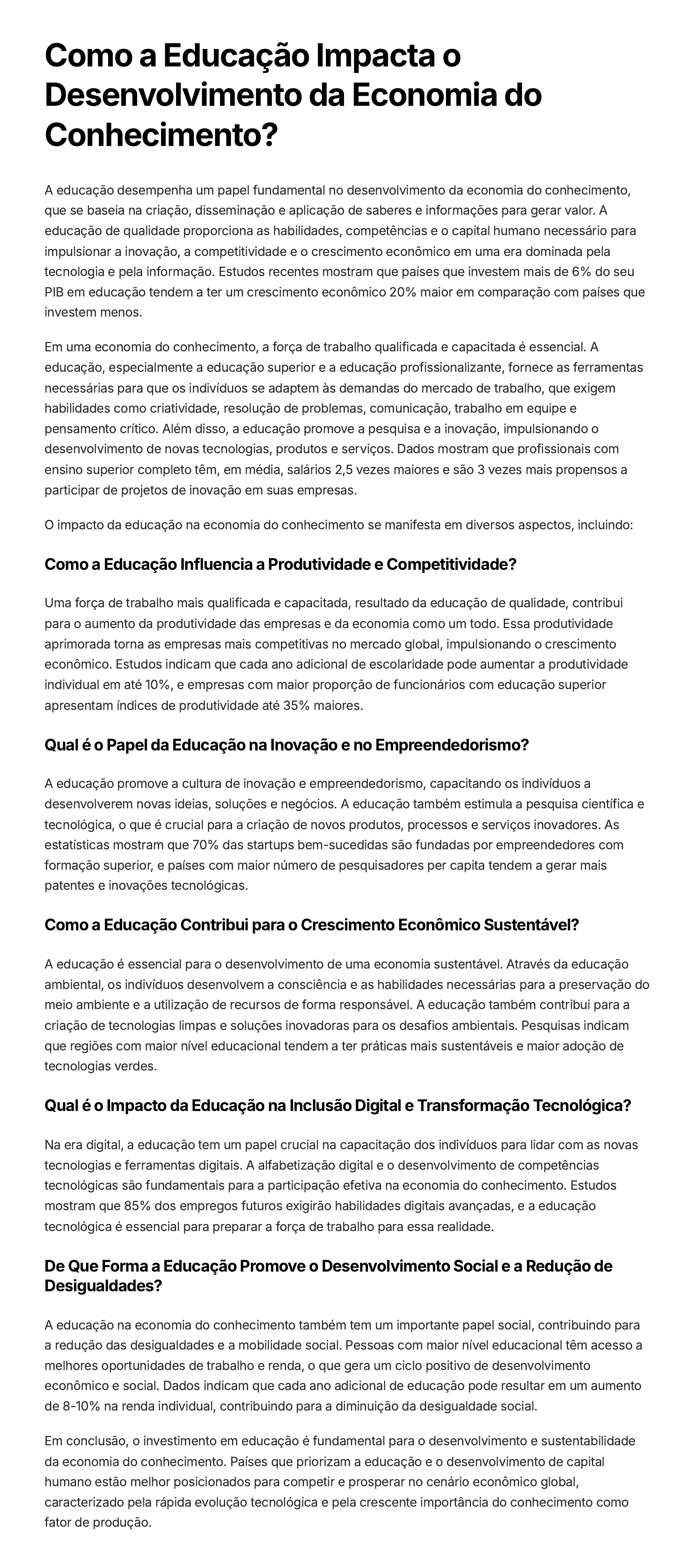 Como a Educação Impacta o Desenvolvimento da Economia do Conhecimento? A educação desempenha um papel fundamental no desenvolvimento da economia do conhecimento, que se baseia na criação, disseminação e aplicação de saberes e informações para gerar valor. A educação de qualidade proporciona as habilidades, competências e o capital humano necessário para impulsionar a inovação, a competitividade e o crescimento econômico em uma era dominada pela tecnologia e pela informação. Estudos recentes mostram que países que investem mais de 6% do seu PIB em educação tendem a ter um crescimento econômico 20% maior em comparação com países que investem menos. Em uma economia do conhecimento, a força de trabalho qualificada e capacitada é essencial. A educação, especialmente a educação superior e a educação profissionalizante, fornece as ferramentas necessárias para que os indivíduos se adaptem às demandas do mercado de trabalho, que exigem habilidades como criatividade, resolução de problemas, comunicação, trabalho em equipe e pensamento crítico. Além disso, a educação promove a pesquisa e a inovação, impulsionando o desenvolvimento de novas tecnologias, produtos e serviços. Dados mostram que profissionais com ensino superior completo têm, em média, salários 2,5 vezes maiores e são 3 vezes mais propensos a participar de projetos de inovação em suas empresas. O impacto da educação na economia do conhecimento se manifesta em diversos aspectos, incluindo: Como a Educação Influencia a Produtividade e Competitividade? Uma força de trabalho mais qualificada e capacitada, resultado da educação de qualidade, contribui para o aumento da produtividade das empresas e da economia como um todo. Essa produtividade aprimorada torna as empresas mais competitivas no mercado global, impulsionando o crescimento econômico. Estudos indicam que cada ano adicional de escolaridade pode aumentar a produtividade individual em até 10%, e empresas com maior proporção de funcionários com educação superior apresentam índices de produtividade até 35% maiores. Qual é o Papel da Educação na Inovação e no Empreendedorismo? A educação promove a cultura de inovação e empreendedorismo, capacitando os indivíduos a desenvolverem novas ideias, soluções e negócios. A educação também estimula a pesquisa científica e tecnológica, o que é crucial para a criação de novos produtos, processos e serviços inovadores. As estatísticas mostram que 70% das startups bem-sucedidas são fundadas por empreendedores com formação superior, e países com maior número de pesquisadores per capita tendem a gerar mais patentes e inovações tecnológicas. Como a Educação Contribui para o Crescimento Econômico Sustentável? A educação é essencial para o desenvolvimento de uma economia sustentável. Através da educação ambiental, os indivíduos desenvolvem a consciência e as habilidades necessárias para a preservação do meio ambiente e a utilização de recursos de forma responsável. A educação também contribui para a criação de tecnologias limpas e soluções inovadoras para os desafios ambientais. Pesquisas indicam que regiões com maior nível educacional tendem a ter práticas mais sustentáveis e maior adoção de tecnologias verdes. Qual é o Impacto da Educação na Inclusão Digital e Transformação Tecnológica? Na era digital, a educação tem um papel crucial na capacitação dos indivíduos para lidar com as novas tecnologias e ferramentas digitais. A alfabetização digital e o desenvolvimento de competências tecnológicas são fundamentais para a participação efetiva na economia do conhecimento. Estudos mostram que 85% dos empregos futuros exigirão habilidades digitais avançadas, e a educação tecnológica é essencial para preparar a força de trabalho para essa realidade. De Que Forma a Educação Promove o Desenvolvimento Social e a Redução de Desigualdades? A educação na economia do conhecimento também tem um importante papel social, contribuindo para a redução das desigualdades e a mobilidade social. Pessoas com maior nível educacional têm acesso a melhores oportunidades de trabalho e renda, o que gera um ciclo positivo de desenvolvimento econômico e social. Dados indicam que cada ano adicional de educação pode resultar em um aumento de 8-10% na renda individual, contribuindo para a diminuição da desigualdade social. Em conclusão, o investimento em educação é fundamental para o desenvolvimento e sustentabilidade da economia do conhecimento. Países que priorizam a educação e o desenvolvimento de capital humano estão melhor posicionados para competir e prosperar no cenário econômico global, caracterizado pela rápida evolução tecnológica e pela crescente importância do conhecimento como fator de produção.