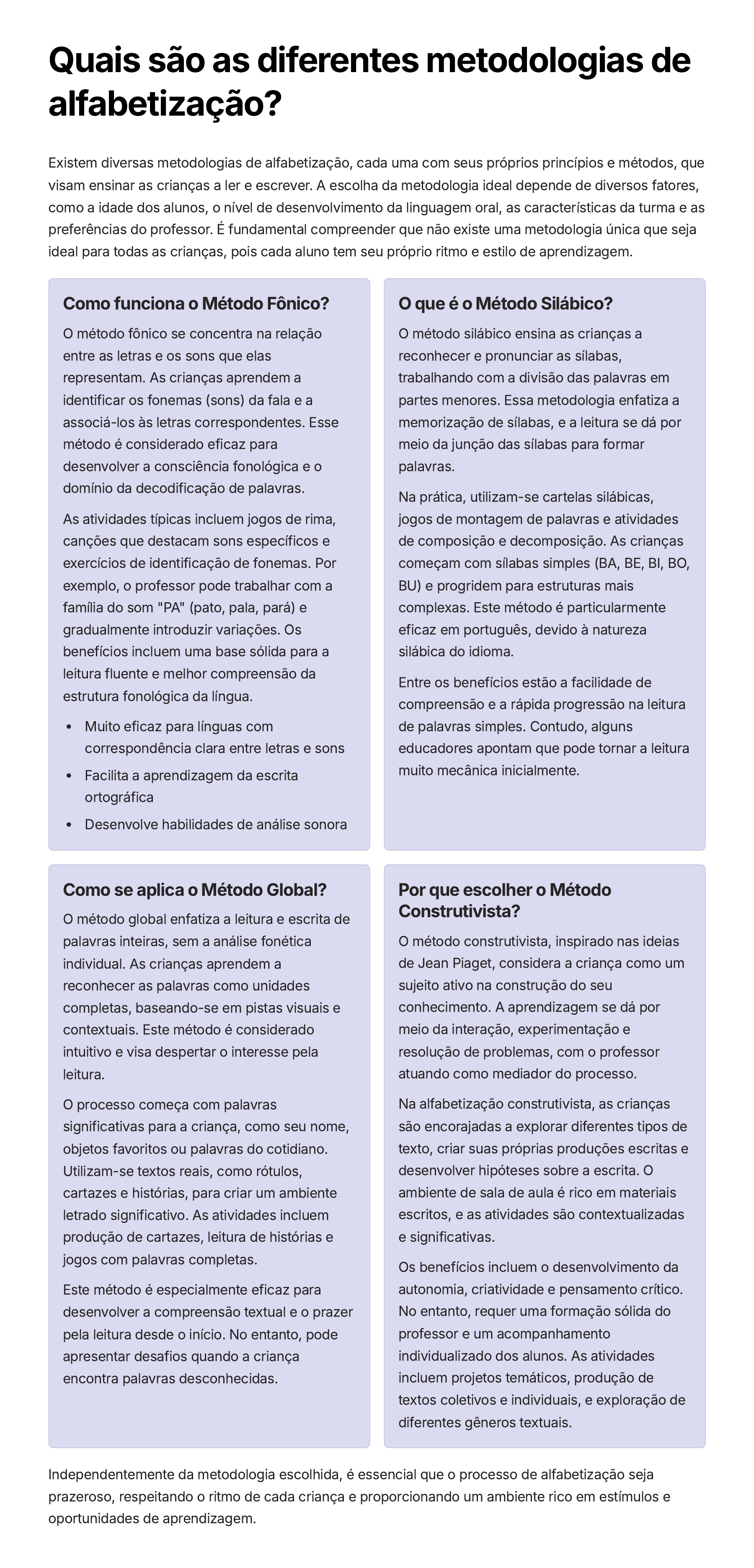 Quais são as diferentes metodologias de alfabetização? Existem diversas metodologias de alfabetização, cada uma com seus próprios princípios e métodos, que visam ensinar as crianças a ler e escrever. A escolha da metodologia ideal depende de diversos fatores, como a idade dos alunos, o nível de desenvolvimento da linguagem oral, as características da turma e as preferências do professor. É fundamental compreender que não existe uma metodologia única que seja ideal para todas as crianças, pois cada aluno tem seu próprio ritmo e estilo de aprendizagem. Como funciona o Método Fônico? O método fônico se concentra na relação entre as letras e os sons que elas representam. As crianças aprendem a identificar os fonemas (sons) da fala e a associá-los às letras correspondentes. Esse método é considerado eficaz para desenvolver a consciência fonológica e o domínio da decodificação de palavras. As atividades típicas incluem jogos de rima, canções que destacam sons específicos e exercícios de identificação de fonemas. Por exemplo, o professor pode trabalhar com a família do som "PA" (pato, pala, pará) e gradualmente introduzir variações. Os benefícios incluem uma base sólida para a leitura fluente e melhor compreensão da estrutura fonológica da língua. Muito eficaz para línguas com correspondência clara entre letras e sons Facilita a aprendizagem da escrita ortográfica Desenvolve habilidades de análise sonora O que é o Método Silábico? O método silábico ensina as crianças a reconhecer e pronunciar as sílabas, trabalhando com a divisão das palavras em partes menores. Essa metodologia enfatiza a memorização de sílabas, e a leitura se dá por meio da junção das sílabas para formar palavras. Na prática, utilizam-se cartelas silábicas, jogos de montagem de palavras e atividades de composição e decomposição. As crianças começam com sílabas simples (BA, BE, BI, BO, BU) e progridem para estruturas mais complexas. Este método é particularmente eficaz em português, devido à natureza silábica do idioma. Entre os benefícios estão a facilidade de compreensão e a rápida progressão na leitura de palavras simples. Contudo, alguns educadores apontam que pode tornar a leitura muito mecânica inicialmente. Como se aplica o Método Global? O método global enfatiza a leitura e escrita de palavras inteiras, sem a análise fonética individual. As crianças aprendem a reconhecer as palavras como unidades completas, baseando-se em pistas visuais e contextuais. Este método é considerado intuitivo e visa despertar o interesse pela leitura. O processo começa com palavras significativas para a criança, como seu nome, objetos favoritos ou palavras do cotidiano. Utilizam-se textos reais, como rótulos, cartazes e histórias, para criar um ambiente letrado significativo. As atividades incluem produção de cartazes, leitura de histórias e jogos com palavras completas. Este método é especialmente eficaz para desenvolver a compreensão textual e o prazer pela leitura desde o início. No entanto, pode apresentar desafios quando a criança encontra palavras desconhecidas. Por que escolher o Método Construtivista? O método construtivista, inspirado nas ideias de Jean Piaget, considera a criança como um sujeito ativo na construção do seu conhecimento. A aprendizagem se dá por meio da interação, experimentação e resolução de problemas, com o professor atuando como mediador do processo. Na alfabetização construtivista, as crianças são encorajadas a explorar diferentes tipos de texto, criar suas próprias produções escritas e desenvolver hipóteses sobre a escrita. O ambiente de sala de aula é rico em materiais escritos, e as atividades são contextualizadas e significativas. Os benefícios incluem o desenvolvimento da autonomia, criatividade e pensamento crítico. No entanto, requer uma formação sólida do professor e um acompanhamento individualizado dos alunos. As atividades incluem projetos temáticos, produção de textos coletivos e individuais, e exploração de diferentes gêneros textuais. Independentemente da metodologia escolhida, é essencial que o processo de alfabetização seja prazeroso, respeitando o ritmo de cada criança e proporcionando um ambiente rico em estímulos e oportunidades de aprendizagem.