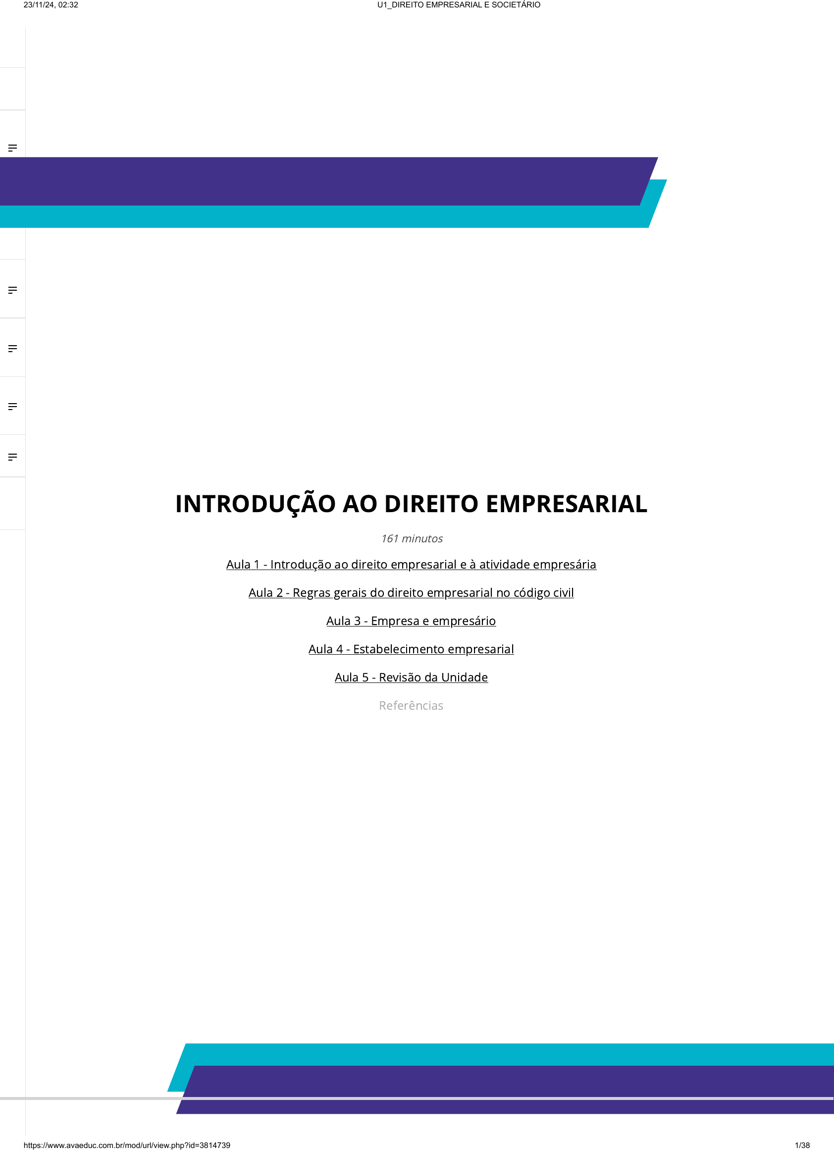 INTRODUÇÃO AO DIREITO EMPRESARIAL 161 minutos Aula 1 - Introdução ao direito empresarial e à atividade empresária Aula 2 - Regras gerais do direito empresarial no código civil Aula 3 - Empresa e empresário Aula 4 - Estabelecimento empresarial Aula 5 - Revisão da Unidade Referências 23/11/24, 02:32 U1_DIREITO EMPRESARIAL E SOCIETÁRIO https://www.avaeduc.com.br/mod/url/view.php?id=3814739 1/38 INTRODUÇÃO Olá estudante! Os produtos e serviços que você consome no seu dia-a-dia são o resultado de uma atividade econômica organizada. Para que uma empresa possa gerar empregos, produzir bens ou prestar serviços e contribuir para a melhoria da qualidade de vida de seus colaboradores, clientes e consumidores, há normas e princípios a serem respeitados, assuntos que abordaremos nesta unidade. Para iniciarmos o estudo do Direito Empresarial e Societário, é imprescindível a análise do conceito, da origem, da evolução e das fontes do Direito Empresarial para que em segundo plano possamos compreender os princípios que regem a atividade empresarial e o modo como impactam na expansão e crescimento de empresas. Após essa jornada, esperamos que você seja capaz de compreender a importância de tais institutos como ferramentas para garantir o desenvolvimento econômico, a valorização do trabalho humano e, principalmente, a existência digna de todos. Vamos aos estudos! VAMOS CONHECER O DIREITO EMPRESARIAL? Com a evolução do comércio na Idade Média, o Estado sentiu a necessidade de regulamentar os direitos e deveres dos comerciantes (CHAGAS, 2022, p.72). No Brasil, inicialmente, o direito empresarial era conhecido como direito comercial por in�uência do Código Francês de 1807, elaborado com base na teoria dos atos de comércio (CHAGAS, 2022, p. 85). Aula 1 INTRODUÇÃO AO DIREITO EMPRESARIAL E À ATIVIDADE EMPRESÁRIA Para iniciarmos o estudo do Direito Empresarial e Societário, é imprescindível a análise do conceito, da origem, da evolução e das fontes do Direito Empresarial para que em segundo plano possamos compreender os princípios que regem a atividade empresarial e o modo como impactam na expansão e crescimento de empresas. 30 minutos 23/11/24, 02:32 U1_DIREITO EMPRESARIAL E SOCIETÁRIO https://www.avaeduc.com.br/mod/url/view.php?id=3814739 2/38 Imprimir A Carta Régia de 1808 abriu os portos do Brasil para o comércio exterior. Posteriormente, o Estado autorizou o livre estabelecimento de fábricas no país e criou o Tribunal da Real Junta do Comércio, Fábrica e Navegação (CHAGAS, 2022, p.92). Em 1850 entrou em vigor o Código Comercial, considerado a primeira regulamentação do direito empresarial no país. Com a aprovação do Código Civil de 2002, a maioria dos dispositivos do Código Comercial foram revogados. Em geral, "o direito empresarial é o ramo do direito que tem por objeto a regulamentação da atividade econômica daqueles que atuam na circulação ou produção de bens, bem como na prestação de serviços" (VIDO, 2022, p.32). Agora que já compreendemos a evolução e o conceito de direito empresarial, você pode estar questionando: quais são as fontes desse ramo do direito? São fontes primárias do direito empresarial: a Constituição da República, o Código Civil, o Código Comercial, os Tratados e Convenções Internacionais e as leis especiais, como por exemplo, a Lei de Falência e Recuperação de Empresas (Lei nº 11.101/2005). Importante destacar que embora não haja harmonia sobre o tema, alguns doutrinadores reconhecem a jurisprudência e a doutrina como fontes do direito empresarial. Além das fontes primárias, nosso ordenamento jurídico reconhece a existência de fontes secundárias, tais como a analogia, os costumes, os princípios gerais de direito e os princípios especiais do direito empresarial que serão analisados a seguir. A Constituição da República elenca que o nosso país tem como fundamento: a soberania, a cidadania, a dignidade da pessoa humana, os valores sociais do trabalho e da livre iniciativa e o pluralismo político. O princípio da livre iniciativa garante que qualquer pessoa possa empreender sem a necessidade de aprovação do Estado. Atenção: a livre iniciativa não �exibiliza o cumprimento de obrigações legais, como por exemplo, a inscrição na Junta Comercial, o recolhimento de tributos e a preservação do meio ambiente. O artigo 170 da Constituição da República elenca como base da ordem econômica a livre iniciativa e estabelece que deve ser respeitada a livre concorrência. A livre concorrência permite que sejam oferecidos diversos produtos e serviços no mercado, do mesmo segmento, mas por empresas concorrentes, o que favorece o consumidor, pois tem liberdade e poder de escolha. 23/11/24, 02:32 U1_DIREITO EMPRESARIAL E SOCIETÁRIO https://www.avaeduc.com.br/mod/url/view.php?id=3814739 3/38 De acordo com o princípio da função social da empresa, as empresas são importantes para a economia em geral, contribuindo para a circulação da moeda, criação de postos de emprego, produção de bens e prestação de serviços indispensáveis. Há, portanto, utilidade social e interesse coletivo. Diante da função social da empresa, é de interesse da coletividade a manutenção da atividade econômica (princípio da preservação da empresa). É importante ressaltar que tal princípio pauta o procedimento de recuperação de empresas previsto na Lei nº 11.101/2005): VAMOS APROFUNDAR OS ESTUDOS DO DIREITO EMPRESARIAL? Como dito, a Constituição da República, o Código Civil e a legislação especial são consideradas fontes do direito empresarial. Logo em seu artigo 1º, a Constituição faz referência à livre iniciativa. O legislador constituinte dedicou o título VII, da Constituição, para os princípios gerais da atividade econômica. Já o Código Civil, estabelece o conceito de empresário, os tipos societários, as diretrizes aplicáveis ao estabelecimento empresarial