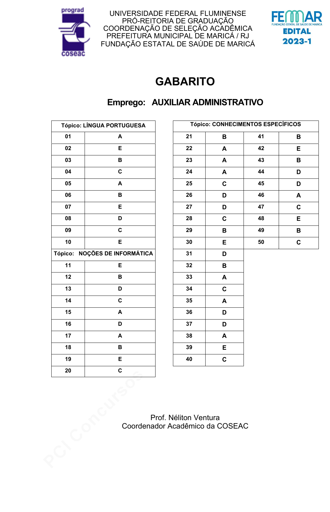 pcimarkpci MDAwMDowMDAwOjAwMDA6MDAwMDowMDAwOmZmZmY6YjM2YjpmZWEz:U2F0LCAyMyBOb3YgMjAyNCAwODo0NjoyMiAtMDMwMA== www.pciconcursos.com.br UNIVERSIDADE FEDERAL FLUMINENSE PRÓ-REITORIA DE GRADUAÇÃO COORDENAÇÃO DE SELEÇÃO ACADÊMICA PREFEITURA MUNICIPAL DE MARICÁ / RJ FUNDAÇÃO ESTATAL DE SAÚDE DE MARICÁ GABARITO Emprego: AUXILIAR ADMINISTRATIVO Prof. Néliton Ventura Coordenador Acadêmico da COSEAC Tópico: LÍNGUA PORTUGUESA Tópico: CONHECIMENTOS ESPECÍFICOS 01 A 21 B 41 B 02 E 22 A 42 E 03 B 23 A 43 B 04 C 24 A 44 D 05 A 25 C 45 D 06 B 26 D 46 A 07 E 27 D 47 C 08 D 28 C 48 E 09 C 29 B 49 B 10 E 30 E 50 C Tópico: NOÇÕES DE INFORMÁTICA 31 D 11 E 32 B 12 B 33 A 13 D 34 C 14 C 35 A 15 A 36 D 16 D 37 D 17 A 38 A 18 B 39 E 19 E 40 C 20 C pcimarkpci MDAwMDowMDAwOjAwMDA6MDAwMDowMDAwOmZmZmY6YjM2YjpmZWEz:U2F0LCAyMyBOb3YgMjAyNCAwODo0NjoyMiAtMDMwMA== www.pciconcursos.com.br UNIVERSIDADE FEDERAL FLUMINENSE PRÓ-REITORIA DE GRADUAÇÃO COORDENAÇÃO DE SELEÇÃO ACADÊMICA PREFEITURA MUNICIPAL DE MARICÁ / RJ FUNDAÇÃO ESTATAL DE SAÚDE DE MARICÁ GABARITO Cargo: TRADUTOR E INTÉRPRETE DE LIBRAS Prof. Néliton Ventura Coordenador Acadêmico da COSEAC Tópico: LÍNGUA PORTUGUESA Tópico: CONHECIMENTOS ESPECÍFICOS 01 A 21 E 41 D 02 E 22 D 42 D 03 B 23 B 43 B 04 C 24 C 44 C 05 A 25 A 45 D 06 B 26 D 46 C 07 E 27 B 47 C 08 D 28 A 48 E 09 C 29 A 49 D 10 E 30 A 50 E Tópico: NOÇÕES DE INFORMÁTICA 31 A 11 E 32 A 12 B 33 C 13 D 34 E 14 C 35 B 15 A 36 C 16 D 37 B 17 A 38 B 18 B 39 A 19 E 40 A 20 C pcimarkpci MDAwMDowMDAwOjAwMDA6MDAwMDowMDAwOmZmZmY6YjM2YjpmZWEz:U2F0LCAyMyBOb3YgMjAyNCAwODo0NjoyMiAtMDMwMA== www.pciconcursos.com.br UNIVERSIDADE FEDERAL FLUMINENSE PRÓ-REITORIA DE GRADUAÇÃO COORDENAÇÃO DE SELEÇÃO ACADÊMICA PREFEITURA MUNICIPAL DE MARICÁ / RJ FUNDAÇÃO ESTATAL DE SAÚDE DE MARICÁ GABARITO APÓS RECURSO Emprego: AGENTE DE AÇÃO SOCIAL Questão 13 - ANULADA Prof. Néliton Ventura Coordenador Acadêmico da COSEAC Tópico: LÍNGUA PORTUGUESA Tópico: CONHECIMENTOS ESPECÍFICOS 01 A 21 A 41 E 02 E 22 B 42 B 03 B 23 A 43 B 04 C 24 D 44 B 05 A 25 A 45 D 06 B 26 C 46 A 07 E 27 A 47 D 08 D 28 E 48 B 09 C 29 E 49 E 10 E 30 D 50 A Tópico: NOÇÕES DO SUS 31 A 11 E 32 C 12 B 33 A 13 ANULADA 34 A 14 E 35 D 15 C 36 D 16 A 37 D 17 D 38 B 18 C 39 A 19 B 40 C 20 D pcimarkpci MDAwMDowMDAwOjAwMDA6MDAwMDowMDAwOmZmZmY6YjM2YjpmZWEz:U2F0LCAyMyBOb3YgMjAyNCAwODo0NjoyMiAtMDMwMA== www.pciconcursos.com.br UNIVERSIDADE FEDERAL FLUMINENSE PRÓ-REITORIA DE GRADUAÇÃO COORDENAÇÃO DE SELEÇÃO ACADÊMICA PREFEITURA MUNICIPAL DE MARICÁ / RJ FUNDAÇÃO ESTATAL DE SAÚDE DE MARICÁ GABARITO APÓS RECURSO Emprego: AGENTE INDÍGENA Questão 13 - ANULADA Prof. Néliton Ventura Coordenador Acadêmico da COSEAC Tópico: LÍNGUA PORTUGUESA Tópico: CONHECIMENTOS ESPECÍFICOS 01 A 21 C 41 E 02 E 22 C 42 E 03 B 23 B 43 A 04 C 24 E 44 E 05 A 25 A 45 D 06 B 26 C 46 B 07 E 27 A 47 A 08 D 28 B 48 A 09 C 29 A 49 C 10 E 30 B 50 A Tópico: NOÇÕES DO SUS 31 E 11 E 32 D 12 B 33 C 13 ANULADA 34 B 14 E 35 C 15 C 36 A 16 A 37 E 17 D 38 C 18 C 39 A 19 B 40 B 20 D pcimarkpci MDAwMDowMDAwOjAwMDA6MDAwMDowMDAwOmZmZmY6YjM2YjpmZWEz:U2F0LCAyMyBOb3YgMjAyNCAwODo0NjoyMiAtMDMwMA== www.pciconcursos.com.br UNIVERSIDADE FEDERAL FLUMINENSE PRÓ-REITORIA DE GRADUAÇÃO COORDENAÇÃO DE SELEÇÃO ACADÊMICA PREFEITURA MUNICIPAL DE MARICÁ / RJ FUNDAÇÃO ESTATAL DE SAÚDE DE MARICÁ GABARITO APÓS RECURSOS Emprego: ARTE EDUCADOR Questão 46 - ANULADA Prof. Néliton Ventura Coordenador Acadêmico da COSEAC Tópico: LÍNGUA PORTUGUESA Tópico: CONHECIMENTOS ESPECÍFICOS 01 A 21 B 41 C 02 E 22 C 42 D 03 B 23 C 43 E 04 C 24 D 44 B 05 A 25 B 45 A 06 B 26 E 46 ANULADA 07 E 27 A 47 A 08 D 28 B 48 A 09 C 29 A 49 E 10 E 30 C 50 C Tópico: NOÇÕES DE INFORMÁTICA 31 C 11 E 32 E 12 B 33 D 13 D 34 B 14 C 35 A 15 A 36 D 16 D 37 E 17 A 38 A 18 B 39 A 19 E 40 C 20 C pcimarkpci MDAwMDowMDAwOjAwMDA6MDAwMDowMDAwOmZmZmY6YjM2YjpmZWEz:U2F0LCAyMyBOb3YgMjAyNCAwODo0NjoyMiAtMDMwMA== www.pciconcursos.com.br GABARITO APÓS RECURSO UNIVERSIDADE FEDERAL FLUMINENSE PRÓ-REITORIA DE GRADUAÇÃO COORDENAÇÃO DE SELEÇÃO ACADÊMICA PREFEITURA MUNICIPAL DE MARICÁ / RJ FUNDAÇÃO ESTATAL DE SAÚDE DE MARICÁ Emprego: AUXILIAR DE FARMÁCIA Questões 13 e 48 –ANULADAS Questão 40 – ALTERADA DE D PARA E Prof. Néliton Ventura Coordenador Acadêmico da COSEAC Tópico: Língua Portuguesa Tópico: Conhecimentos Específicos 01 A 21 B 41 C 02 E 22 C 42 A 03 B 23 D 43 C 04 C 24 D 44 A 05 A 25 B 45 E 06 B 26 A 46 C 07 E 27 A 47 D 08 D 28 E 48 ANULADA 09 C 29 E 49 E 10 E 30 D 50 E Tópico: Noções do SUS 31 B 11 E 32 A 12 B 33 D 13 ANULADA 34 C 14 E 35 E 15 C 36 D 16 A 37 D 17 D 38 B 18 C 39 A 19 B 40 E 20 D pcimarkpci MDAwMDowMDAwOjAwMDA6MDAwMDowMDAwOmZmZmY6YjM2YjpmZWEz:U2F0LCAyMyBOb3YgMjAyNCAwODo0NjoyMiAtMDMwMA== www.pciconcursos.com.br UNIVERSIDADE FEDERAL FLUMINENSE PRÓ-REITORIA DE GRADUAÇÃO COORDENAÇÃO DE SELEÇÃO ACADÊMICA PREFEITURA MUNICIPAL DE MARICÁ / RJ FUNDAÇÃO ESTATAL DE SAÚDE DE MARICÁ GABARITO APÓS RECURSO Emprego: AUXILIAR EM SAÚDE BUCAL Tópico: LÍNGUA PORTUGUESA Tópico: CONHECIMENTOS ESPECÍFICOS 01 A 21 C 41 E 02 E 22 E 42 A 03 B 23 C 43 B 04 C 24 D 44 A 05 A 25 D 45 E 06 B 26 C 46 C 07 E 27 C 47 D 08 D 28 A 48 C 09 C 29 C 49 B 10 E 30 E 50 E Tópico: NOÇÕES DO SUS 31 B 11 E 32 E 12 B 33 B 13 ANULADA 34 C 14 E 35 B 15 C 36 D 16 A 37 D 17 D 38 D 18 C 39 A 19 B 40 A 20 D Questão 13 - ANULADA Prof. Néliton Ventura Coordenador Acadêmico da COSEAC pcimarkpci MDAwMDowMDAwOjAwMDA6MDAwMDowMDAwOmZmZmY6YjM2YjpmZWEz:U2F0LCAyMyBOb3YgMjAyNCAwODo0NjoyMiAtMDMwMA== www.pciconcursos.com.br UNIVERSIDADE FEDERAL FLUMINENSE PRÓ-REITORIA DE GRADUAÇÃO COORDENAÇÃO DE SELEÇÃO ACADÊMICA PREFEITURA MUNICIPAL DE MARICÁ / RJ FUNDAÇÃO ESTATAL DE SAÚDE DE MARICÁ GABARITO APÓS RECURSO Emprego: CUIDADOR DE SAÚDE Questão 13 - ANULADA Prof. Néliton Ventura Coordenador Acadêmico da COSEAC Tópico: LÍNGUA PORTUGUESA Tópico: CONHECIMENTOS ESPECÍFICO