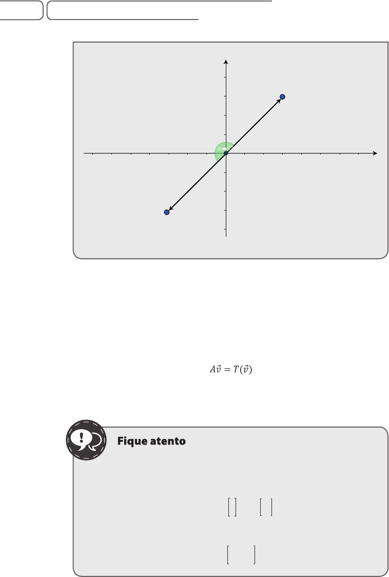 –7 –6 –5 –4 –3 –2 –1 1 2 3 4 4 3 2 1 –1 –2 –3 –4 5 6 7 (–x,–y) (x,y) v u α = C30º 0 Figura 3. Transformação geométrica rotacionando vetores 180º em torno da origem o x. De maneira geral, algumas transformações geométricas no plano R2 podem ser induzidas, ou representadas, por transformações matriciais. Se T é uma transformação geométrica do plano, então, caso exista uma matriz A que induza tal transformação, ela deve satisfazer: para todo v→ no plano R2. A igualdade acima deve ser válida para v→ no plano R2. Perceba, por exemplo, que a rotação de 180º apresentada no exemplo anterior é igual à transformação de reflexão em torno do eixo y para os vetores v→ = 1 0 e u→ = –1 0 , mas não para os demais do plano. Com efeito, a matriz que induz a transformação de reflexão em torno do eixo y apresenta a seguinte forma: Ref = –1 0 0 1 Geometria vetorial e transformações lineares4 Ainda sobre matrizes de rotação no plano, é importante destacar que elas apresentam uma forma geral. Dada uma transformação geométrica no plano de rotação em torno da origem por um ângulo de θº, a matriz que induz essa transformação é dada por: Vamos determinar a matriz que induz a rotação de 45º em torno da origem no plano euclidiano. Pela forma geral apresentada anteriormente, tem-se: Rθ = cos 45º –sen 45º sen 45º cos 45º Lembrando-se de que cos 45º = sin 45º = √2 2 , obtemos: √2 2 √2 2 √2 2 √2 2 – Rθ = A seguir, você verá um importante resultado apresentado em Nicholson (2006), que nos permite determinar as matrizes que induzem reflexões e projeções para uma reta que passa pela origem do plano R2. Teorema: considere a reta y = mx que passa pela origem e tem inclinação m. Então, a projeção Pm sobre a reta e a reflexão Qm em torno da reta são ambas as transformações matriciais no plano euclidiano. Mais precisamente: Você poderá encontrar a demonstração desse teorema em Nicholson (2006). Veja, a seguir, um exemplo de como podemos utilizar esse resultado. 5Geometria vetorial e transformações lineares Considere a reta de equação y = 2x. Vamos determinar a reflexão do vetor v→ = 1 –3 em torno dessa reta. Primeiramente, utilizaremos o teorema anteriormente apresentado para encontra a matriz Q que induz tal transformação. Como o coeficiente angular da reta é m = 2, temos: Q = ×1 1 + 22 1 – 22 2 × 2 2 × 2 22–1 Q = ×1 5 –3 4 4 3 Q = –3 5 4 5 4 5 3 5 Agora, vamos calcular o resultado da ação da matriz Q sobre o vetor v→ = 1 –3 . Obtemos: Q = = = –3 5 4 5 4 5 3 5 –3 5 4 5 4 5 3 5 1 –3 –3 –1 × 1 + × 1 + × (–3) × (–3) Veja, na Figura 4, a representação dessa transformação. 4 2 –2 0–2 2 4 6 –4 –4–6 y = 2x E Qv v A D Figura 4. Reflexão do vetor v → = 1 –3 em torno da reta y = 2x. Cabe destacar que nem toda matriz de ordem 2x2 representa uma transformação geométrica do plano. Geometria vetorial e transformações lineares6