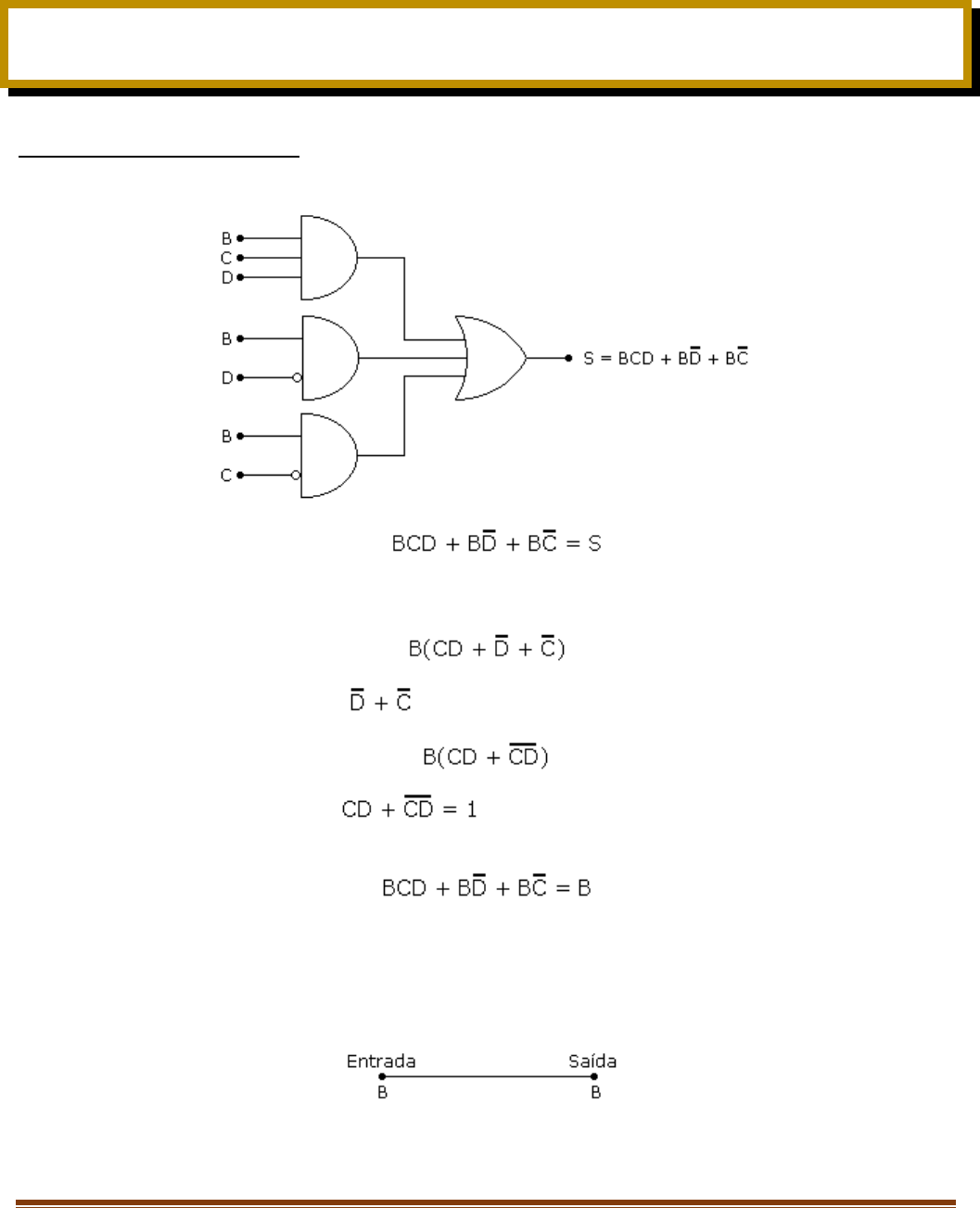 Eletrônica Digital – Álgebra de Boole – Exercícios resolvidos – Prof. Edgar Zuim Página 1 ÁLGEBRA DE BOOLE Exercícios resolvidos Exercícios resolvidos: 1. Simplificar o circuito abaixo: A expressão booleana do circuito é: Colocando B em evidência: Aplicando De Morgan em : Pelo postulado: , logo: B.1 = B Portanto: Conclui-se que o resultado dessa expressão é idêntico ao valor assumido pela variável B. Podemos, portanto substituir todo o circuito por apenas um fio, conforme indica a figura abaixo: 2. Simplificar a expressão booleana abaixo: Eletrônica Digital – Álgebra de Boole – Exercícios resolvidos – Prof. Edgar Zuim Página 2 Aplicando De Morgan – I Aplicando De Morgan – II Multiplicando: Multiplicando: Temos então: Colocando D em evidência: RESPOSTA: 3. Simplificar a expressão booleana abaixo: Assim: Eletrônica Digital – Álgebra de Boole – Exercícios resolvidos – Prof. Edgar Zuim Página 3 Daí: RESPOSTA: 4. Simplificar a expressão booleana abaixo: Multiplicando os dois termos: Teremos então: Teremos então: A expressão representa uma porta “ou exclusivo” e desta forma a expressão deve ser assim escrita: Eletrônica Digital – Álgebra de Boole – Exercícios resolvidos – Prof. Edgar Zuim Página 4 Então, o circuito correspondente a simplificação proposta deverá ser desenhado conforme figura abaixo: EXERCÍCIO PROPOSTO: 1. Simplificar a expressão booleana abaixo. 2. Desenhar o circuito antes e depois da simplificação. 3. Simular no EWB e apresentar conclusões, através da comprovação nas tabelas da verdade.