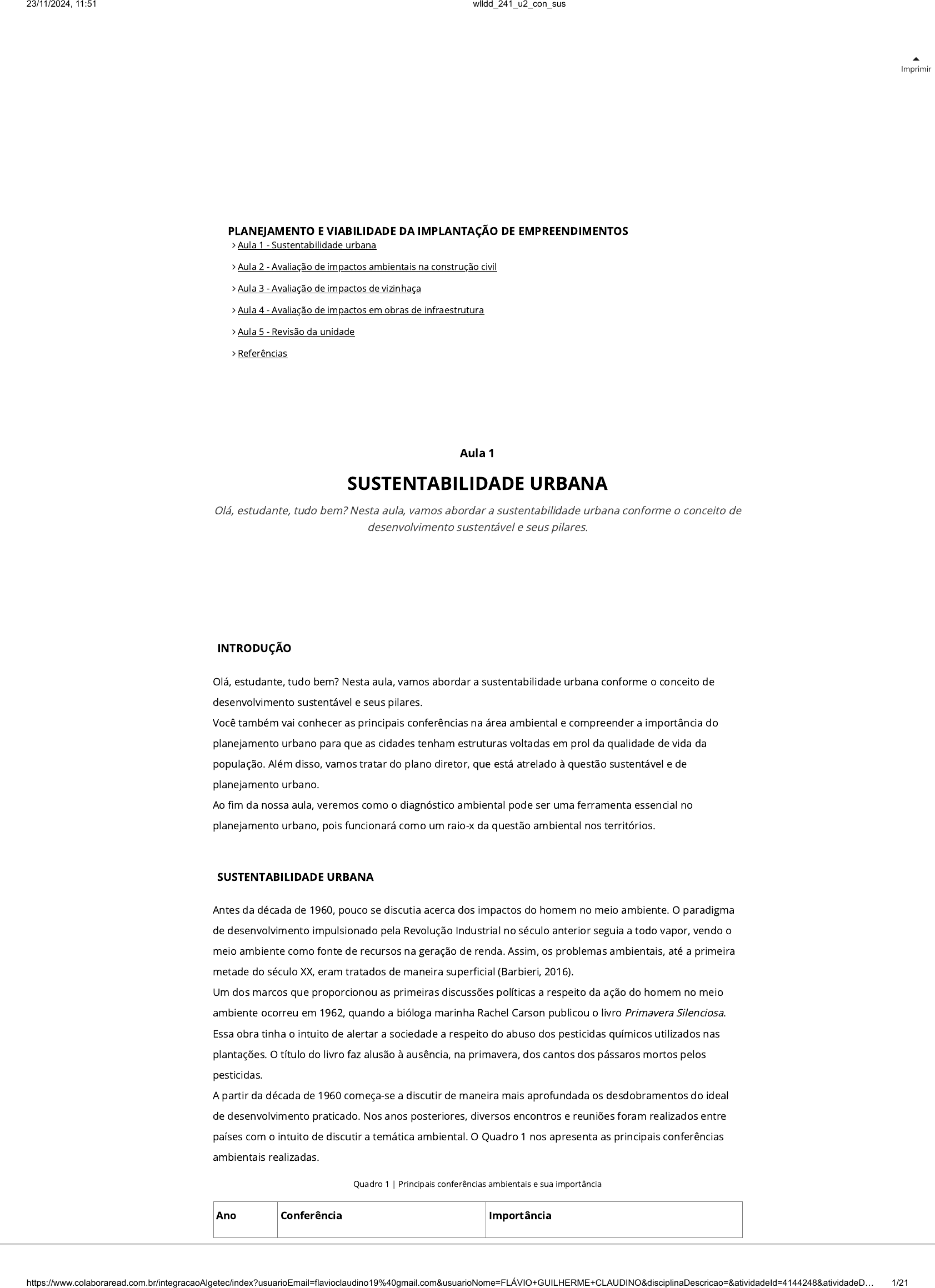 Imprimir INTRODUÇÃO Olá, estudante, tudo bem? Nesta aula, vamos abordar a sustentabilidade urbana conforme o conceito de desenvolvimento sustentável e seus pilares. Você também vai conhecer as principais conferências na área ambiental e compreender a importância do planejamento urbano para que as cidades tenham estruturas voltadas em prol da qualidade de vida da população. Além disso, vamos tratar do plano diretor, que está atrelado à questão sustentável e de planejamento urbano. Ao �m da nossa aula, veremos como o diagnóstico ambiental pode ser uma ferramenta essencial no planejamento urbano, pois funcionará como um raio-x da questão ambiental nos territórios. SUSTENTABILIDADE URBANA Antes da década de 1960, pouco se discutia acerca dos impactos do homem no meio ambiente. O paradigma de desenvolvimento impulsionado pela Revolução Industrial no século anterior seguia a todo vapor, vendo o meio ambiente como fonte de recursos na geração de renda. Assim, os problemas ambientais, até a primeira metade do século XX, eram tratados de maneira super�cial (Barbieri, 2016). Um dos marcos que proporcionou as primeiras discussões políticas a respeito da ação do homem no meio ambiente ocorreu em 1962, quando a bióloga marinha Rachel Carson publicou o livro Primavera Silenciosa. Essa obra tinha o intuito de alertar a sociedade a respeito do abuso dos pesticidas químicos utilizados nas plantações. O título do livro faz alusão à ausência, na primavera, dos cantos dos pássaros mortos pelos pesticidas. A partir da década de 1960 começa-se a discutir de maneira mais aprofundada os desdobramentos do ideal de desenvolvimento praticado. Nos anos posteriores, diversos encontros e reuniões foram realizados entre países com o intuito de discutir a temática ambiental. O Quadro 1 nos apresenta as principais conferências ambientais realizadas. Quadro 1 | Principais conferências ambientais e sua importância Ano Conferência Importância Aula 1 SUSTENTABILIDADE URBANA Olá, estudante, tudo bem? Nesta aula, vamos abordar a sustentabilidade urbana conforme o conceito de desenvolvimento sustentável e seus pilares. PLANEJAMENTO E VIABILIDADE DA IMPLANTAÇÃO DE EMPREENDIMENTOS Aula 1 - Sustentabilidade urbana Aula 2 - Avaliação de impactos ambientais na construção civil Aula 3 - Avaliação de impactos de vizinhaça Aula 4 - Avaliação de impactos em obras de infraestrutura Aula 5 - Revisão da unidade Referências 23/11/2024, 11:51 wlldd_241_u2_con_sus https://www.colaboraread.com.br/integracaoAlgetec/index?usuarioEmail=flavioclaudino19%40gmail.com&usuarioNome=FLÁVIO+GUILHERME+CLAUDINO&disciplinaDescricao=&atividadeId=4144248&atividadeD… 1/21 1972 Conferência das Nações Unidas sobre o Meio Ambiente (Conferência de Estocolmo, Suécia). Primeira manifestação dos governos de todo o mundo a respeito das consequências da economia sobre o meio ambiente. Criação do Programa das Nações Unidas sobre o Meio Ambiente (Pnuma). 1980 I Estratégia Mundial para a Conservação. Com a colaboração do Pnuma e do World Wide Fund for Nature (WWF), elaborou‐se um plano de longo prazo para a conservação dos recursos biológicos. 1992 Conferência das Nações Unidas sobre o Meio Ambiente e Desenvolvimento ou Cúpula da Terra. Foro mundial realizado com 170 países que abordou perspectivas globais e de integração relacionadas à questão ambiental e de�niu concretamente o modelo de desenvolvimento sustentável. Aprovação da Declaração do Rio e de outros documentos, incluindo a Agenda 21. 1997 Rio + 5. Realizada em Nova York, teve como objetivo analisar a implementação da Agenda 21. 1997 Conferência das Partes em Quioto. Marco no entendimento das relações entre economia e meio ambiente, reconhecendo a maior necessidade de estudos. O Protocolo de Quioto foi o principal resultado da Conferência, de�nindo cortes nas emissões de gases de efeito estufa. 2002 Cúpula Mundial sobre o Desenvolvimento Sustentável – Rio+10. Realizada em Johanesburgo, teve o objetivo de analisar se foram alcançadas as metas da Rio‐92 e reiterar os princípios de desenvolvimento sustentável. 2012 Conferência das Nações Unidas sobre Desenvolvimento Sustentável – Rio+20. Realizada no Rio de Janeiro, teve como foco a economia verde no contexto do desenvolvimento sustentável e a discussão da estrutura institucional para o desenvolvimento sustentável. 2015 Acordo de Paris. Realizada em Paris, indicou que os países devem trabalhar para que o aquecimento �que muito abaixo de 2 °C, buscando limitá‐lo a 1,5 °C. O acordo deve ser revisto a cada 5 anos. Fonte: adaptado de Barbieri (2016). Essas conferências perfazem um signi�cativo esforço de crítica dos limites do paradigma de desenvolvimento em curso (Sachs, 2007). O desenvolvimento sustentável é de�nido como o desenvolvimento que satisfaz as necessidades das gerações presentes, sem afetar a capacidade de gerações futuras de também satisfazerem suas próprias necessidades (Relatório Brundtland, 1987). É importante salientar a importância do relatório Nosso Futuro Comum. Segundo Sachs (1993), o tripé do desenvolvimento é entendido como algo que deve ser, simultaneamente: includente, do ponto de vista social; sustentável, do ponto de vista ecológico; e sustentado, do ponto de vista econômico. Além disso, esse método incorpora a visão ecológica nas empresas com base em três princípios: “Social: traz aspectos das pessoas e suas condições de vida, tais como saúde, educação e outros. Ambiental: referente aos recursos naturais e formas que são utilizados no planeta. Econômico: referente à produção, distribuição de bens e serviços” (Sachs, 1993, p. 5). Sachs (1993, p. 4) aponta cinco dimensões de sustentabilidade que devem ser observadas para planejar o desenvolvimento. São elas: sustentabilidade ecológica, sustentabilidade ambiental, sustentabilidade social, sustentabili