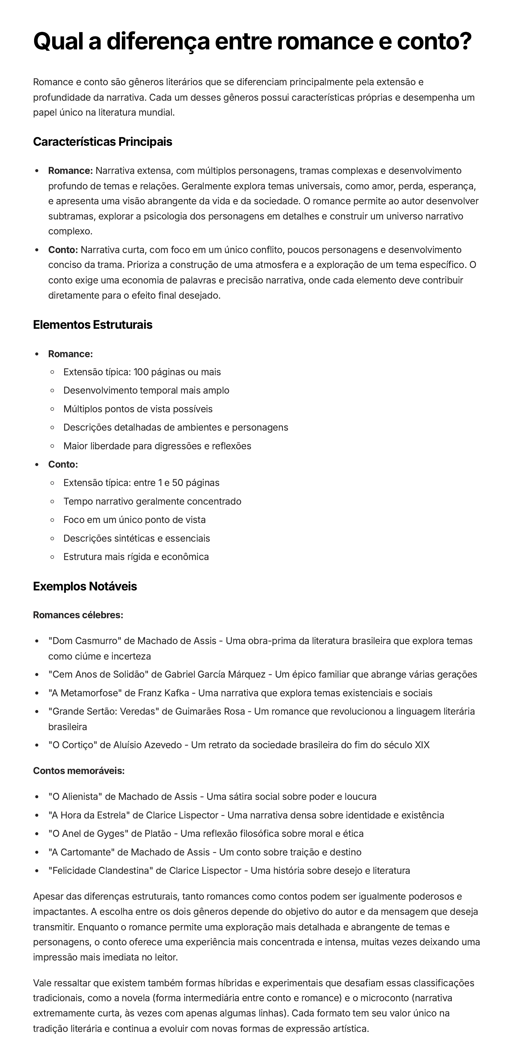 Qual a diferença entre romance e conto? Romance e conto são gêneros literários que se diferenciam principalmente pela extensão e profundidade da narrativa. Cada um desses gêneros possui características próprias e desempenha um papel único na literatura mundial. Características Principais Romance: Narrativa extensa, com múltiplos personagens, tramas complexas e desenvolvimento profundo de temas e relações. Geralmente explora temas universais, como amor, perda, esperança, e apresenta uma visão abrangente da vida e da sociedade. O romance permite ao autor desenvolver subtramas, explorar a psicologia dos personagens em detalhes e construir um universo narrativo complexo. Conto: Narrativa curta, com foco em um único conflito, poucos personagens e desenvolvimento conciso da trama. Prioriza a construção de uma atmosfera e a exploração de um tema específico. O conto exige uma economia de palavras e precisão narrativa, onde cada elemento deve contribuir diretamente para o efeito final desejado. Elementos Estruturais Romance: Extensão típica: 100 páginas ou mais Desenvolvimento temporal mais amplo Múltiplos pontos de vista possíveis Descrições detalhadas de ambientes e personagens Maior liberdade para digressões e reflexões Conto: Extensão típica: entre 1 e 50 páginas Tempo narrativo geralmente concentrado Foco em um único ponto de vista Descrições sintéticas e essenciais Estrutura mais rígida e econômica Exemplos Notáveis Romances célebres: "Dom Casmurro" de Machado de Assis - Uma obra-prima da literatura brasileira que explora temas como ciúme e incerteza "Cem Anos de Solidão" de Gabriel García Márquez - Um épico familiar que abrange várias gerações "A Metamorfose" de Franz Kafka - Uma narrativa que explora temas existenciais e sociais "Grande Sertão: Veredas" de Guimarães Rosa - Um romance que revolucionou a linguagem literária brasileira "O Cortiço" de Aluísio Azevedo - Um retrato da sociedade brasileira do fim do século XIX Contos memoráveis: "O Alienista" de Machado de Assis - Uma sátira social sobre poder e loucura "A Hora da Estrela" de Clarice Lispector - Uma narrativa densa sobre identidade e existência "O Anel de Gyges" de Platão - Uma reflexão filosófica sobre moral e ética "A Cartomante" de Machado de Assis - Um conto sobre traição e destino "Felicidade Clandestina" de Clarice Lispector - Uma história sobre desejo e literatura Apesar das diferenças estruturais, tanto romances como contos podem ser igualmente poderosos e impactantes. A escolha entre os dois gêneros depende do objetivo do autor e da mensagem que deseja transmitir. Enquanto o romance permite uma exploração mais detalhada e abrangente de temas e personagens, o conto oferece uma experiência mais concentrada e intensa, muitas vezes deixando uma impressão mais imediata no leitor. Vale ressaltar que existem também formas híbridas e experimentais que desafiam essas classificações tradicionais, como a novela (forma intermediária entre conto e romance) e o microconto (narrativa extremamente curta, às vezes com apenas algumas linhas). Cada formato tem seu valor único na tradição literária e continua a evoluir com novas formas de expressão artística.
