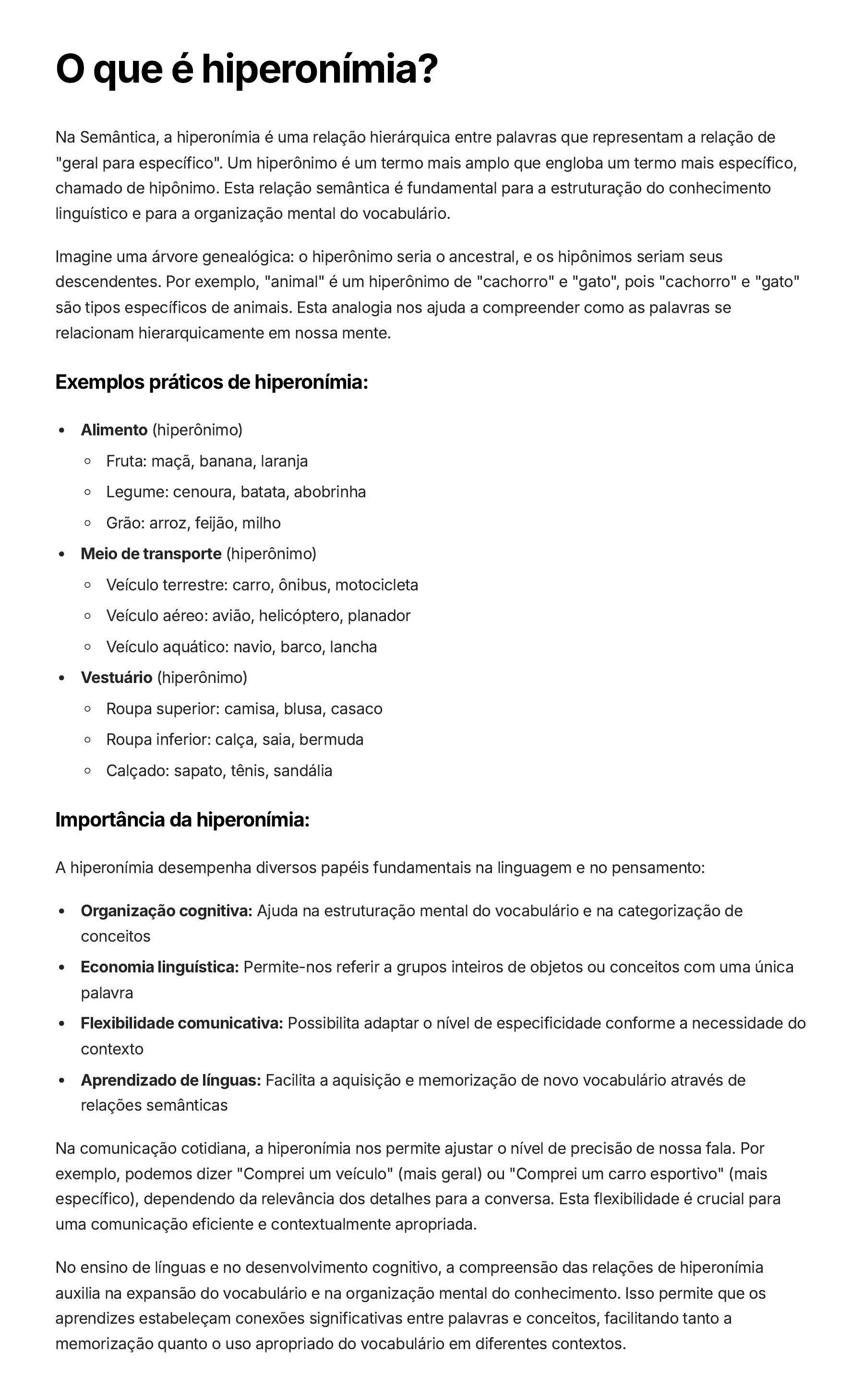 O que é hiperonímia? Na Semântica, a hiperonímia é uma relação hierárquica entre palavras que representam a relação de "geral para específico". Um hiperônimo é um termo mais amplo que engloba um termo mais específico, chamado de hipônimo. Esta relação semântica é fundamental para a estruturação do conhecimento linguístico e para a organização mental do vocabulário. Imagine uma árvore genealógica: o hiperônimo seria o ancestral, e os hipônimos seriam seus descendentes. Por exemplo, "animal" é um hiperônimo de "cachorro" e "gato", pois "cachorro" e "gato" são tipos específicos de animais. Esta analogia nos ajuda a compreender como as palavras se relacionam hierarquicamente em nossa mente. Exemplos práticos de hiperonímia: Alimento (hiperônimo) Fruta: maçã, banana, laranja Legume: cenoura, batata, abobrinha Grão: arroz, feijão, milho Meio de transporte (hiperônimo) Veículo terrestre: carro, ônibus, motocicleta Veículo aéreo: avião, helicóptero, planador Veículo aquático: navio, barco, lancha Vestuário (hiperônimo) Roupa superior: camisa, blusa, casaco Roupa inferior: calça, saia, bermuda Calçado: sapato, tênis, sandália Importância da hiperonímia: A hiperonímia desempenha diversos papéis fundamentais na linguagem e no pensamento: Organização cognitiva: Ajuda na estruturação mental do vocabulário e na categorização de conceitos Economia linguística: Permite-nos referir a grupos inteiros de objetos ou conceitos com uma única palavra Flexibilidade comunicativa: Possibilita adaptar o nível de especificidade conforme a necessidade do contexto Aprendizado de línguas: Facilita a aquisição e memorização de novo vocabulário através de relações semânticas Na comunicação cotidiana, a hiperonímia nos permite ajustar o nível de precisão de nossa fala. Por exemplo, podemos dizer "Comprei um veículo" (mais geral) ou "Comprei um carro esportivo" (mais específico), dependendo da relevância dos detalhes para a conversa. Esta flexibilidade é crucial para uma comunicação eficiente e contextualmente apropriada. No ensino de línguas e no desenvolvimento cognitivo, a compreensão das relações de hiperonímia auxilia na expansão do vocabulário e na organização mental do conhecimento. Isso permite que os aprendizes estabeleçam conexões significativas entre palavras e conceitos, facilitando tanto a memorização quanto o uso apropriado do vocabulário em diferentes contextos.