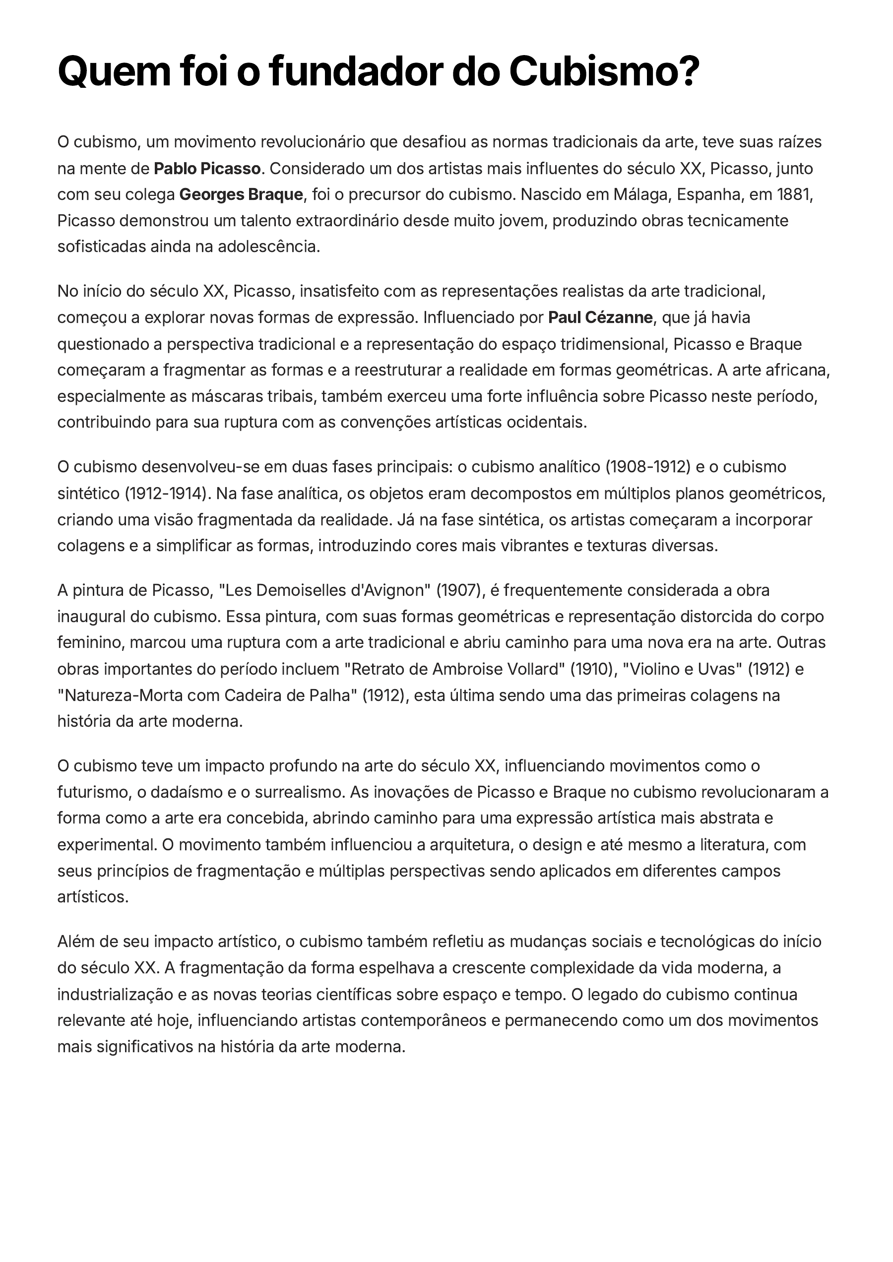 Quem foi o fundador do Cubismo? O cubismo, um movimento revolucionário que desafiou as normas tradicionais da arte, teve suas raízes na mente de Pablo Picasso. Considerado um dos artistas mais influentes do século XX, Picasso, junto com seu colega Georges Braque, foi o precursor do cubismo. Nascido em Málaga, Espanha, em 1881, Picasso demonstrou um talento extraordinário desde muito jovem, produzindo obras tecnicamente sofisticadas ainda na adolescência. No início do século XX, Picasso, insatisfeito com as representações realistas da arte tradicional, começou a explorar novas formas de expressão. Influenciado por Paul Cézanne, que já havia questionado a perspectiva tradicional e a representação do espaço tridimensional, Picasso e Braque começaram a fragmentar as formas e a reestruturar a realidade em formas geométricas. A arte africana, especialmente as máscaras tribais, também exerceu uma forte influência sobre Picasso neste período, contribuindo para sua ruptura com as convenções artísticas ocidentais. O cubismo desenvolveu-se em duas fases principais: o cubismo analítico (1908-1912) e o cubismo sintético (1912-1914). Na fase analítica, os objetos eram decompostos em múltiplos planos geométricos, criando uma visão fragmentada da realidade. Já na fase sintética, os artistas começaram a incorporar colagens e a simplificar as formas, introduzindo cores mais vibrantes e texturas diversas. A pintura de Picasso, "Les Demoiselles d'Avignon" (1907), é frequentemente considerada a obra inaugural do cubismo. Essa pintura, com suas formas geométricas e representação distorcida do corpo feminino, marcou uma ruptura com a arte tradicional e abriu caminho para uma nova era na arte. Outras obras importantes do período incluem "Retrato de Ambroise Vollard" (1910), "Violino e Uvas" (1912) e "Natureza-Morta com Cadeira de Palha" (1912), esta última sendo uma das primeiras colagens na história da arte moderna. O cubismo teve um impacto profundo na arte do século XX, influenciando movimentos como o futurismo, o dadaísmo e o surrealismo. As inovações de Picasso e Braque no cubismo revolucionaram a forma como a arte era concebida, abrindo caminho para uma expressão artística mais abstrata e experimental. O movimento também influenciou a arquitetura, o design e até mesmo a literatura, com seus princípios de fragmentação e múltiplas perspectivas sendo aplicados em diferentes campos artísticos. Além de seu impacto artístico, o cubismo também refletiu as mudanças sociais e tecnológicas do início do século XX. A fragmentação da forma espelhava a crescente complexidade da vida moderna, a industrialização e as novas teorias científicas sobre espaço e tempo. O legado do cubismo continua relevante até hoje, influenciando artistas contemporâneos e permanecendo como um dos movimentos mais significativos na história da arte moderna.