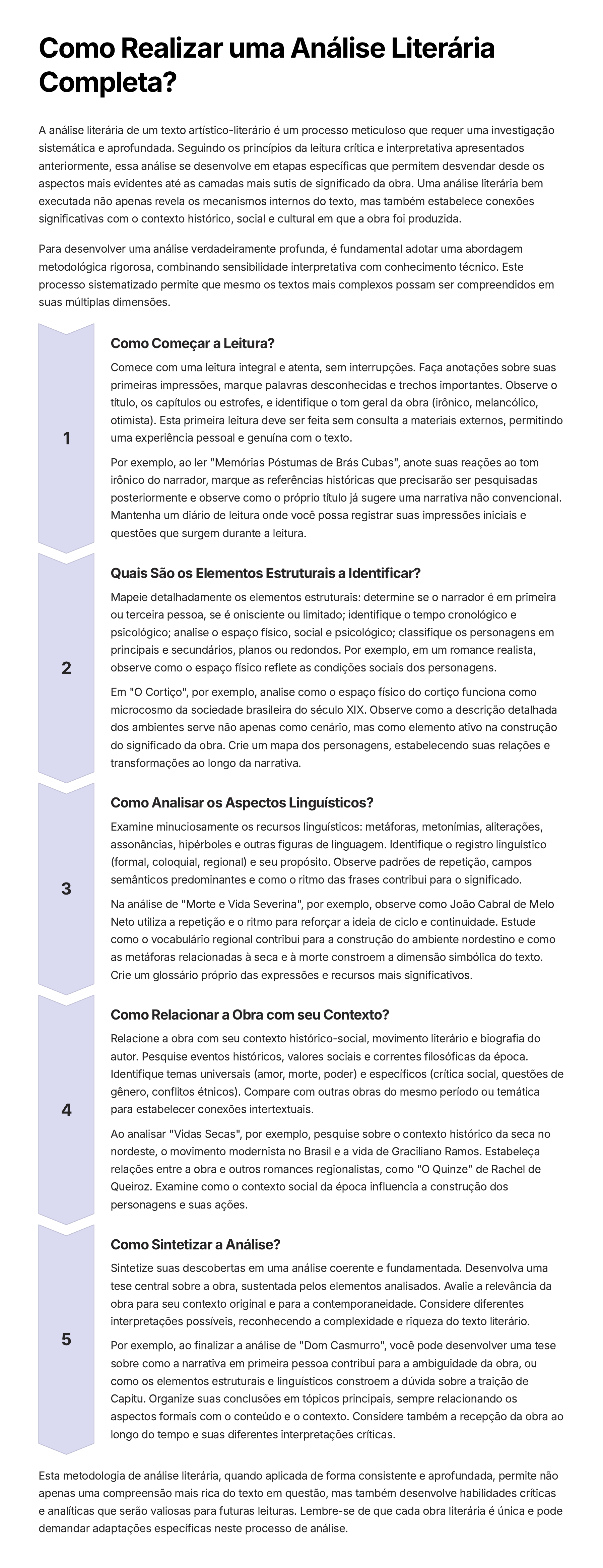 Como Realizar uma Análise Literária Completa? A análise literária de um texto artístico-literário é um processo meticuloso que requer uma investigação sistemática e aprofundada. Seguindo os princípios da leitura crítica e interpretativa apresentados anteriormente, essa análise se desenvolve em etapas específicas que permitem desvendar desde os aspectos mais evidentes até as camadas mais sutis de significado da obra. Uma análise literária bem executada não apenas revela os mecanismos internos do texto, mas também estabelece conexões significativas com o contexto histórico, social e cultural em que a obra foi produzida. Para desenvolver uma análise verdadeiramente profunda, é fundamental adotar uma abordagem metodológica rigorosa, combinando sensibilidade interpretativa com conhecimento técnico. Este processo sistematizado permite que mesmo os textos mais complexos possam ser compreendidos em suas múltiplas dimensões. 1 Como Começar a Leitura? Comece com uma leitura integral e atenta, sem interrupções. Faça anotações sobre suas primeiras impressões, marque palavras desconhecidas e trechos importantes. Observe o título, os capítulos ou estrofes, e identifique o tom geral da obra (irônico, melancólico, otimista). Esta primeira leitura deve ser feita sem consulta a materiais externos, permitindo uma experiência pessoal e genuína com o texto. Por exemplo, ao ler "Memórias Póstumas de Brás Cubas", anote suas reações ao tom irônico do narrador, marque as referências históricas que precisarão ser pesquisadas posteriormente e observe como o próprio título já sugere uma narrativa não convencional. Mantenha um diário de leitura onde você possa registrar suas impressões iniciais e questões que surgem durante a leitura. 2 Quais São os Elementos Estruturais a Identificar? Mapeie detalhadamente os elementos estruturais: determine se o narrador é em primeira ou terceira pessoa, se é onisciente ou limitado; identifique o tempo cronológico e psicológico; analise o espaço físico, social e psicológico; classifique os personagens em principais e secundários, planos ou redondos. Por exemplo, em um romance realista, observe como o espaço físico reflete as condições sociais dos personagens. Em "O Cortiço", por exemplo, analise como o espaço físico do cortiço funciona como microcosmo da sociedade brasileira do século XIX. Observe como a descrição detalhada dos ambientes serve não apenas como cenário, mas como elemento ativo na construção do significado da obra. Crie um mapa dos personagens, estabelecendo suas relações e transformações ao longo da narrativa. 3 Como Analisar os Aspectos Linguísticos? Examine minuciosamente os recursos linguísticos: metáforas, metonímias, aliterações, assonâncias, hipérboles e outras figuras de linguagem. Identifique o registro linguístico (formal, coloquial, regional) e seu propósito. Observe padrões de repetição, campos semânticos predominantes e como o ritmo das frases contribui para o significado. Na análise de "Morte e Vida Severina", por exemplo, observe como João Cabral de Melo Neto utiliza a repetição e o ritmo para reforçar a ideia de ciclo e continuidade. Estude como o vocabulário regional contribui para a construção do ambiente nordestino e como as metáforas relacionadas à seca e à morte constroem a dimensão simbólica do texto. Crie um glossário próprio das expressões e recursos mais significativos. 4 Como Relacionar a Obra com seu Contexto? Relacione a obra com seu contexto histórico-social, movimento literário e biografia do autor. Pesquise eventos históricos, valores sociais e correntes filosóficas da época. Identifique temas universais (amor, morte, poder) e específicos (crítica social, questões de gênero, conflitos étnicos). Compare com outras obras do mesmo período ou temática para estabelecer conexões intertextuais. Ao analisar "Vidas Secas", por exemplo, pesquise sobre o contexto histórico da seca no nordeste, o movimento modernista no Brasil e a vida de Graciliano Ramos. Estabeleça relações entre a obra e outros romances regionalistas, como "O Quinze" de Rachel de Queiroz. Examine como o contexto social da época influencia a construção dos personagens e suas ações. 5 Como Sintetizar a Análise? Sintetize suas descobertas em uma análise coerente e fundamentada. Desenvolva uma tese central sobre a obra, sustentada pelos elementos analisados. Avalie a relevância da obra para seu contexto original e para a contemporaneidade. Considere diferentes interpretações possíveis, reconhecendo a complexidade e riqueza do texto literário. Por exemplo, ao finalizar a análise de "Dom Casmurro", você pode desenvolver uma tese sobre como a narrativa em primeira pessoa contribui para a ambiguidade da obra, ou como os elementos estruturais e linguísticos constroem a dúvida sobre a traição de Capitu. Organize suas conclusões em tópicos principais, sempre relacionando os aspectos formais com o conteúdo e o contexto. Considere também a recepção da obra ao longo do tempo e suas diferentes interpretações críticas. Esta metodologia de análise literária, quando aplicada de forma consistente e aprofundada, permite não apenas uma compreensão mais rica do texto em questão, mas também desenvolve habilidades críticas e analíticas que serão valiosas para futuras leituras. Lembre-se de que cada obra literária é única e pode demandar adaptações específicas neste processo de análise.