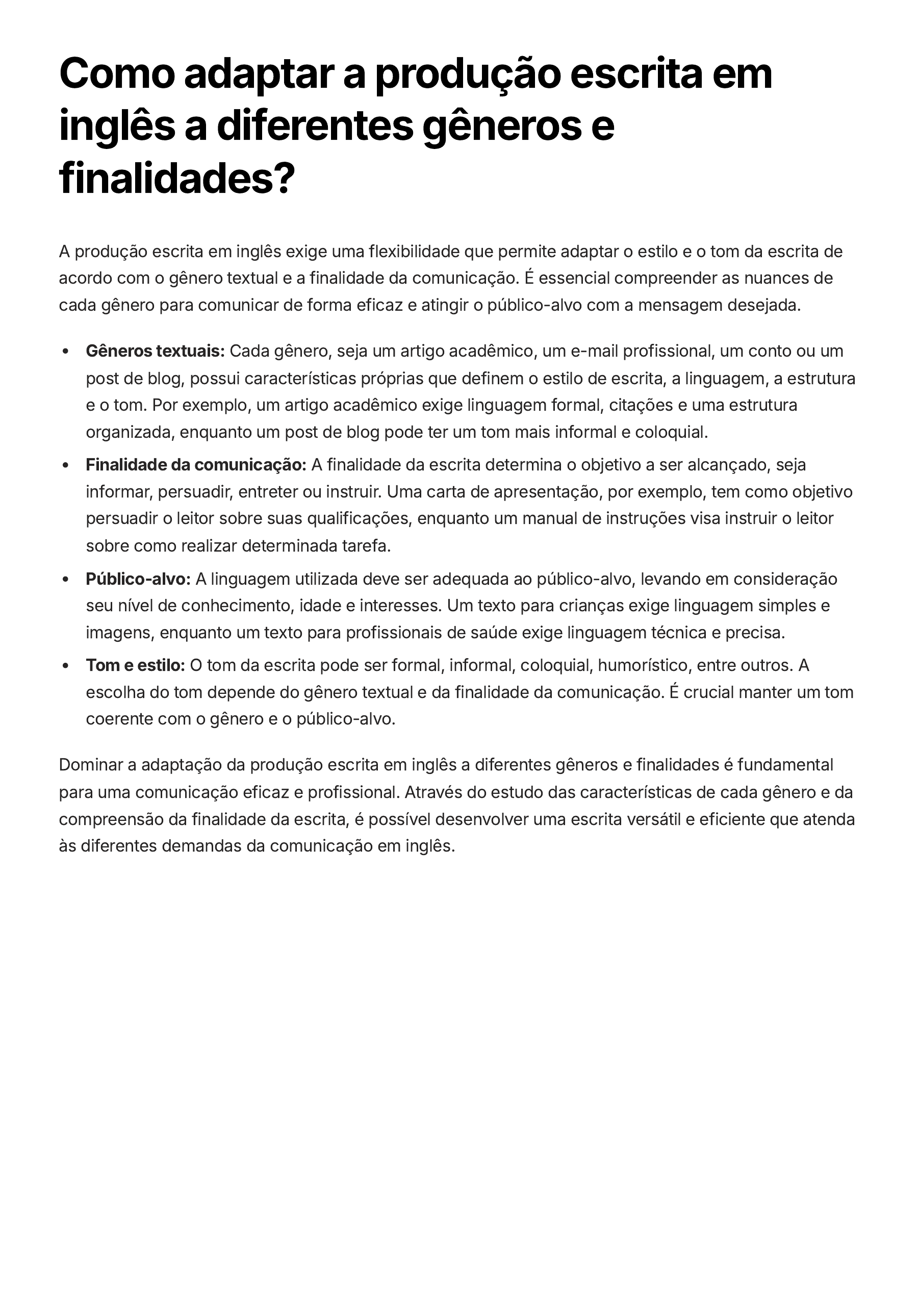 Como adaptar a produção escrita em inglês a diferentes gêneros e finalidades? A produção escrita em inglês exige uma flexibilidade que permite adaptar o estilo e o tom da escrita de acordo com o gênero textual e a finalidade da comunicação. É essencial compreender as nuances de cada gênero para comunicar de forma eficaz e atingir o público-alvo com a mensagem desejada. Gêneros textuais: Cada gênero, seja um artigo acadêmico, um e-mail profissional, um conto ou um post de blog, possui características próprias que definem o estilo de escrita, a linguagem, a estrutura e o tom. Por exemplo, um artigo acadêmico exige linguagem formal, citações e uma estrutura organizada, enquanto um post de blog pode ter um tom mais informal e coloquial. Finalidade da comunicação: A finalidade da escrita determina o objetivo a ser alcançado, seja informar, persuadir, entreter ou instruir. Uma carta de apresentação, por exemplo, tem como objetivo persuadir o leitor sobre suas qualificações, enquanto um manual de instruções visa instruir o leitor sobre como realizar determinada tarefa. Público-alvo: A linguagem utilizada deve ser adequada ao público-alvo, levando em consideração seu nível de conhecimento, idade e interesses. Um texto para crianças exige linguagem simples e imagens, enquanto um texto para profissionais de saúde exige linguagem técnica e precisa. Tom e estilo: O tom da escrita pode ser formal, informal, coloquial, humorístico, entre outros. A escolha do tom depende do gênero textual e da finalidade da comunicação. É crucial manter um tom coerente com o gênero e o público-alvo. Dominar a adaptação da produção escrita em inglês a diferentes gêneros e finalidades é fundamental para uma comunicação eficaz e profissional. Através do estudo das características de cada gênero e da compreensão da finalidade da escrita, é possível desenvolver uma escrita versátil e eficiente que atenda às diferentes demandas da comunicação em inglês. Como Desenvolver a Criatividade na Escrita em Língua Inglesa? Desenvolver a criatividade na escrita em língua inglesa é uma jornada emocionante que exige um mergulho profundo na linguagem, na cultura e na própria imaginação. Para liberar o potencial criativo, algumas estratégias podem ser implementadas: Explorar Novos Mundos e Perspectivas Mergulhe em diferentes gêneros literários, como ficção científica, fantasia, poesia ou drama, e explore como autores renomados constroem mundos únicos e personagens cativantes. A leitura de autores internacionais de diferentes culturas e épocas amplia o repertório linguístico e inspira novas ideias. Liberar a Imaginação com Exercícios Criativos Exercícios simples como escrever poemas, contos curtos, ou até mesmo criar listas de palavras que evoquem sensações e imagens podem estimular a criatividade. A prática regular é essencial para desenvolver o hábito de pensar e escrever de forma criativa. Cultivar a Curiosidade e a Observação O mundo ao redor é uma fonte inesgotável de inspiração! Preste atenção aos detalhes, explore diferentes ambientes, converse com pessoas de diferentes backgrounds e absorva as nuances da vida. As experiências, grandes ou pequenas, alimentam a criatividade e enriquecem a escrita. É importante lembrar que a criatividade não surge do nada. É um processo que exige dedicação, persistência e a vontade de experimentar, errar e recomeçar. Use as ferramentas e estratégias mencionadas acima para cultivar sua criatividade na escrita em língua inglesa e deixe sua voz ser ouvida no mundo! Ferramentas Digitais Essenciais para a Produção Escrita em Inglês A era digital oferece um arsenal de ferramentas que podem auxiliar significativamente na produção escrita em inglês. Essas ferramentas vão desde dicionários e tradutores online até plataformas de edição de texto e verificação gramatical, facilitando o processo de escrita e aprimorando a qualidade dos seus textos. Quais são os Melhores Dicionários e Tradutores Online? Google Translate Oxford Dictionaries Merriam-Webster Dictionary Cambridge Dictionary Esses recursos oferecem definições precisas, exemplos de uso e tradução para diversas línguas, garantindo a precisão do vocabulário e a comunicação eficaz. Quais Plataformas de Edição de Texto Utilizar? Google Docs Microsoft Word Grammarly ProWritingAid Essas plataformas permitem formatar o texto, inserir imagens e tabelas, além de oferecer recursos avançados de edição, como verificação gramatical e ortográfica. Como Verificar a Gramática e Ortografia? Grammarly ProWritingAid Hemingway Editor LanguageTool Esses verificadores detectam erros gramaticais, ortográficos e de estilo, auxiliando na produção de textos impecáveis e livres de falhas. Onde Aprender e Praticar Inglês Online? Duolingo Babbel Memrise EnglishCentral Essas plataformas oferecem cursos completos de inglês, desde o básico até o avançado, com foco na prática de escrita e comunicação. Além dessas ferramentas básicas, existem outras opções especializadas para diferentes necessidades, como recursos de pesquisa acadêmica, bancos de dados de imagens e ferramentas de criação de conteúdo multimídia. O uso estratégico dessas ferramentas digitais pode otimizar o processo de produção escrita em inglês, tornando-o mais eficiente e eficaz.