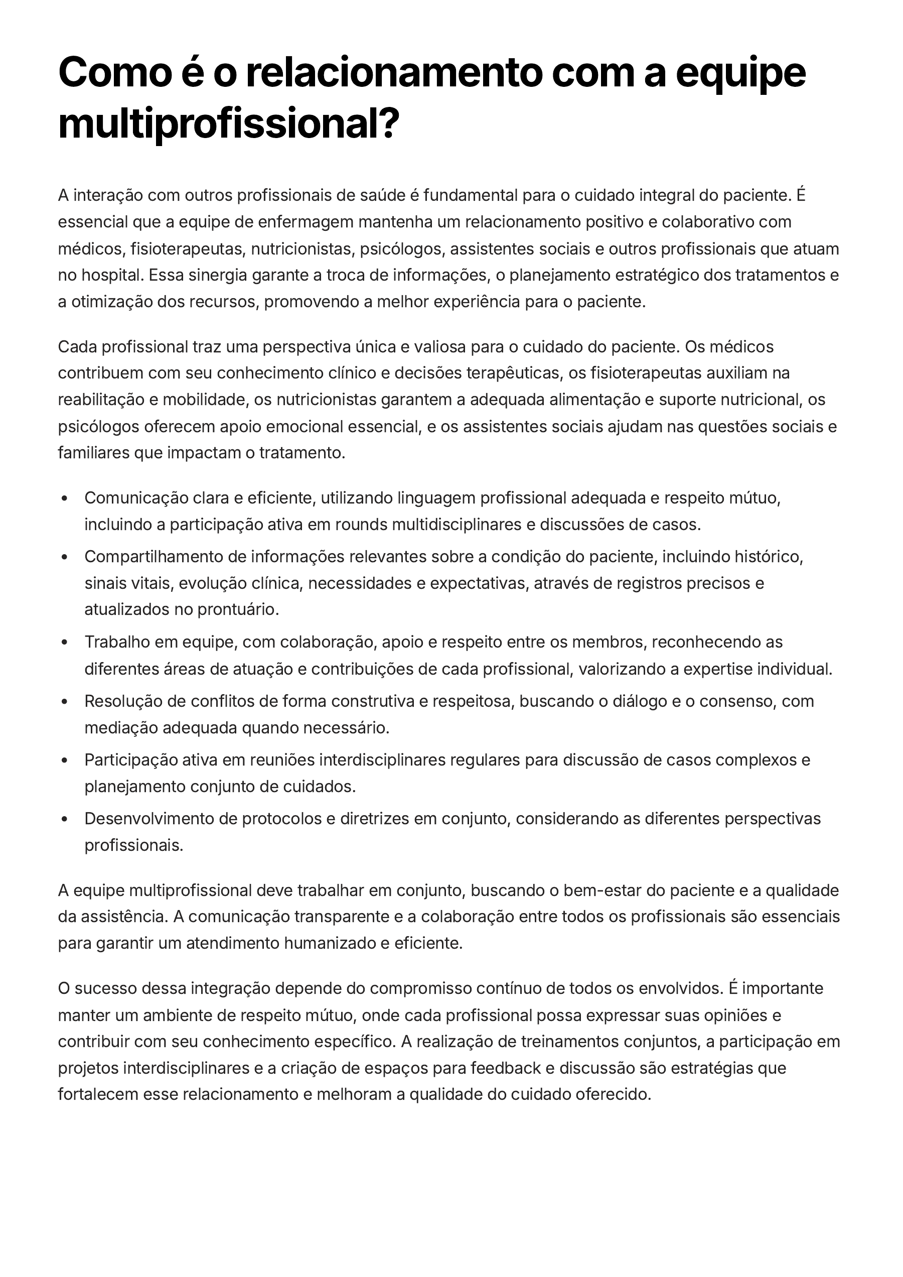 Como é o relacionamento com a equipe multiprofissional? A interação com outros profissionais de saúde é fundamental para o cuidado integral do paciente. É essencial que a equipe de enfermagem mantenha um relacionamento positivo e colaborativo com médicos, fisioterapeutas, nutricionistas, psicólogos, assistentes sociais e outros profissionais que atuam no hospital. Essa sinergia garante a troca de informações, o planejamento estratégico dos tratamentos e a otimização dos recursos, promovendo a melhor experiência para o paciente. Cada profissional traz uma perspectiva única e valiosa para o cuidado do paciente. Os médicos contribuem com seu conhecimento clínico e decisões terapêuticas, os fisioterapeutas auxiliam na reabilitação e mobilidade, os nutricionistas garantem a adequada alimentação e suporte nutricional, os psicólogos oferecem apoio emocional essencial, e os assistentes sociais ajudam nas questões sociais e familiares que impactam o tratamento. Comunicação clara e eficiente, utilizando linguagem profissional adequada e respeito mútuo, incluindo a participação ativa em rounds multidisciplinares e discussões de casos. Compartilhamento de informações relevantes sobre a condição do paciente, incluindo histórico, sinais vitais, evolução clínica, necessidades e expectativas, através de registros precisos e atualizados no prontuário. Trabalho em equipe, com colaboração, apoio e respeito entre os membros, reconhecendo as diferentes áreas de atuação e contribuições de cada profissional, valorizando a expertise individual. Resolução de conflitos de forma construtiva e respeitosa, buscando o diálogo e o consenso, com mediação adequada quando necessário. Participação ativa em reuniões interdisciplinares regulares para discussão de casos complexos e planejamento conjunto de cuidados. Desenvolvimento de protocolos e diretrizes em conjunto, considerando as diferentes perspectivas profissionais. A equipe multiprofissional deve trabalhar em conjunto, buscando o bem-estar do paciente e a qualidade da assistência. A comunicação transparente e a colaboração entre todos os profissionais são essenciais para garantir um atendimento humanizado e eficiente. O sucesso dessa integração depende do compromisso contínuo de todos os envolvidos. É importante manter um ambiente de respeito mútuo, onde cada profissional possa expressar suas opiniões e contribuir com seu conhecimento específico. A realização de treinamentos conjuntos, a participação em projetos interdisciplinares e a criação de espaços para feedback e discussão são estratégias que fortalecem esse relacionamento e melhoram a qualidade do cuidado oferecido.